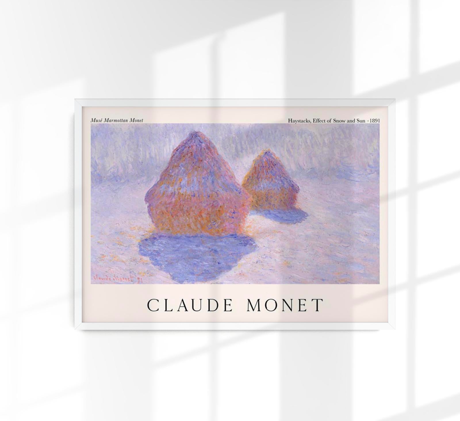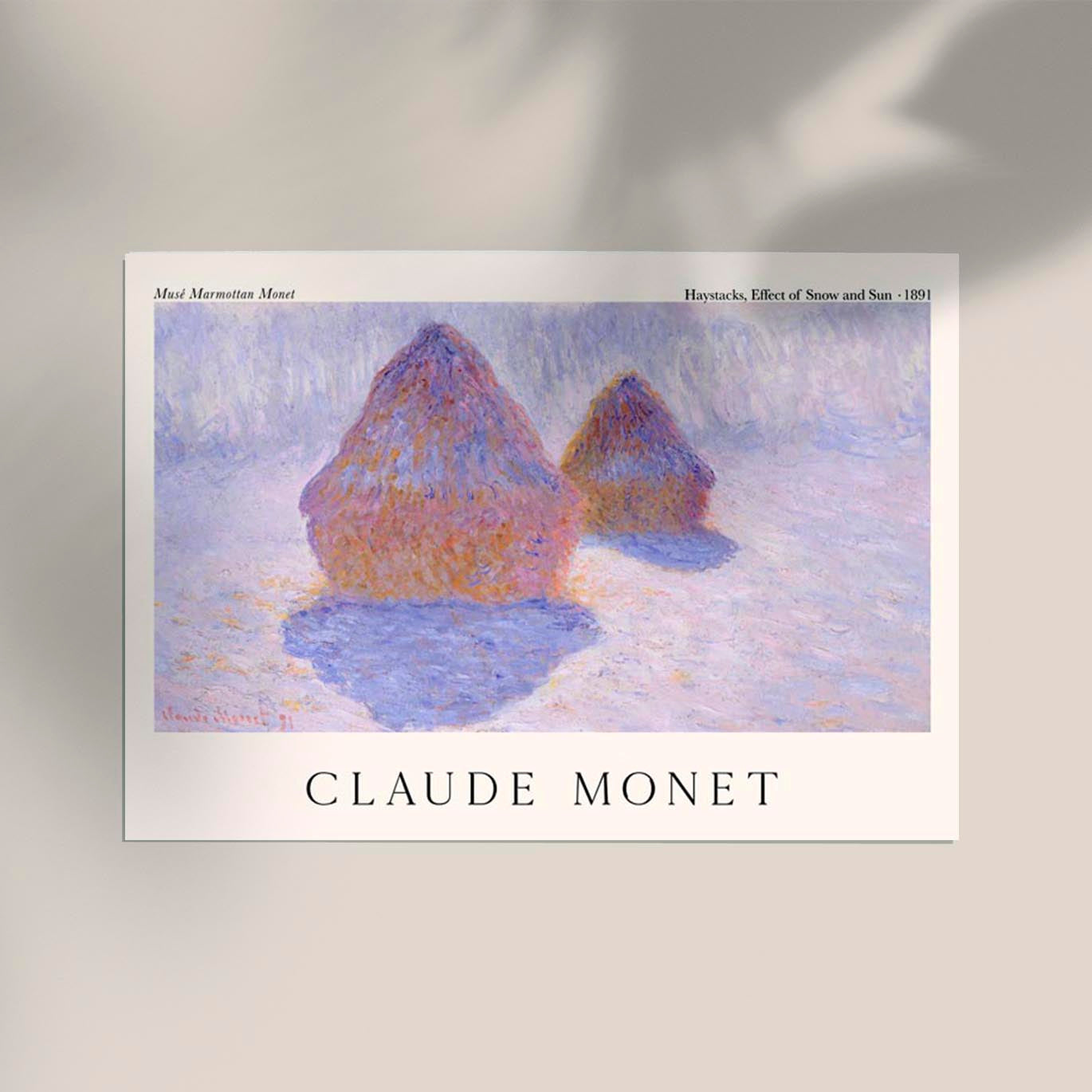 Das Haystacks, Effect of Snow and Sun by Claude Monet Exhibition Poster zeigt eines der ikonischsten Motive des Impressionismus in seiner winterlichen Schönheit. Monet fängt in diesem Werk das magische Zusammenspiel von Sonnenlicht und Schnee auf Heuhaufen ein – ein Spiel aus Reflexion, Farbtemperatur und Atmosphäre, das seine unverwechselbare Meisterschaft der Lichtmalerei verkörpert. Dieses Fine Art Print bringt die Ruhe und Tiefe der französischen Landschaft in Ihr Zuhause.