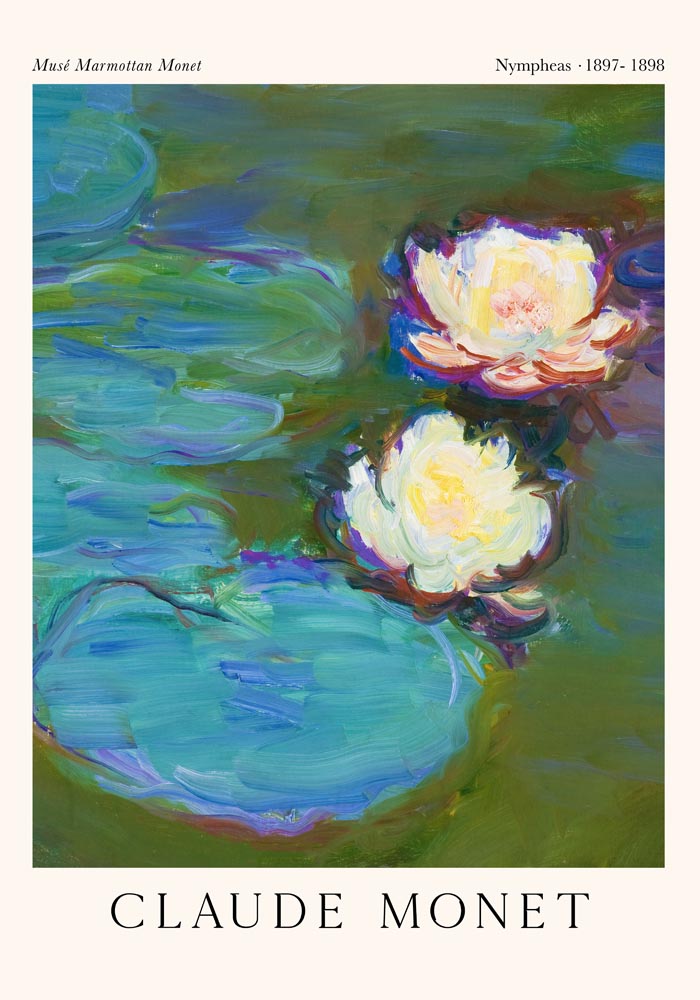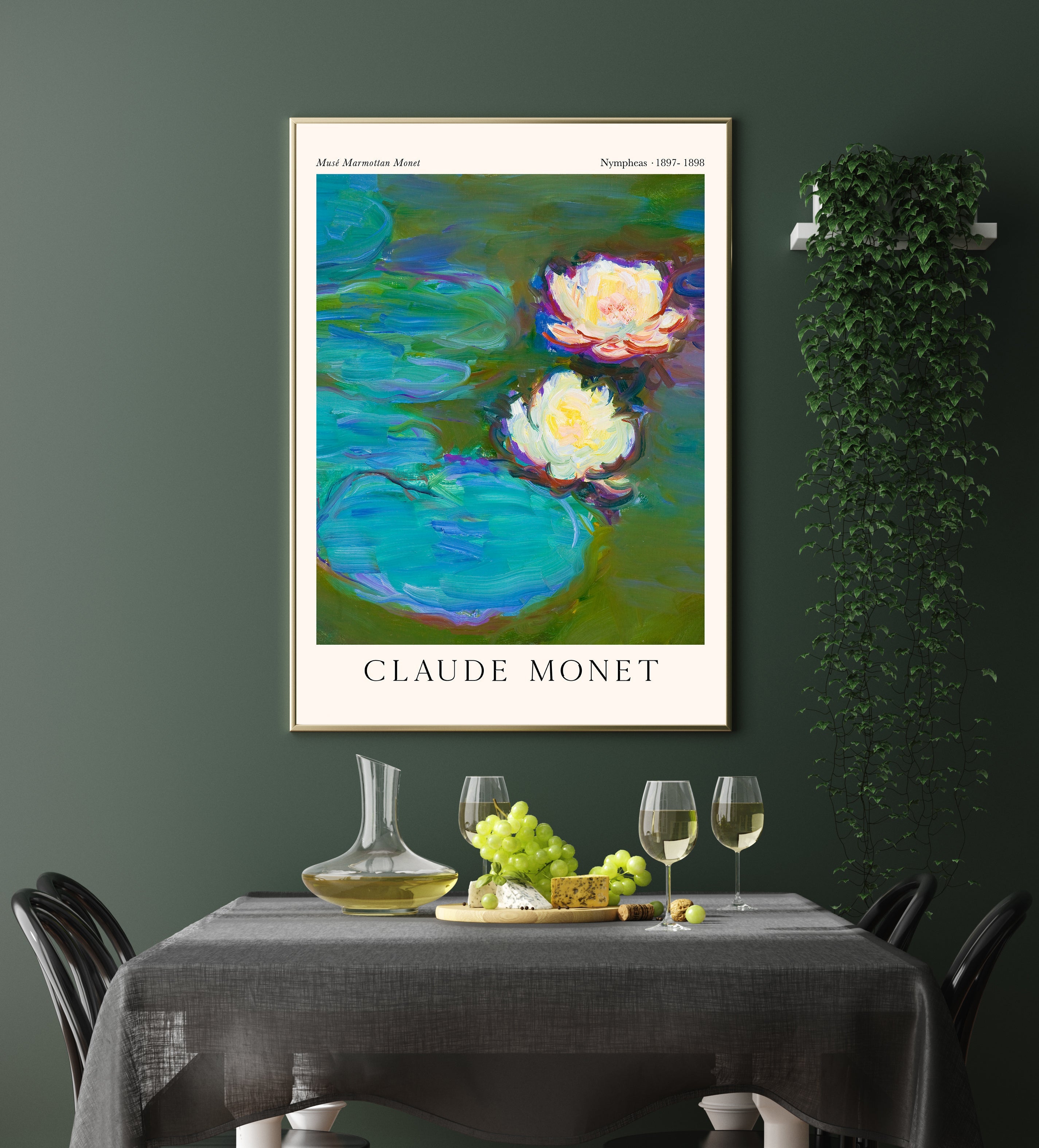 Das Nymphea Vertical by Claude Monet Exhibition Poster zeigt eine eindrucksvolle vertikale Ansicht aus Monets berühmter Seerosen-Serie. Martin setzt gekonnt die lebendigen, farbintensiven Wasserlinsen in den Fokus, eingebettet in Spiegelungen und Lichtreflexe, die die fließende Bewegung des Gartenteichs einfangen.