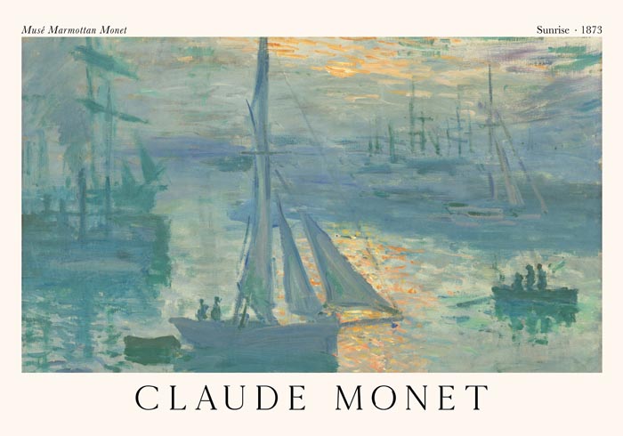 Das Sunrise by Claude Monet Exhibition Poster bringt die berühmte Impression des Sonnenaufgangs in dein Zuhause – ein Sinnbild für Licht, Farbe und Bewegung, meisterhaft reproduziert mit feinster Drucktechnik aus Berlin.