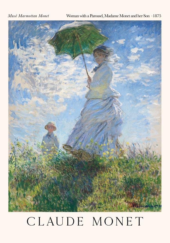 Das Woman with a Parasol – Madame Monet and Her Son Exhibition Poster bringt Claude Monets zarte Impressionen von Licht, Wind und Bewegung in dein Zuhause. Dieses ikonische Gemälde aus dem Jahr 1875 zeigt Madame Monet und ihren Sohn Jean in sommerlicher Leichtigkeit – ein Sinnbild für Monets unverwechselbares Spiel aus Farbe und Atmosphäre.