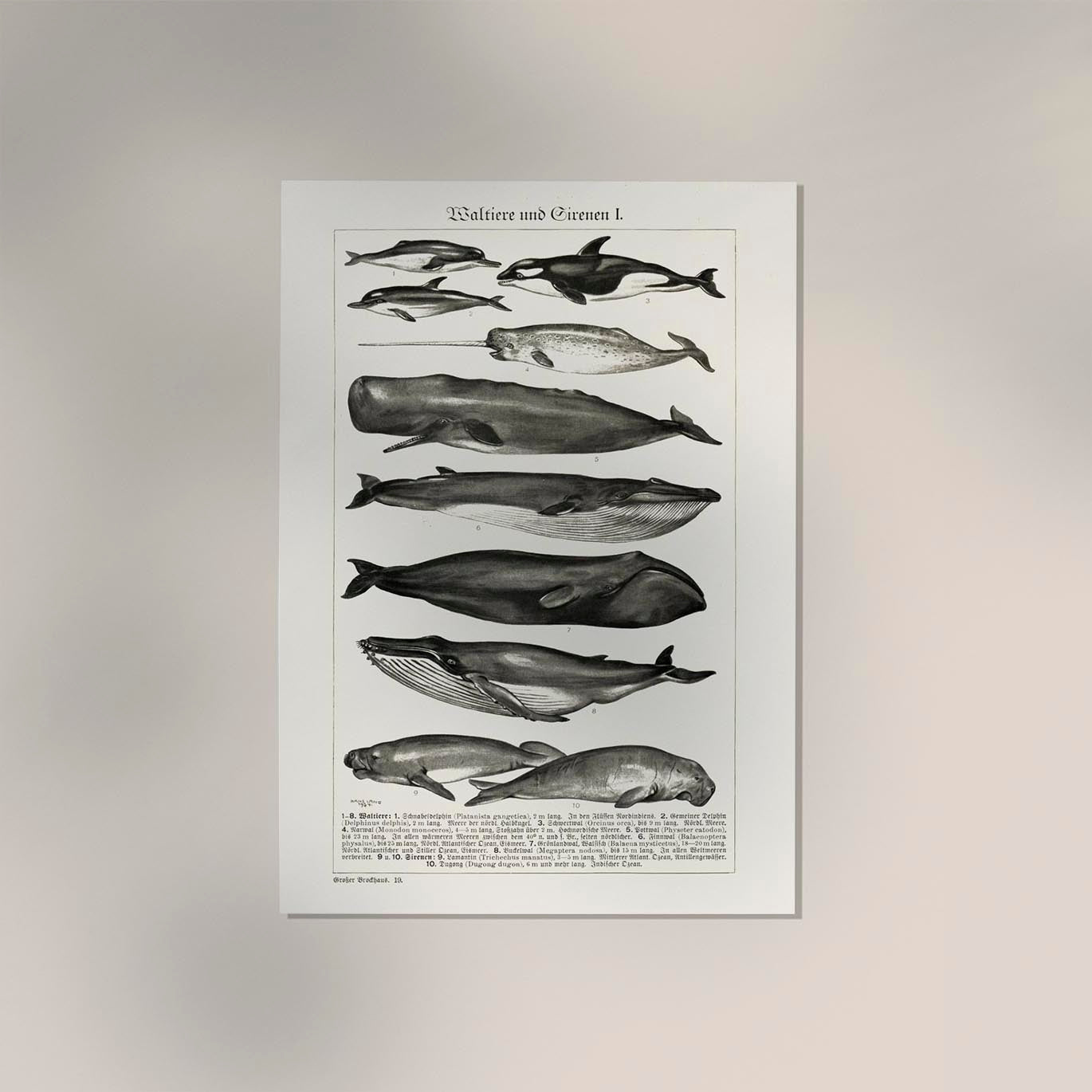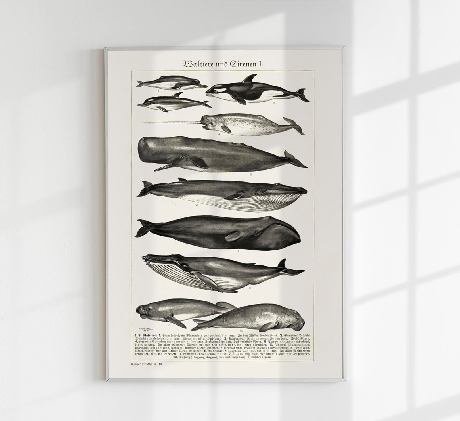 Das Whales Chart Nr. 1 German Antique Print ist eine kunstvolle Reproduktion einer deutschen Naturstudie aus dem 19. Jahrhundert. Es zeigt verschiedene Walarten in klassisch-detaillierter Darstellung und bringt die Ästhetik alter zoologischer Tafeln in dein Zuhause – ein Stück Wissenschaftsgeschichte in Fine-Art-Qualität.