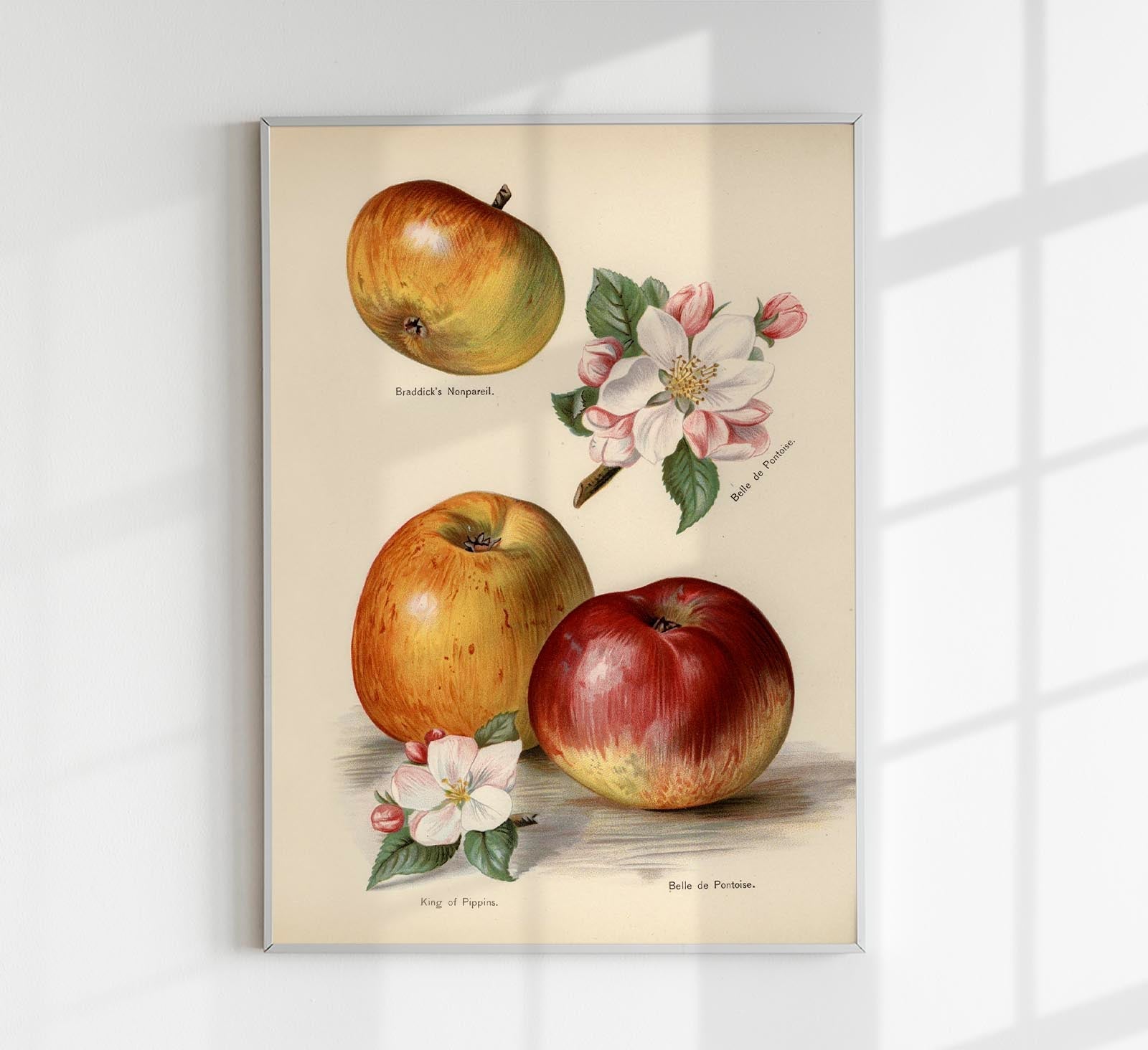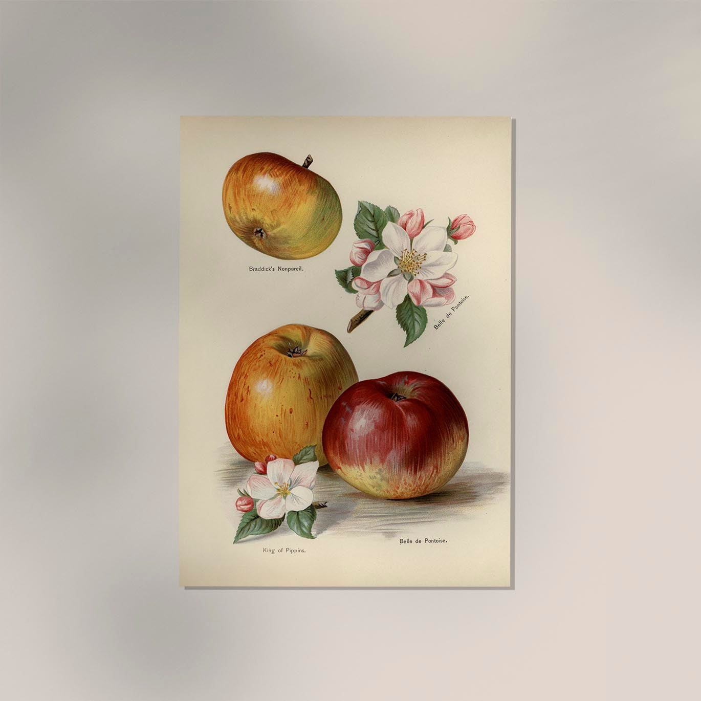 Das Belle de Pontoise Apples Fruit Poster zeigt die traditionelle Apfelsorte „Belle de Pontoise“ in einer naturkundlichen Darstellung – fein modellierte Schalen, zarte Lichter und charakteristische Rot‑/Grünnuancen in ausgewogener Komposition.