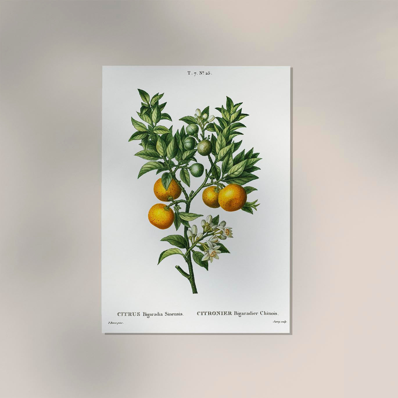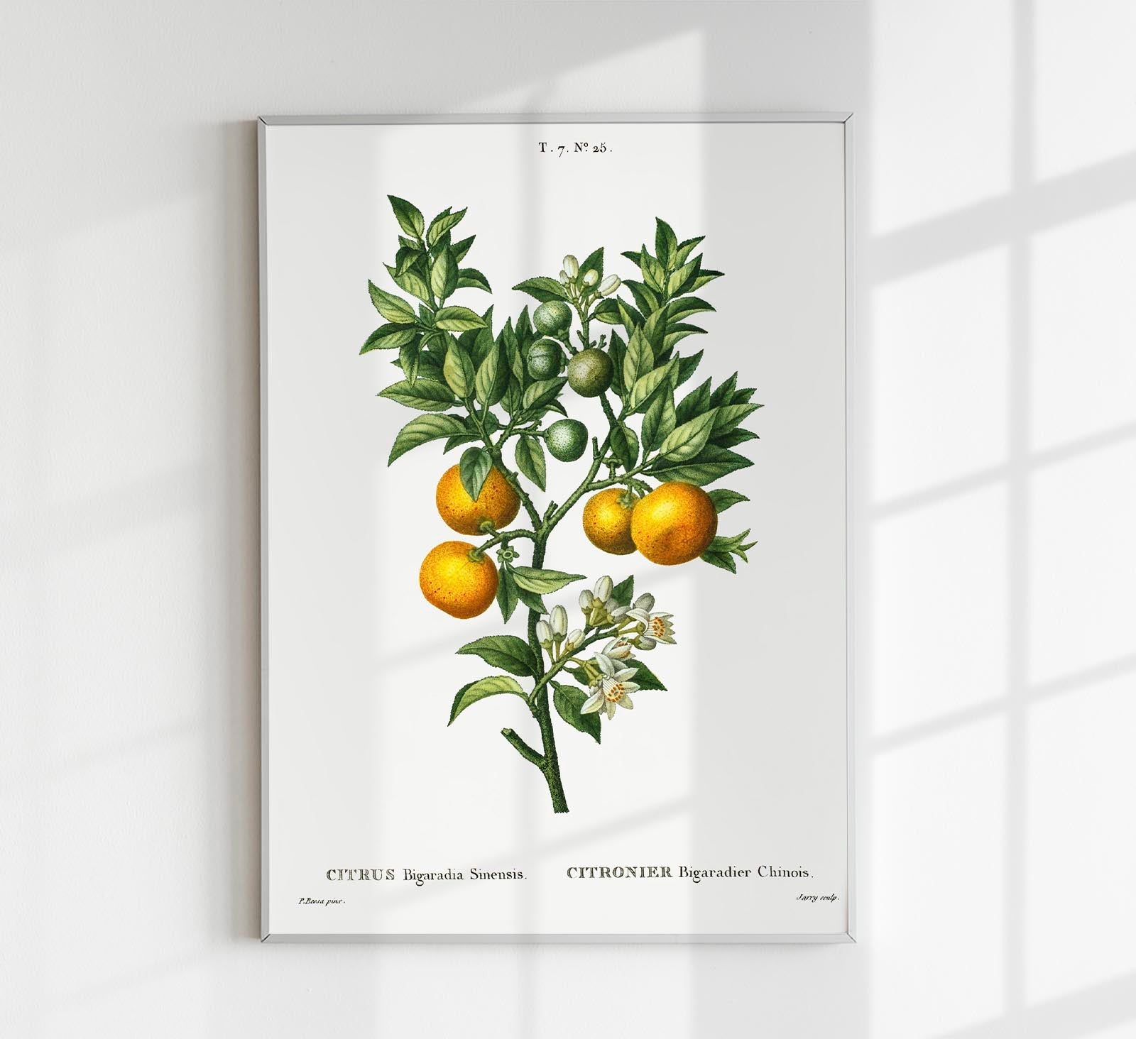 Das Bitter Orange Botanical Poster zeigt Zweige, Blüten und Früchte der Bitterorange in präziser botanischer Darstellung – ideal als kulinarischer Akzent für Küche, Essbereich oder Café.