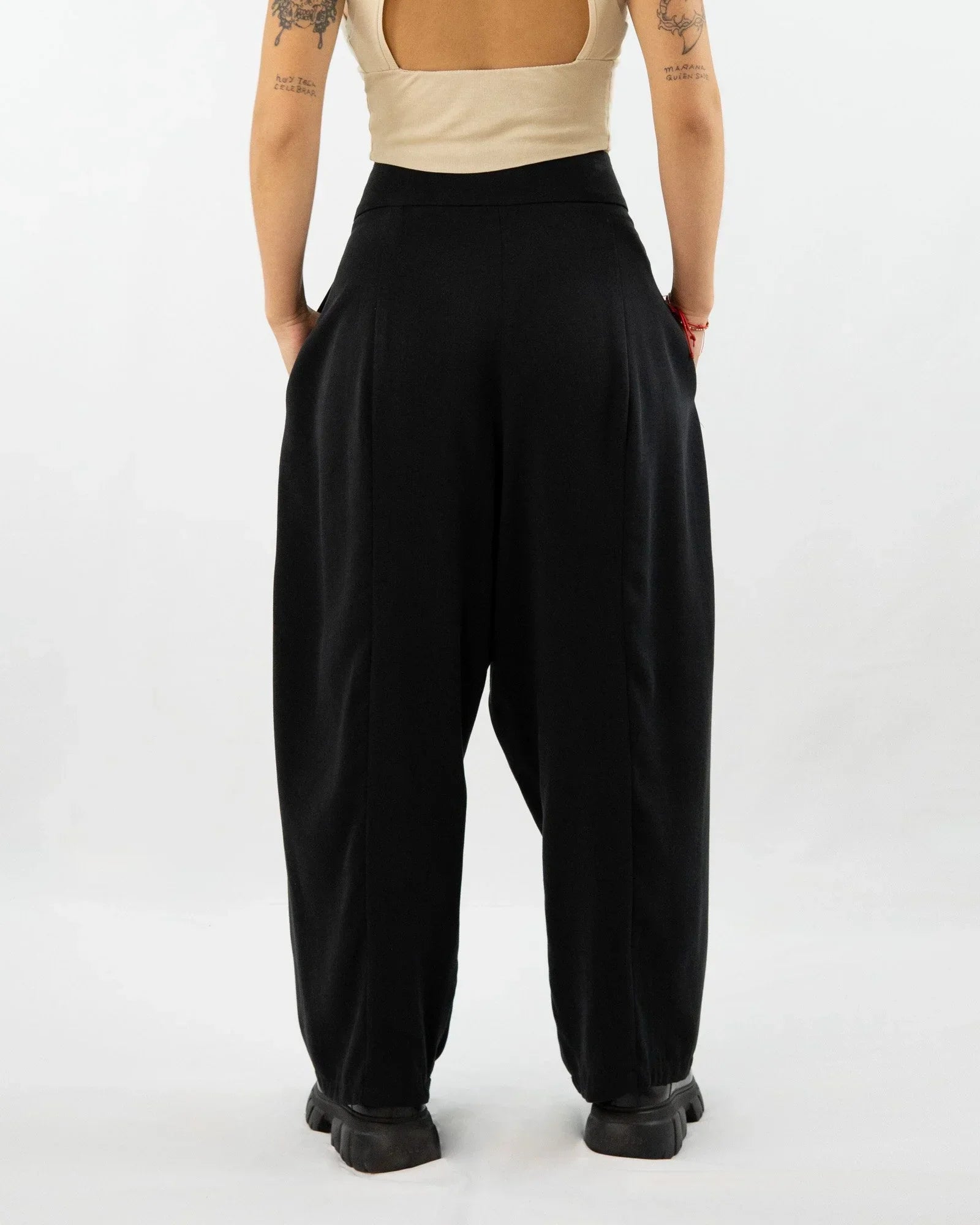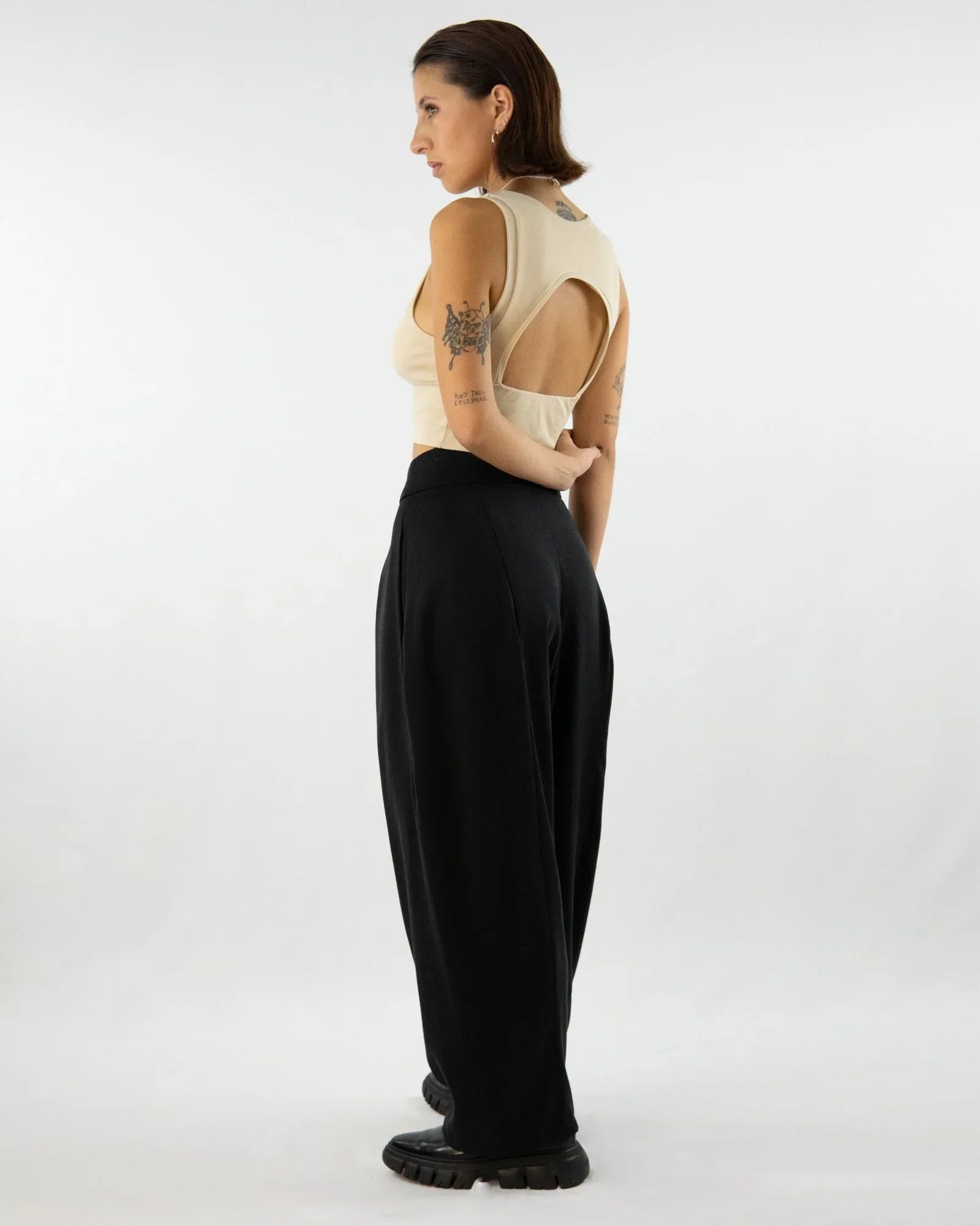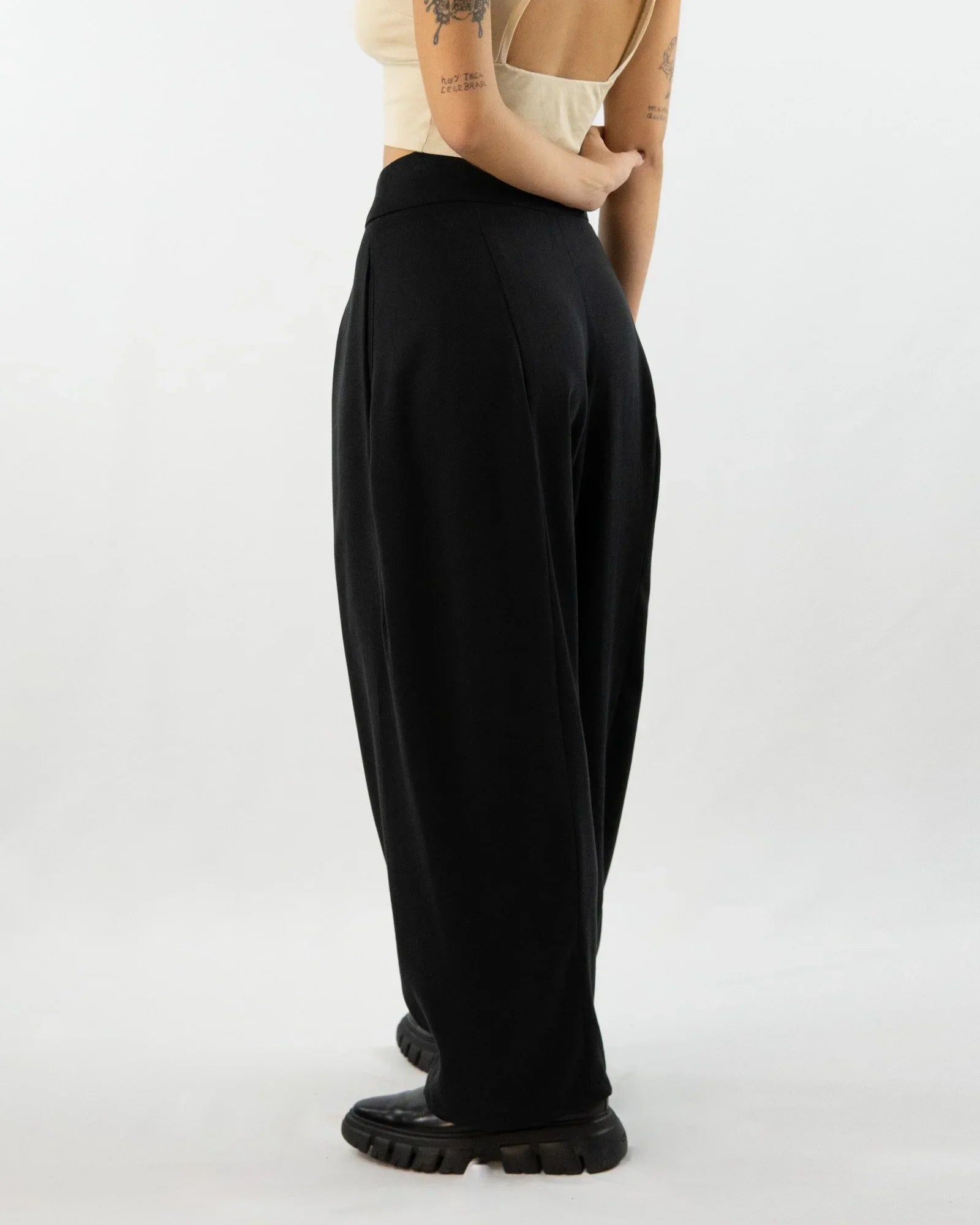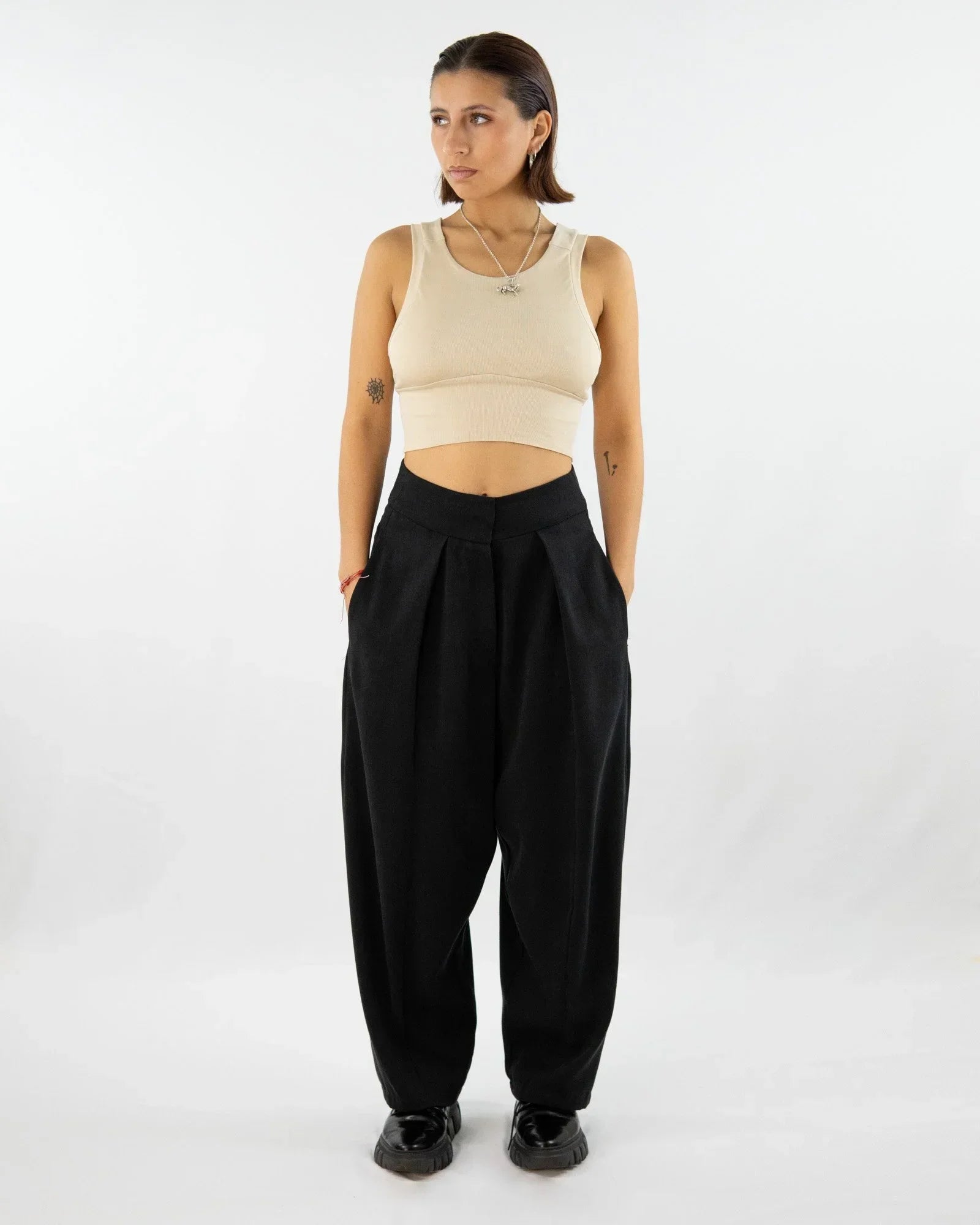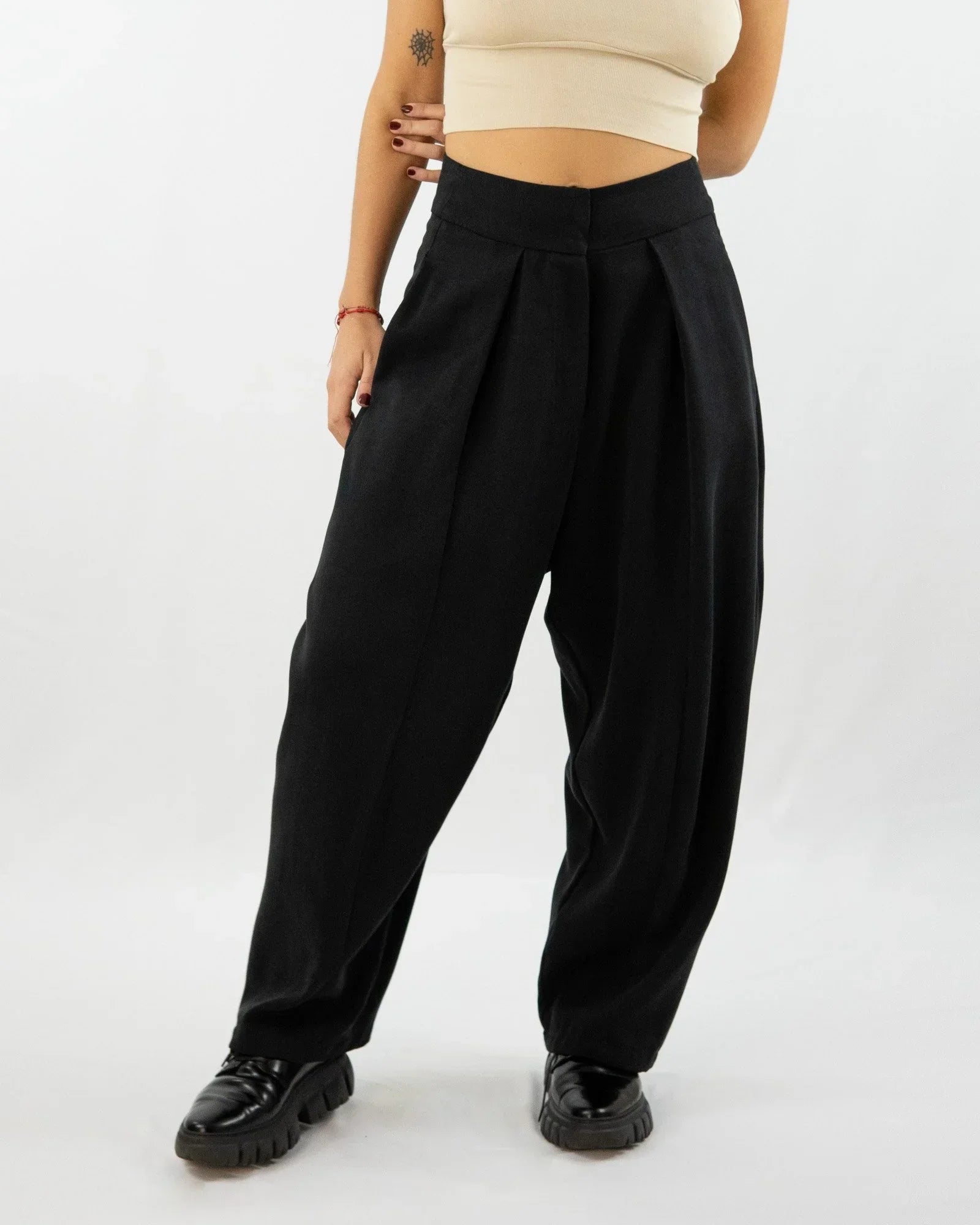 Die Bundfaltenhose AdoPLI formt mit ihrem hohen Bund und dem locker fallenden Bein eine souveräne Silhouette. Die geschwungenen Teilungsnähte und dezenten Falten sorgen für architektonische Klarheit mit femininer Note – reduziert, aber nie beliebig.