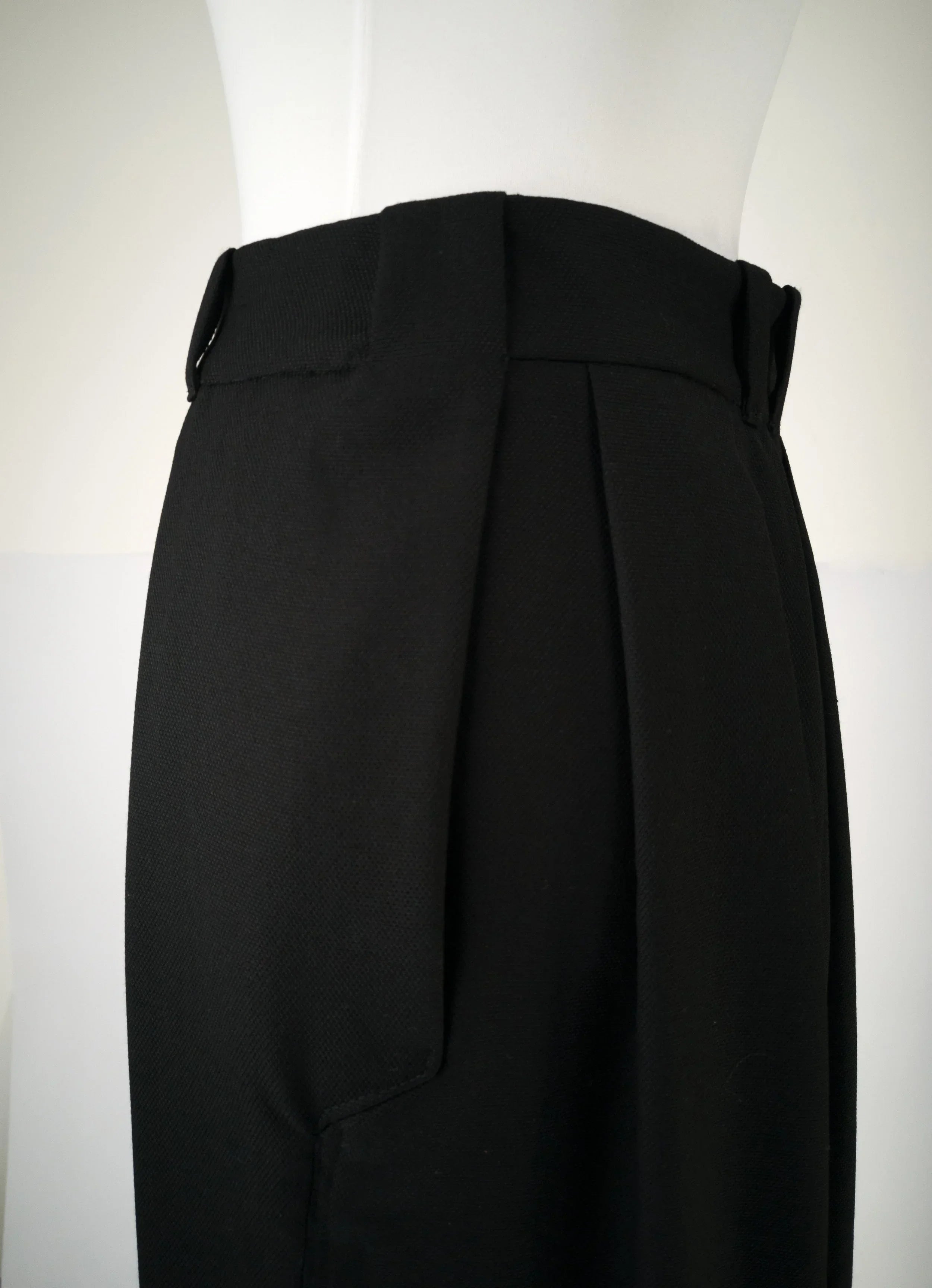 Die weite, fließende Silhouette und die verlegten Tascheneingriffe, die zugleich als Gürtelschlaufen fungieren, unterstreichen das architektonische Design dieser Hose.