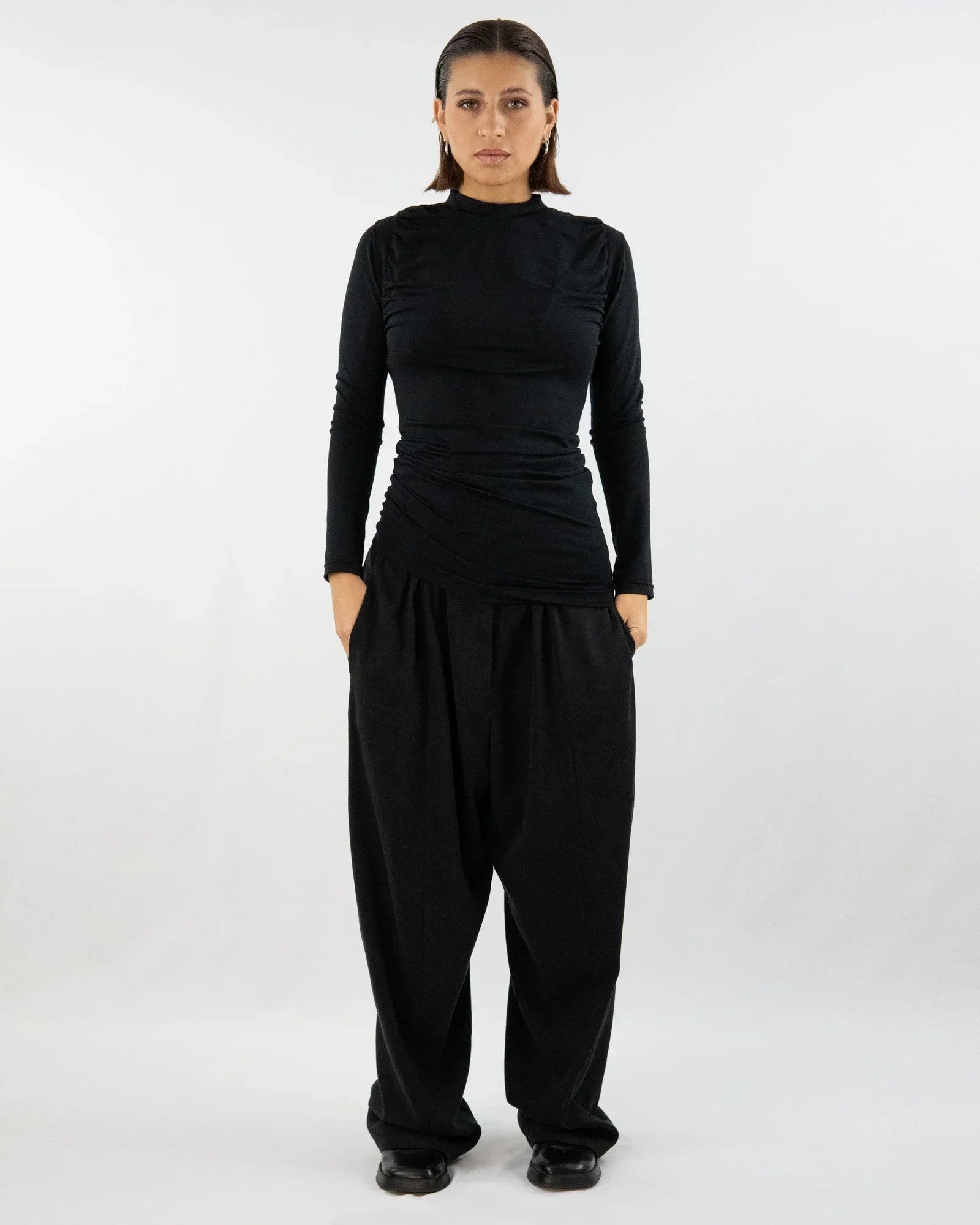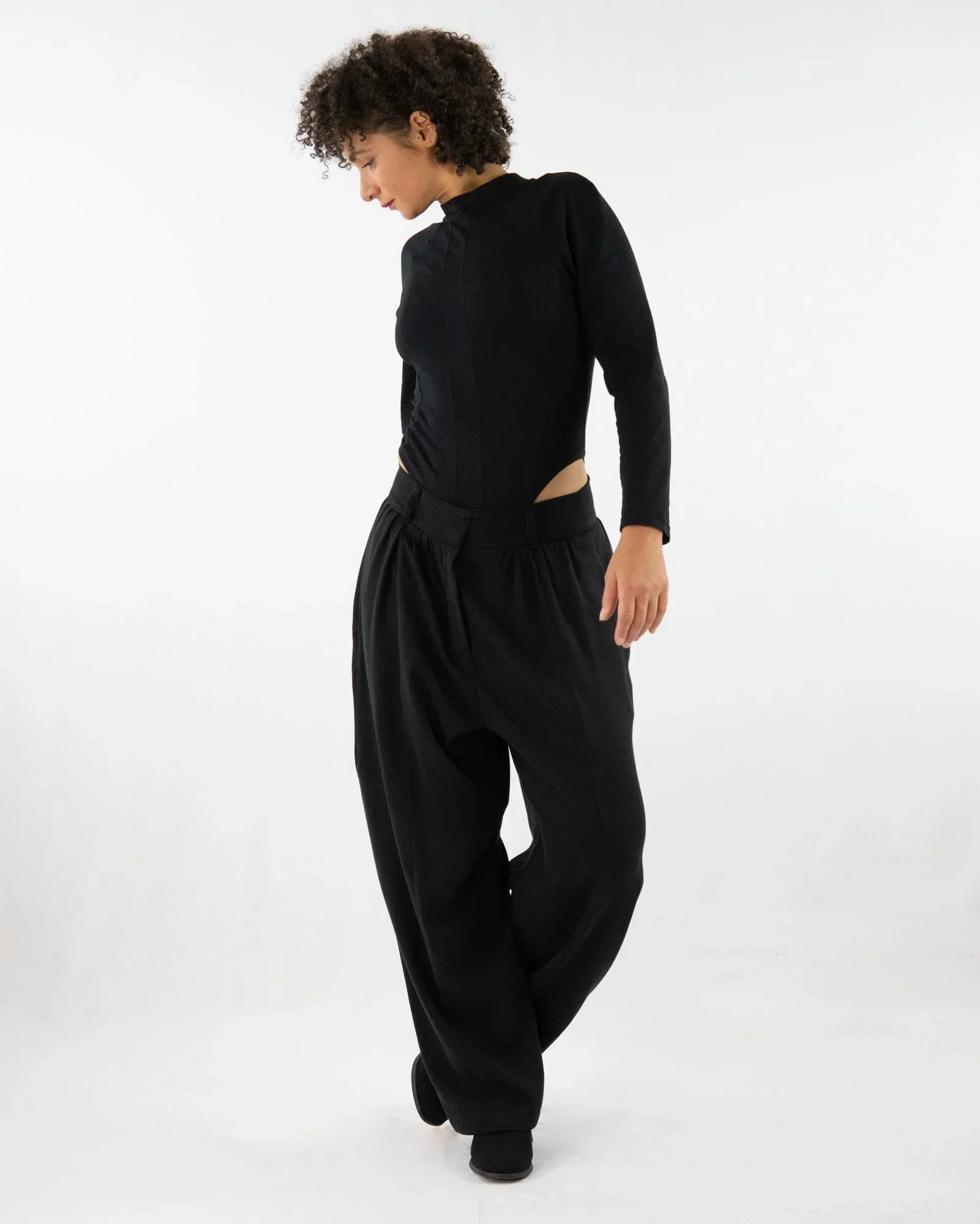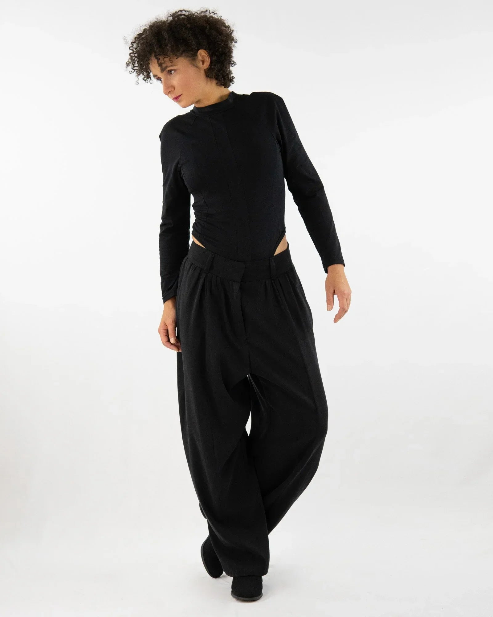 Die AdoHAR Hose setzt auf eine lässige Form mit Tiefe: Der tiefe Sitz bringt Lässigkeit, während die geschwungenen Teilungsnähte das Design optisch strukturieren.
