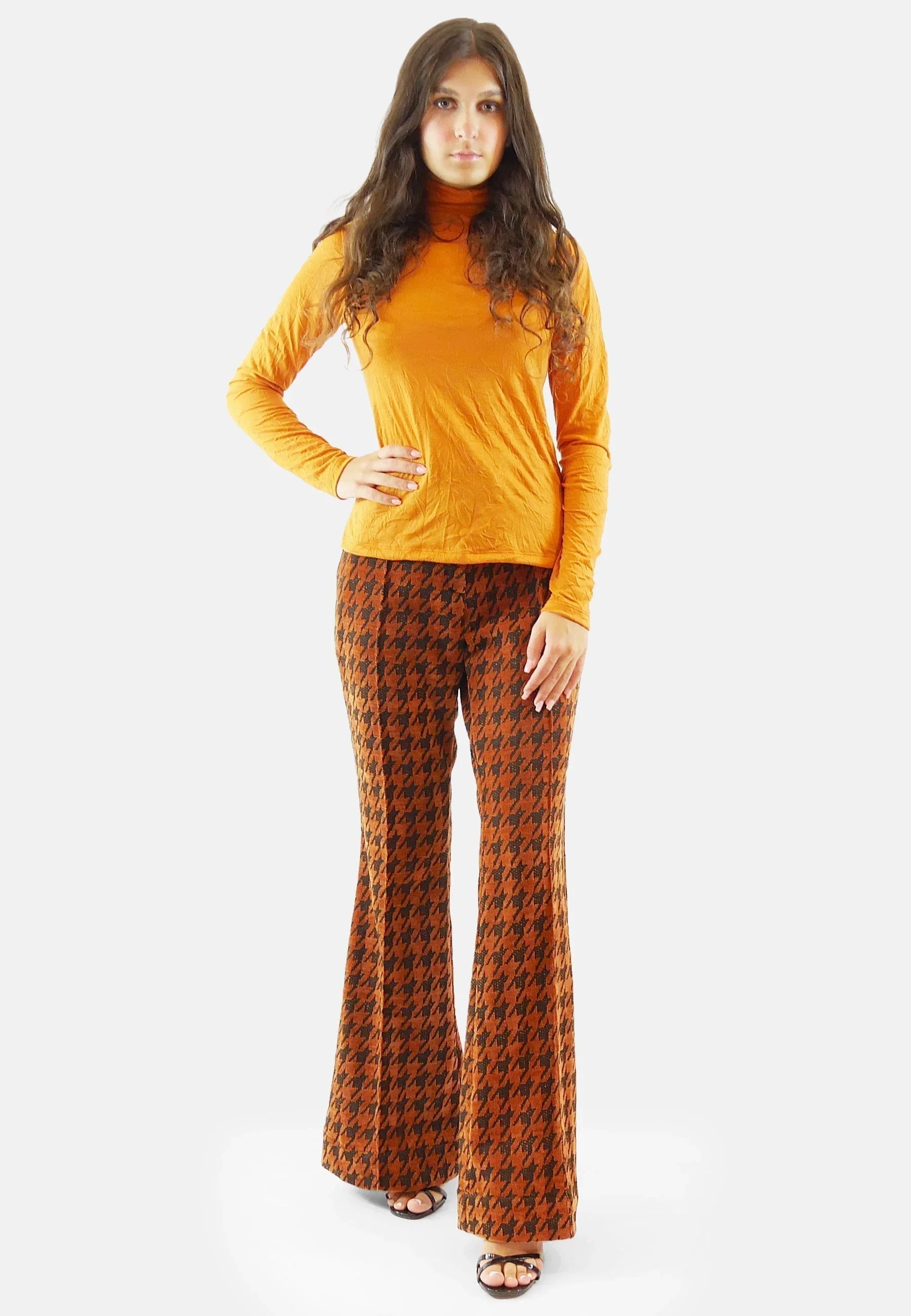 Das feine, texturierte Muster in warmen Braun- und Schwarztönen bringt klassische Eleganz mit einem modernen Twist in deine Garderobe. Ob zum Rollkragenpullover, Blazer oder lässigen Shirt – die Hose lässt sich vielseitig kombinieren und passt ins Büro genauso wie in den Alltag.