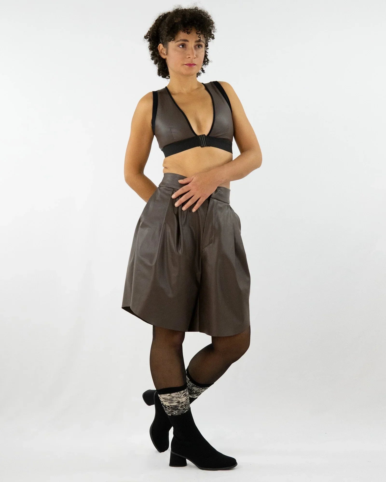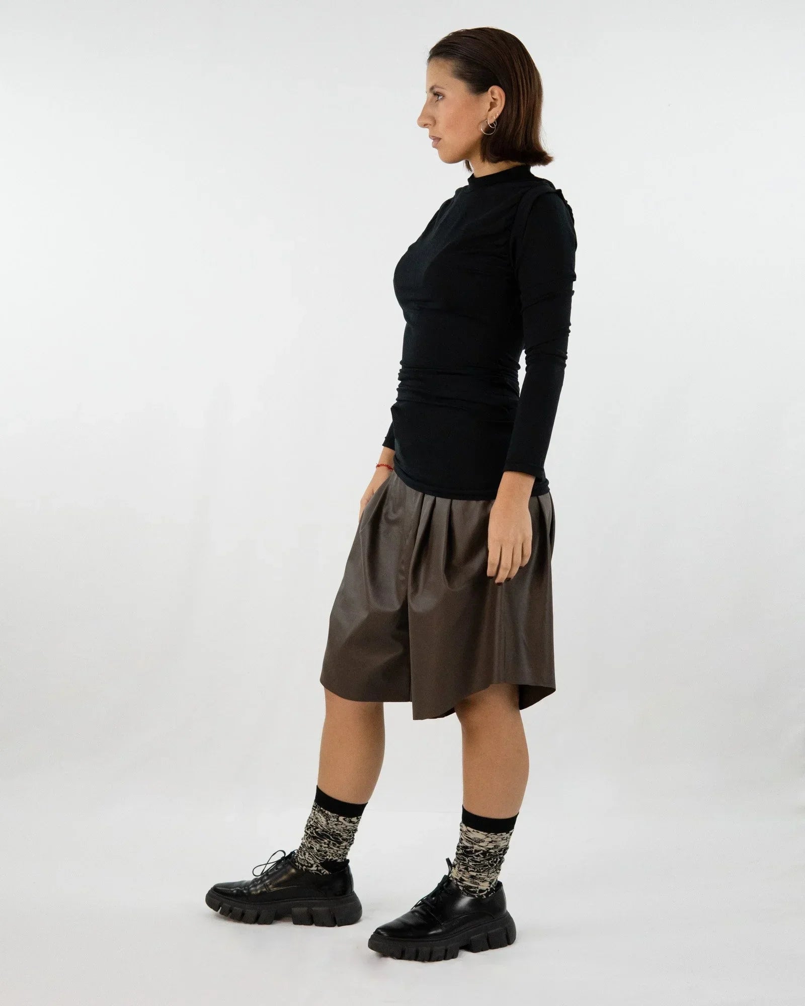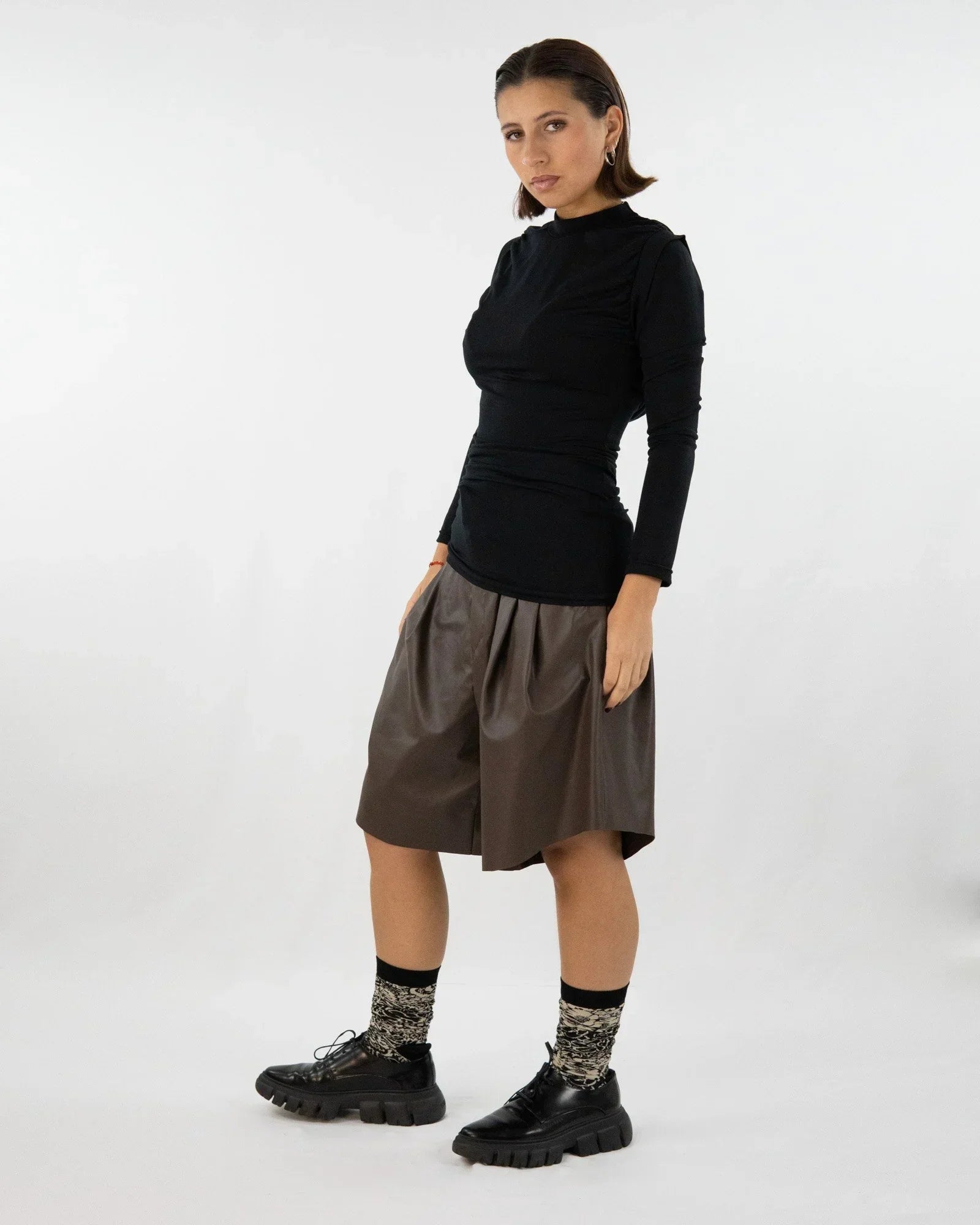 Die Bermuda JADA ist ein vielseitiges Key-Piece: weit geschnitten, hoch tailliert und inspiriert von der Form eines Hosenrocks. Der Mix aus klassischem Schnitt und veganem Leder-Effekt macht diese Hose zu einem besonderen Fashion-Statement. Ob lässig kombiniert oder elegant gestylt – JADA bringt Selbstbewusstsein und Komfort in Einklang.