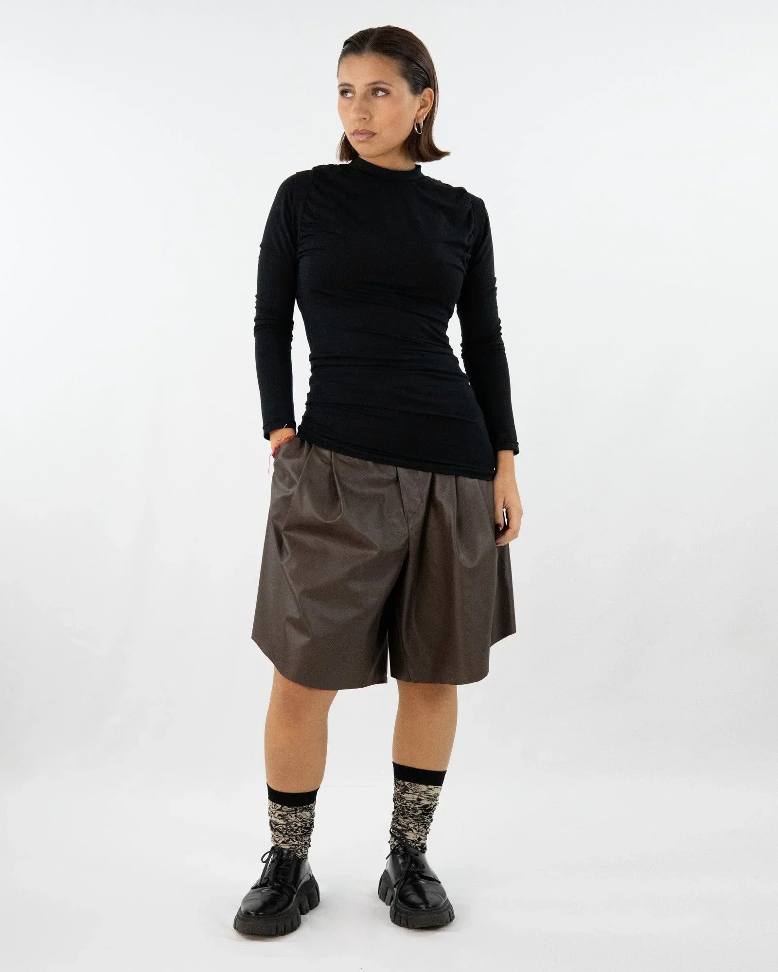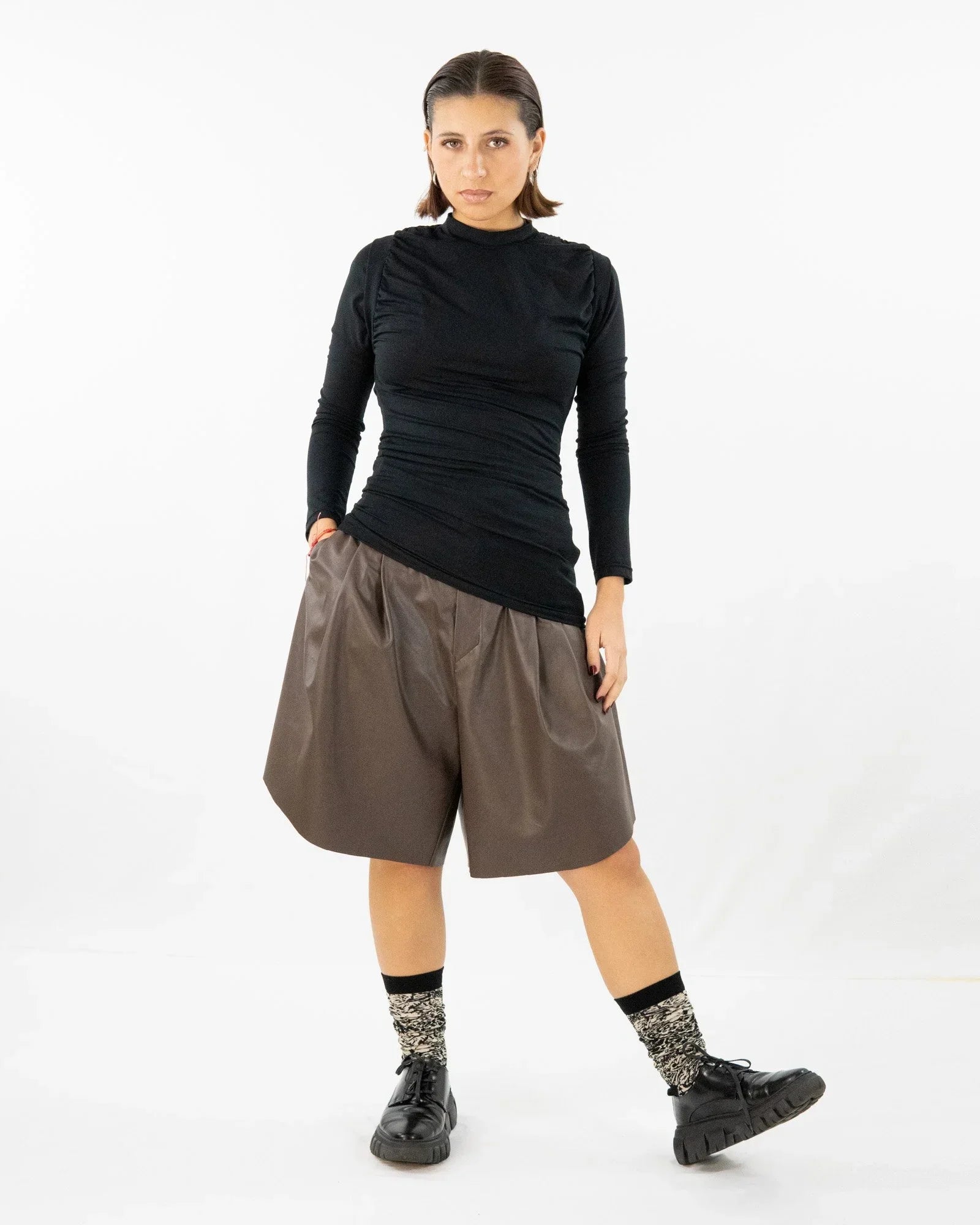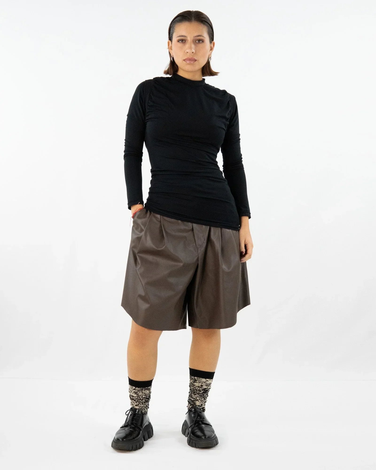 Die Bermuda JADA ist ein vielseitiges Key-Piece: weit geschnitten, hoch tailliert und inspiriert von der Form eines Hosenrocks. Der Mix aus klassischem Schnitt und veganem Leder-Effekt macht diese Hose zu einem besonderen Fashion-Statement. Ob lässig kombiniert oder elegant gestylt – JADA bringt Selbstbewusstsein und Komfort in Einklang.