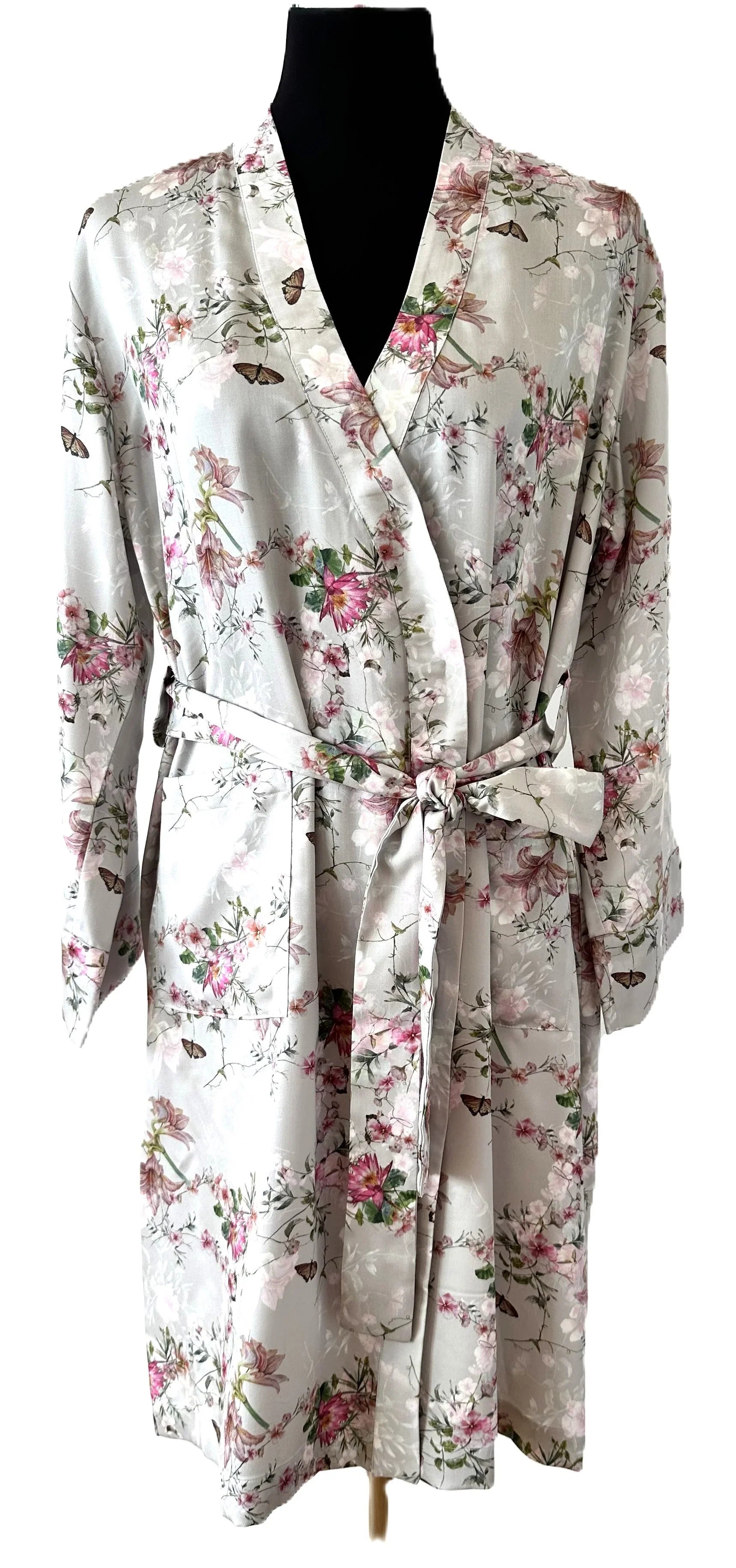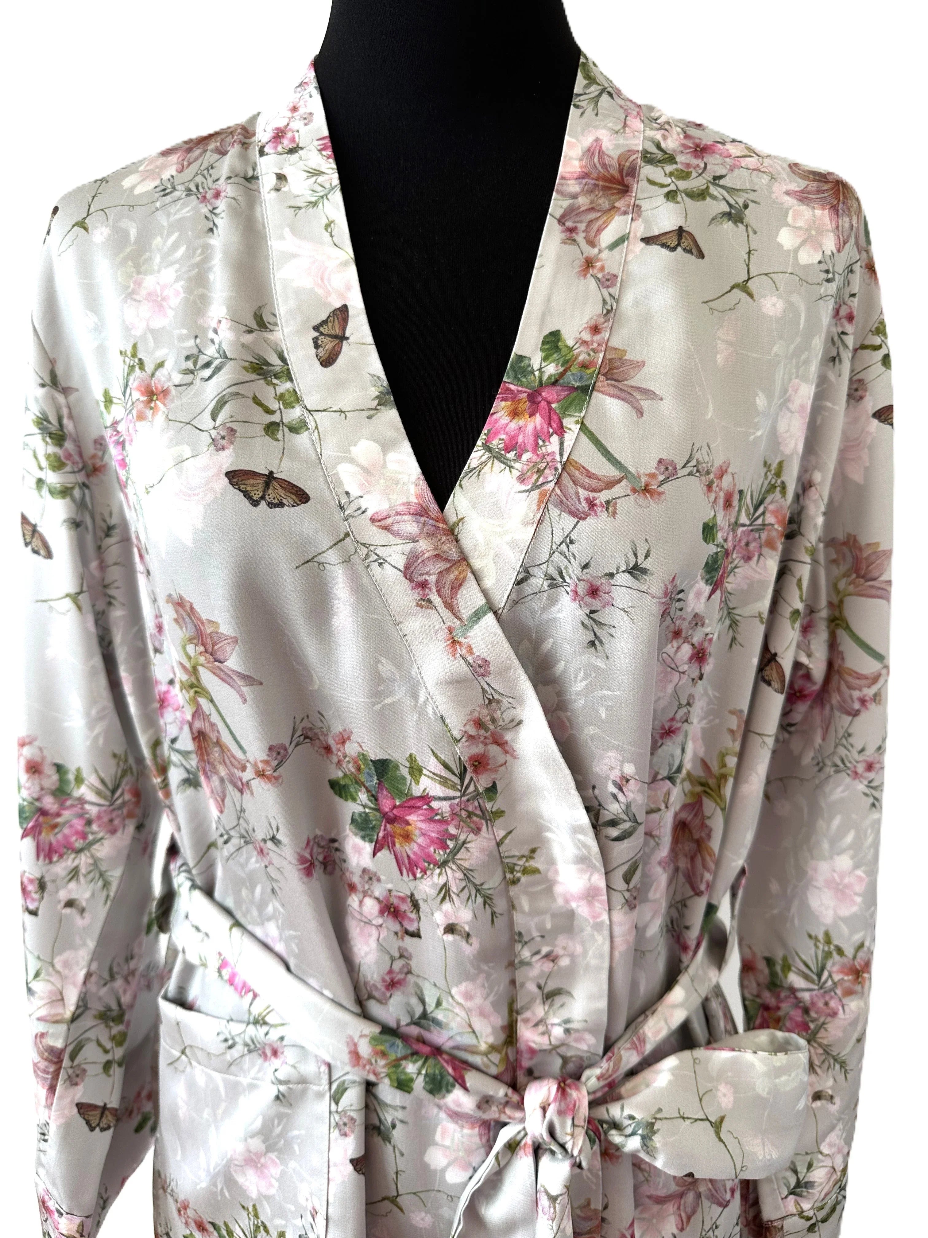 Der Kimono Monet Silver vereint luxuriösen Glanz mit nachhaltiger Verantwortung. Gefertigt aus 100 % LENZING™ Lyocell Satin – einer Faser aus Eukalyptusholz – bietet dieser Kimono ein seidig weiches Tragegefühl und einen natürlichen Schimmer. Ideal für umweltbewusste Menschen, die Stil, Komfort und Nachhaltigkeit verbinden möchten.