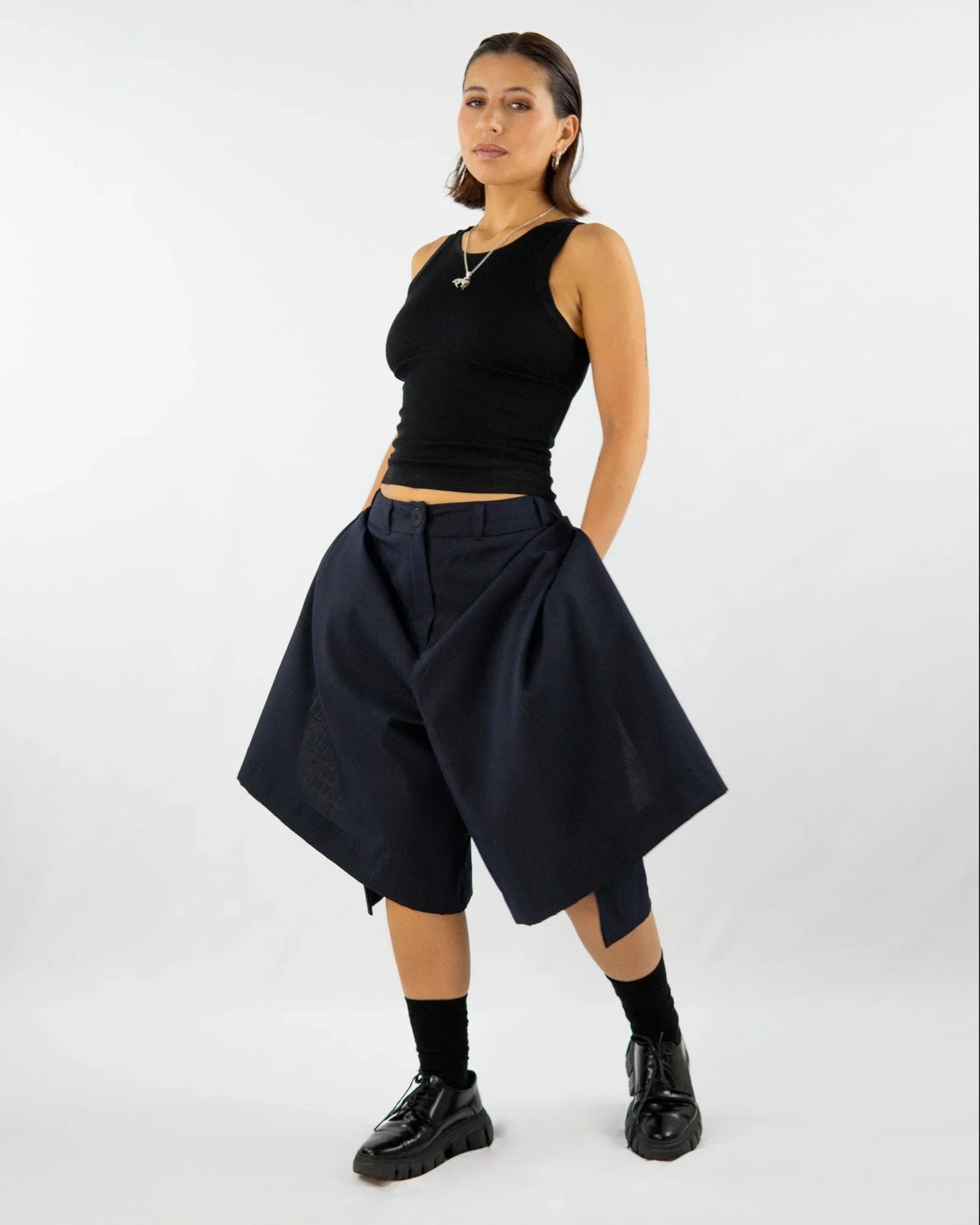 Die HAKAMA MIDNIGHT ist ein avantgardistischer Hosenrock, inspiriert von der traditionellen japanischen Hakama – minimalistisch interpretiert für moderne Garderoben.