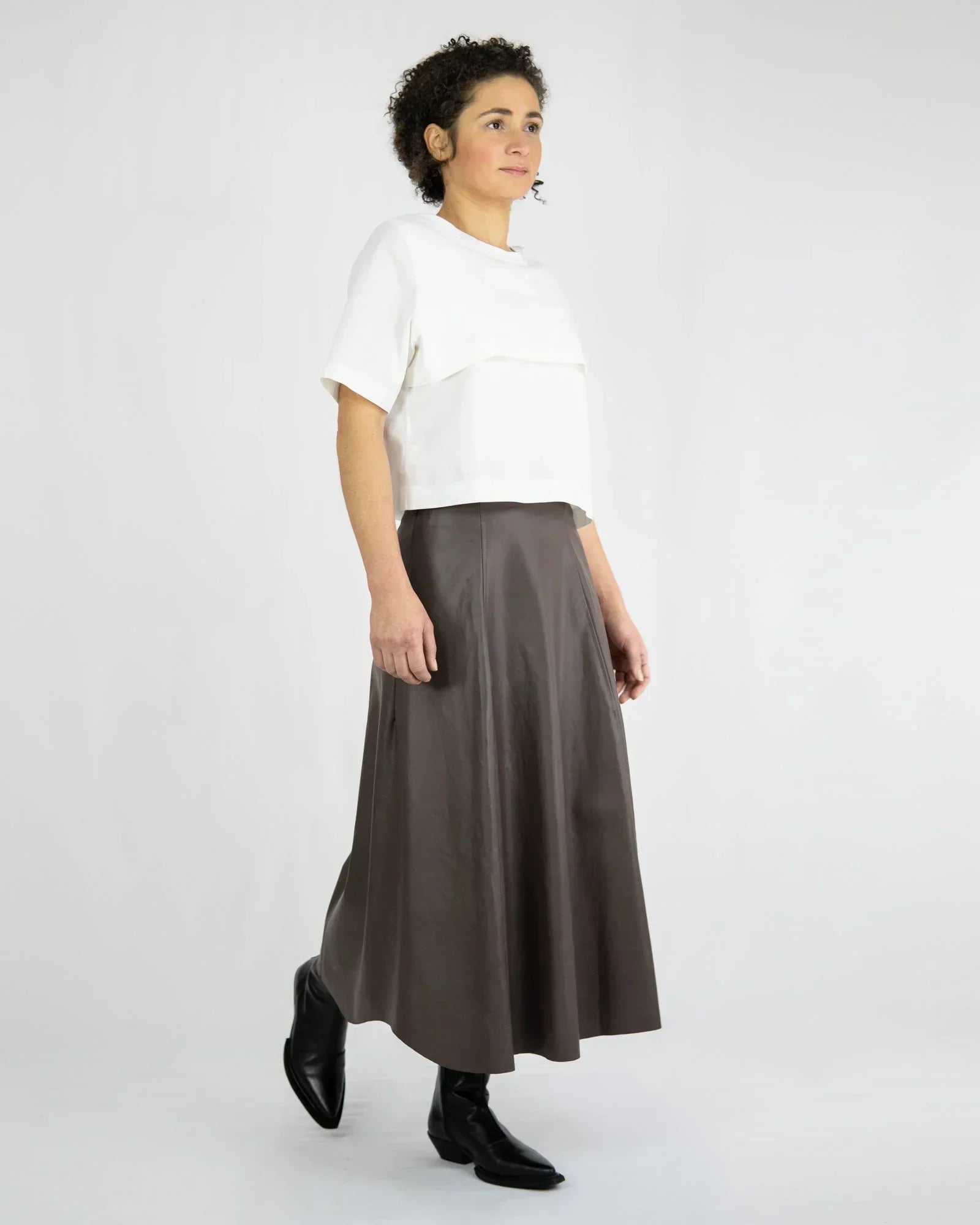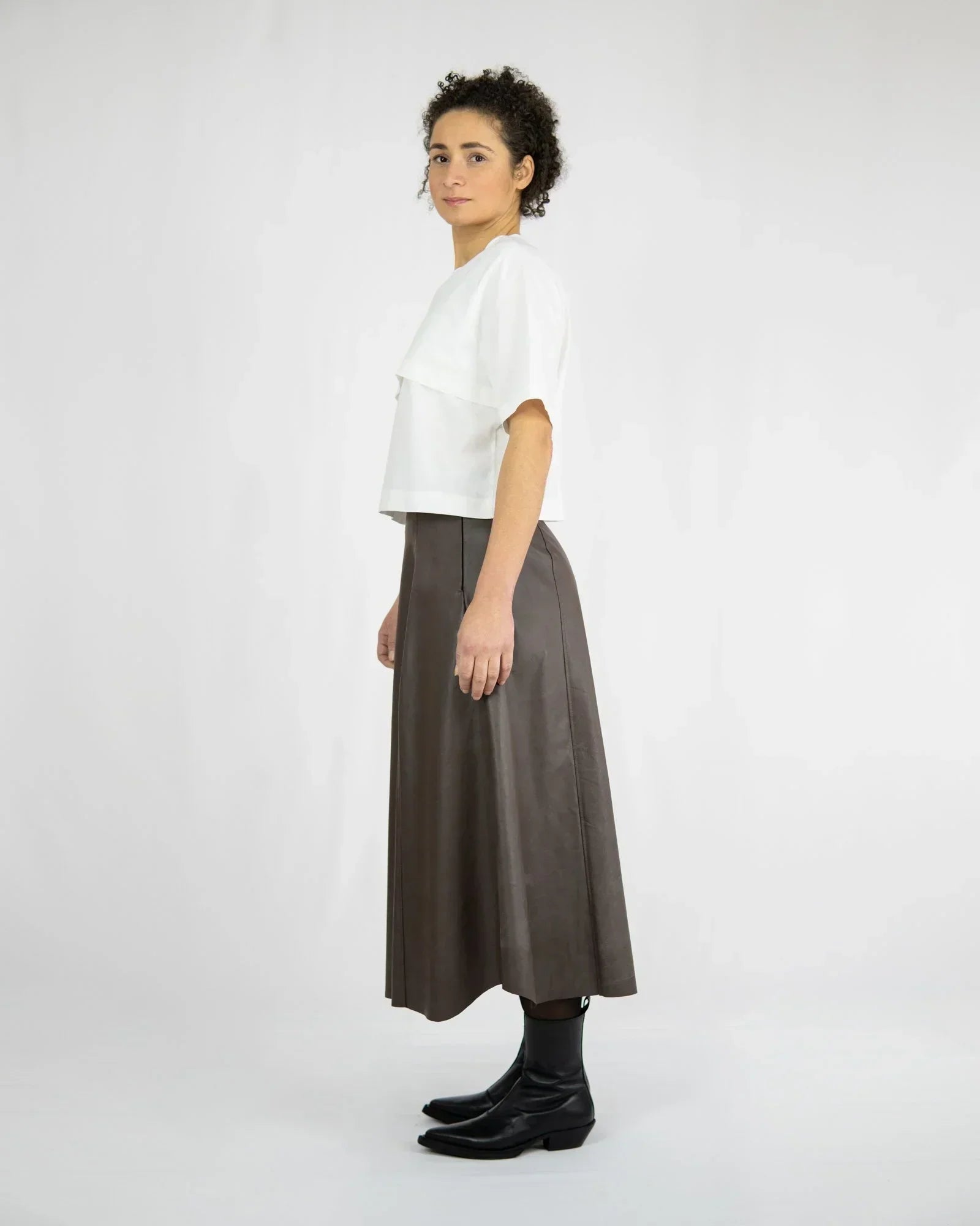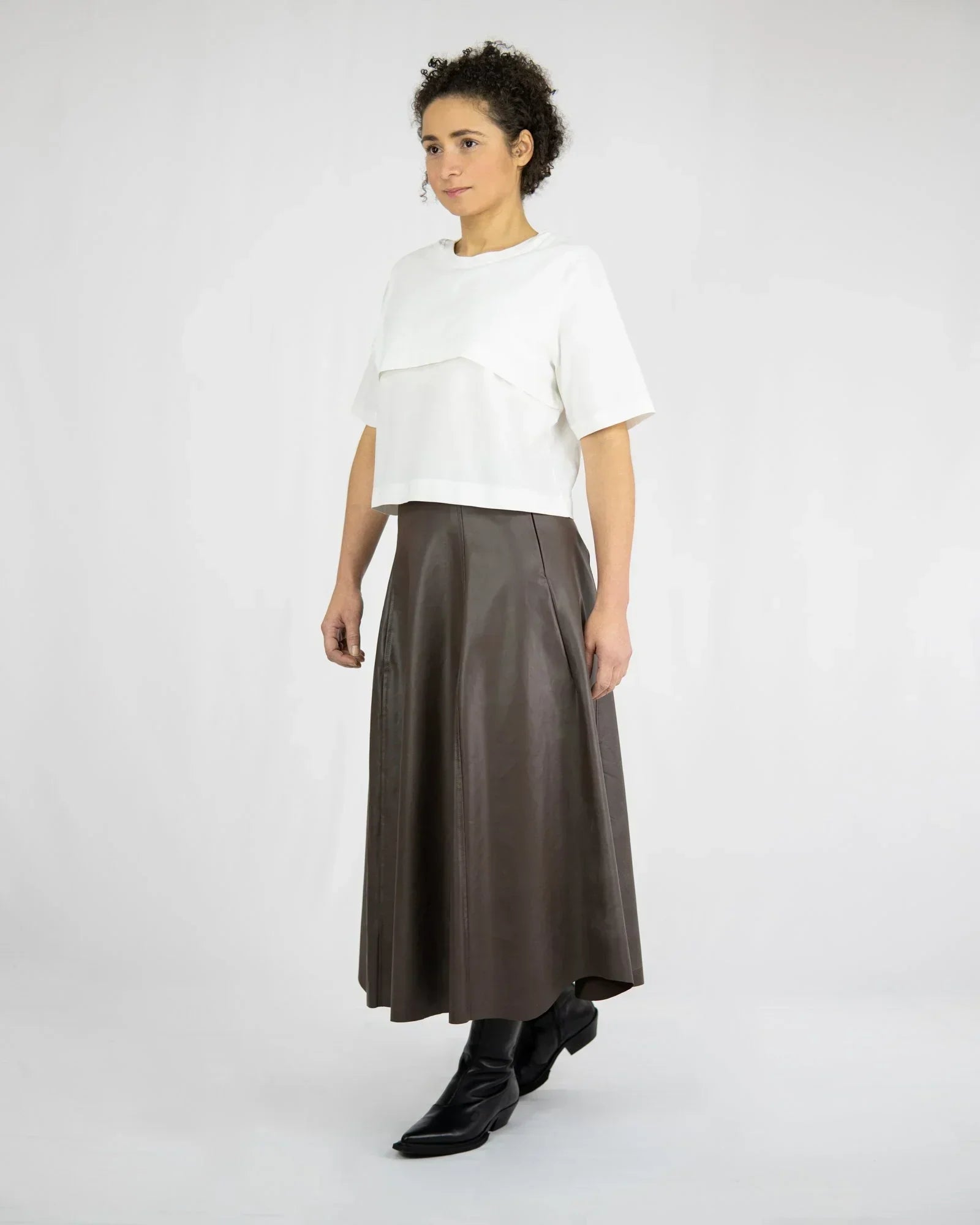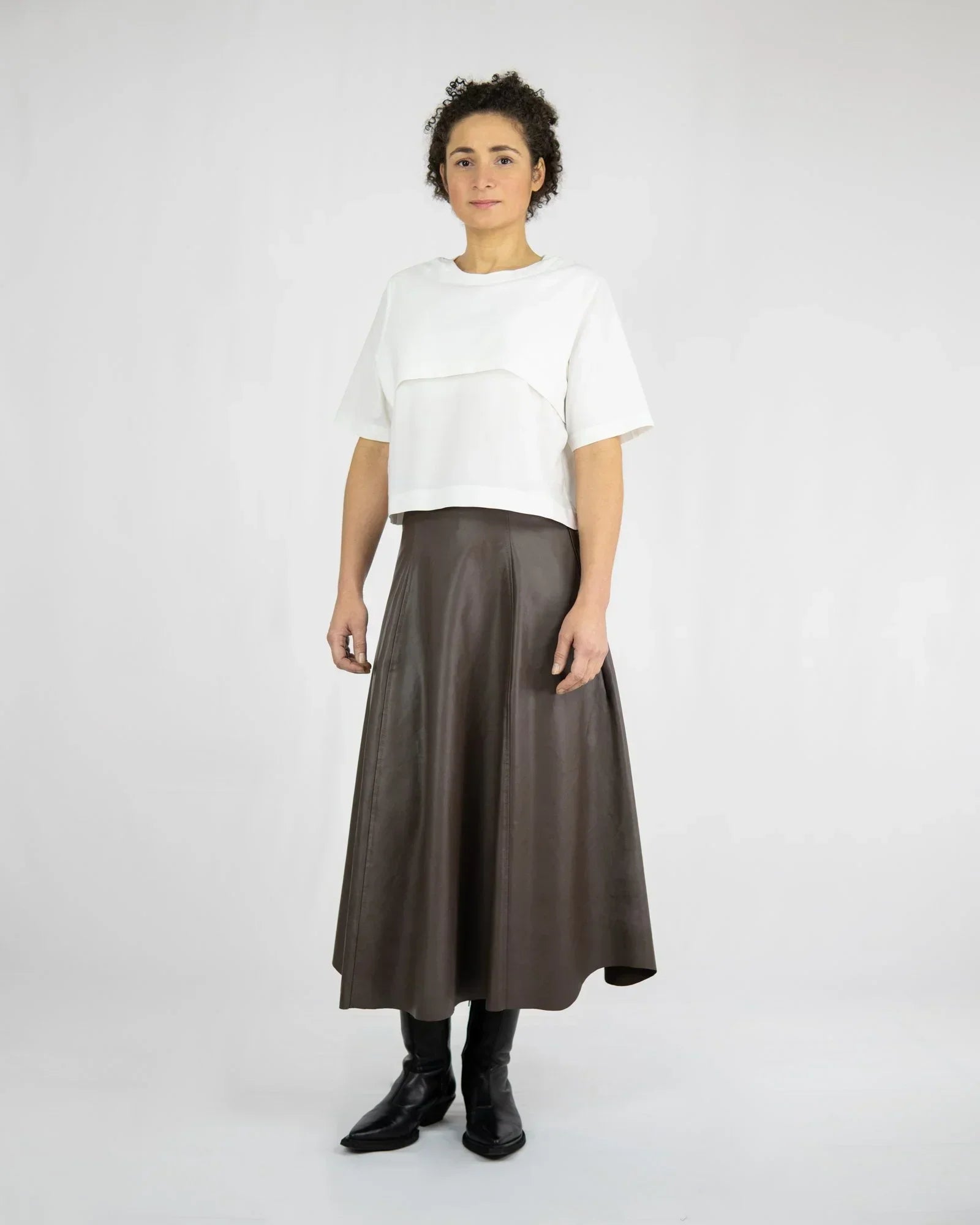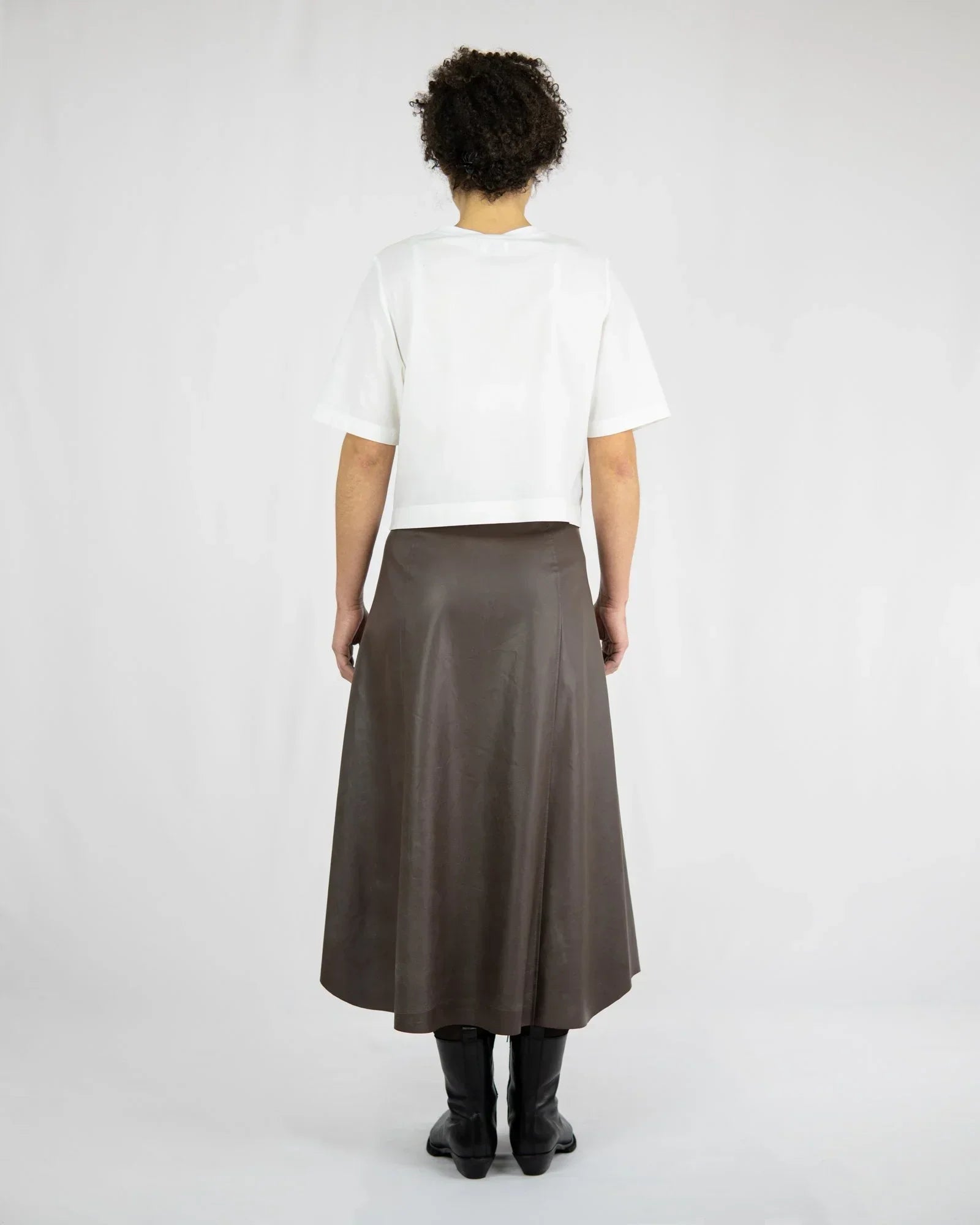 Der Midi-Rock JULA ist ein hoch tailliertes Statement-Piece, das minimalistisches Design mit innovativen Materialien verbindet. Gefertigt aus Bio-Baumwolle mit wasserbasierter Beschichtung, überzeugt er durch eine authentische Leder-Optik – ganz ohne tierische Bestandteile. Teilungsnähte betonen die klare Linienführung, während der schwungvolle Saum eine moderne Leichtigkeit verleiht. Dank seitlichem Reißverschluss und Unterfutter trägt sich JULA komfortabel im Alltag wie auch zu besonderen Anlässen.