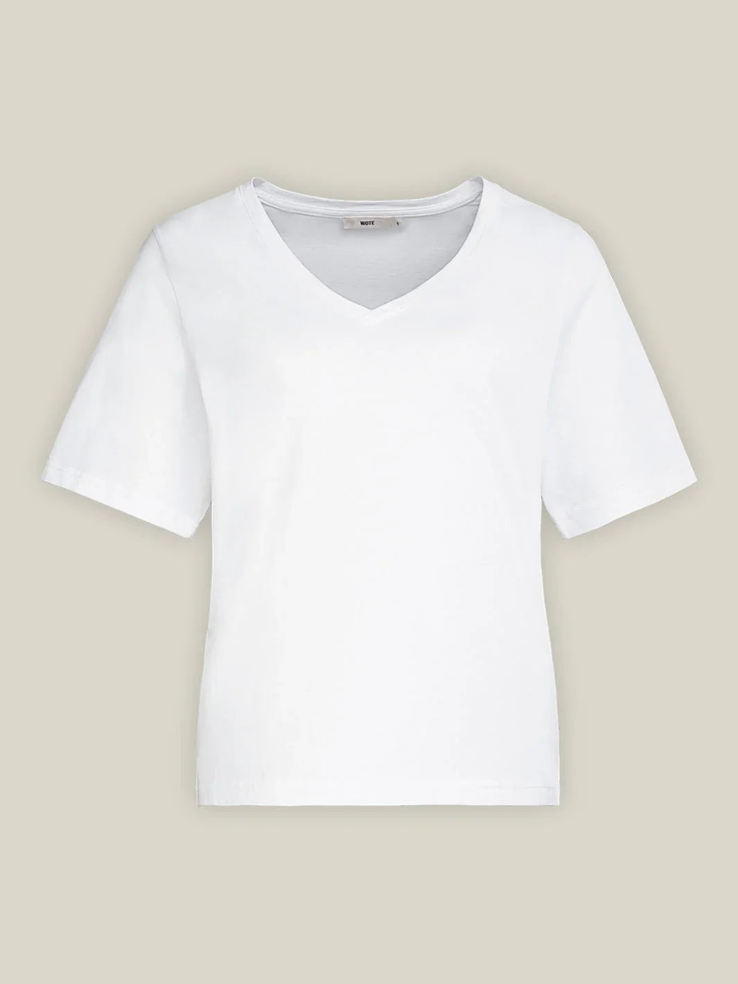 Die hochwertige Bio-Baumwolle stammt aus nachhaltigem Anbau und wird besonders schonend verarbeitet. Das Material ist hautfreundlich, atmungsaktiv und pflegeleicht – ideal für den Alltag. Der V-Ausschnitt ist präzise eingefasst und sorgt für einen femininen Fall, während die gerade Saumlinie das minimalistische Design betont.