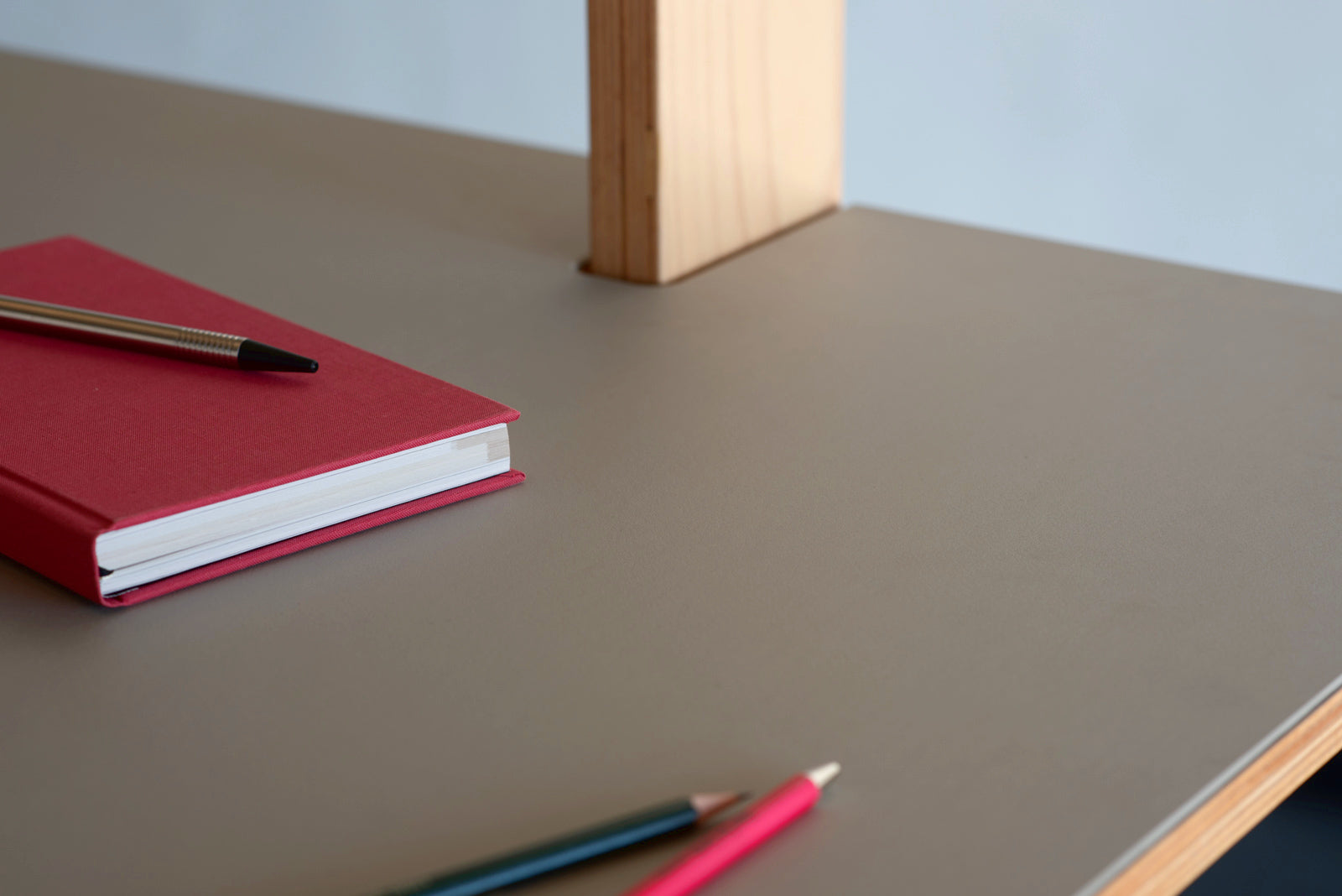 Pflegeleicht, antistatisch und angenehm warm in der Haptik – erhältlich in vier zeitlosen Farben: grau, pistazie, beige, blau. Die Linoleum-Oberfläche verleiht dem Tisch ein ruhiges, elegantes Erscheinungsbild.