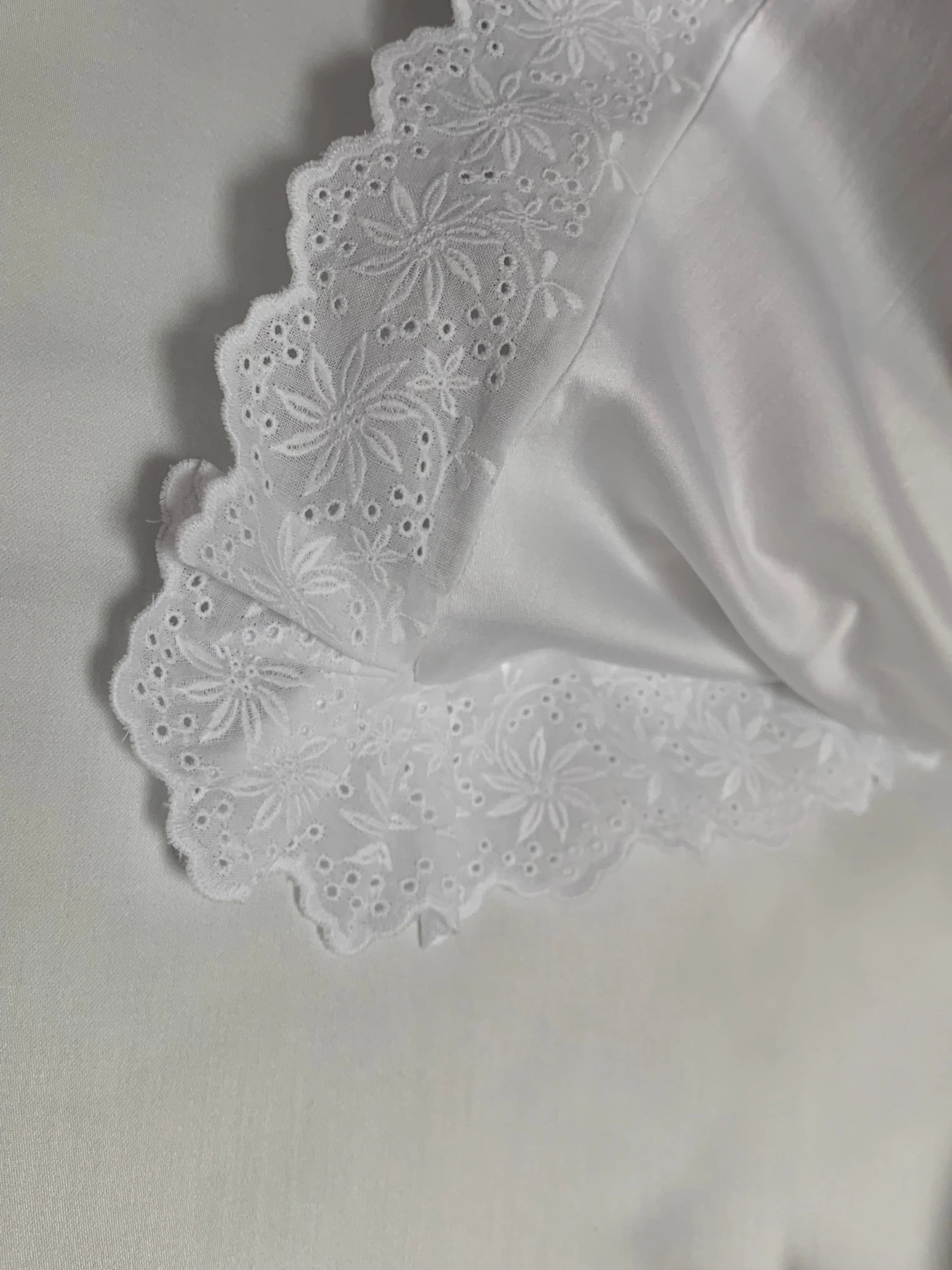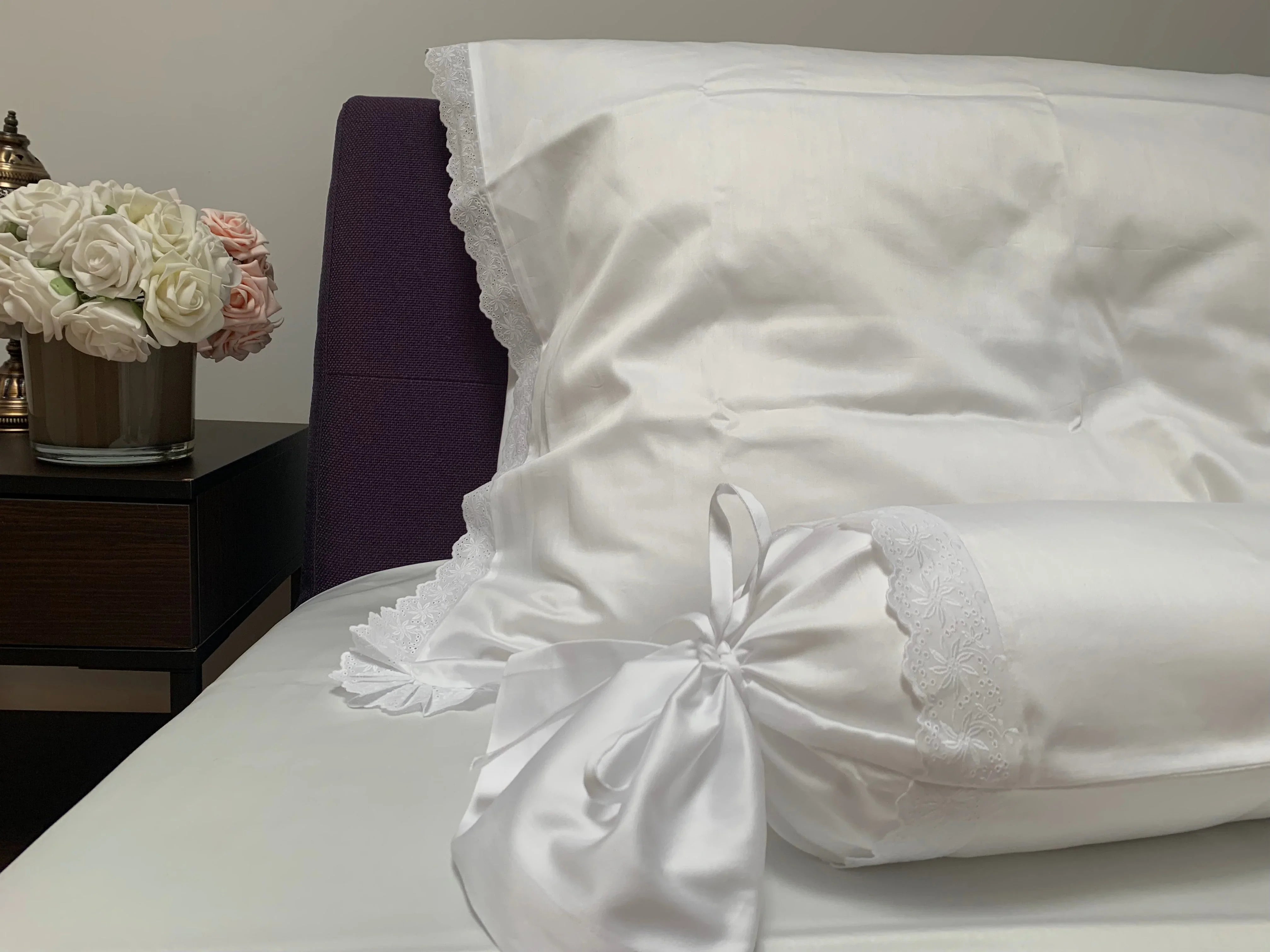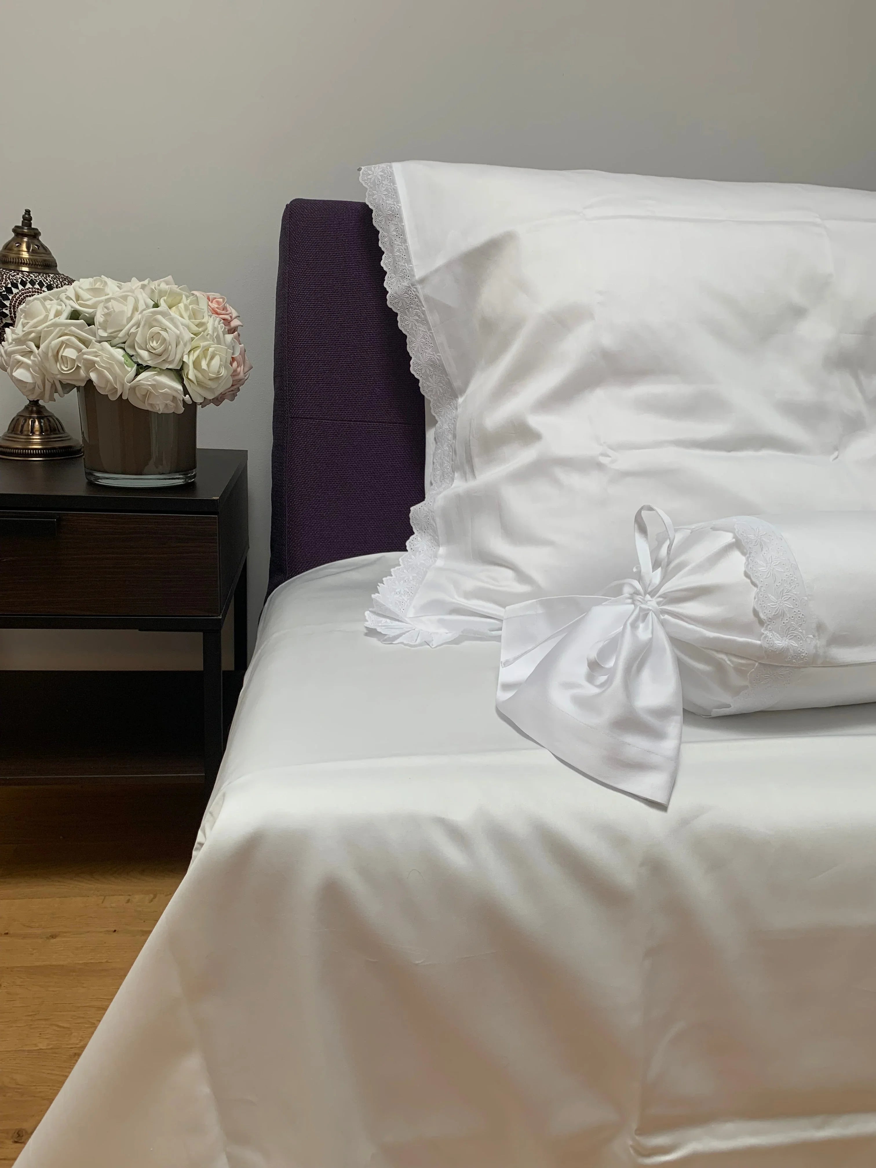 Diese edle Bettwäsche aus 100% mercerisierter Baumwolle bietet Luxus und Komfort. Die Kombination aus reinweißer Farbe und gewebter Spitze schafft ein unvergleichliches Schlafumfeld, das speziell für Ihre Hochzeitsnacht gestaltet wurde.