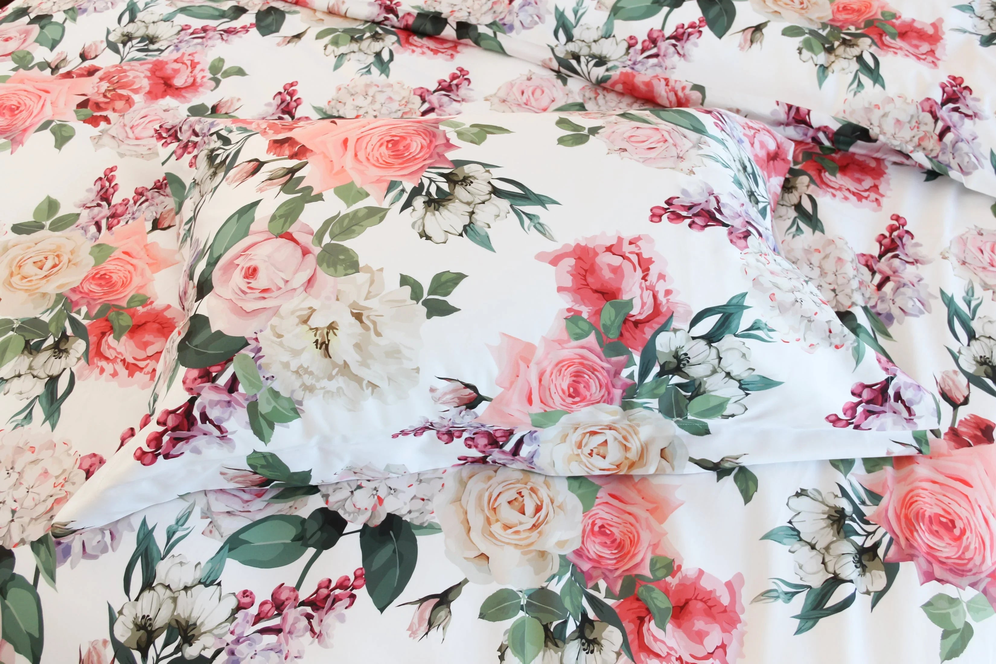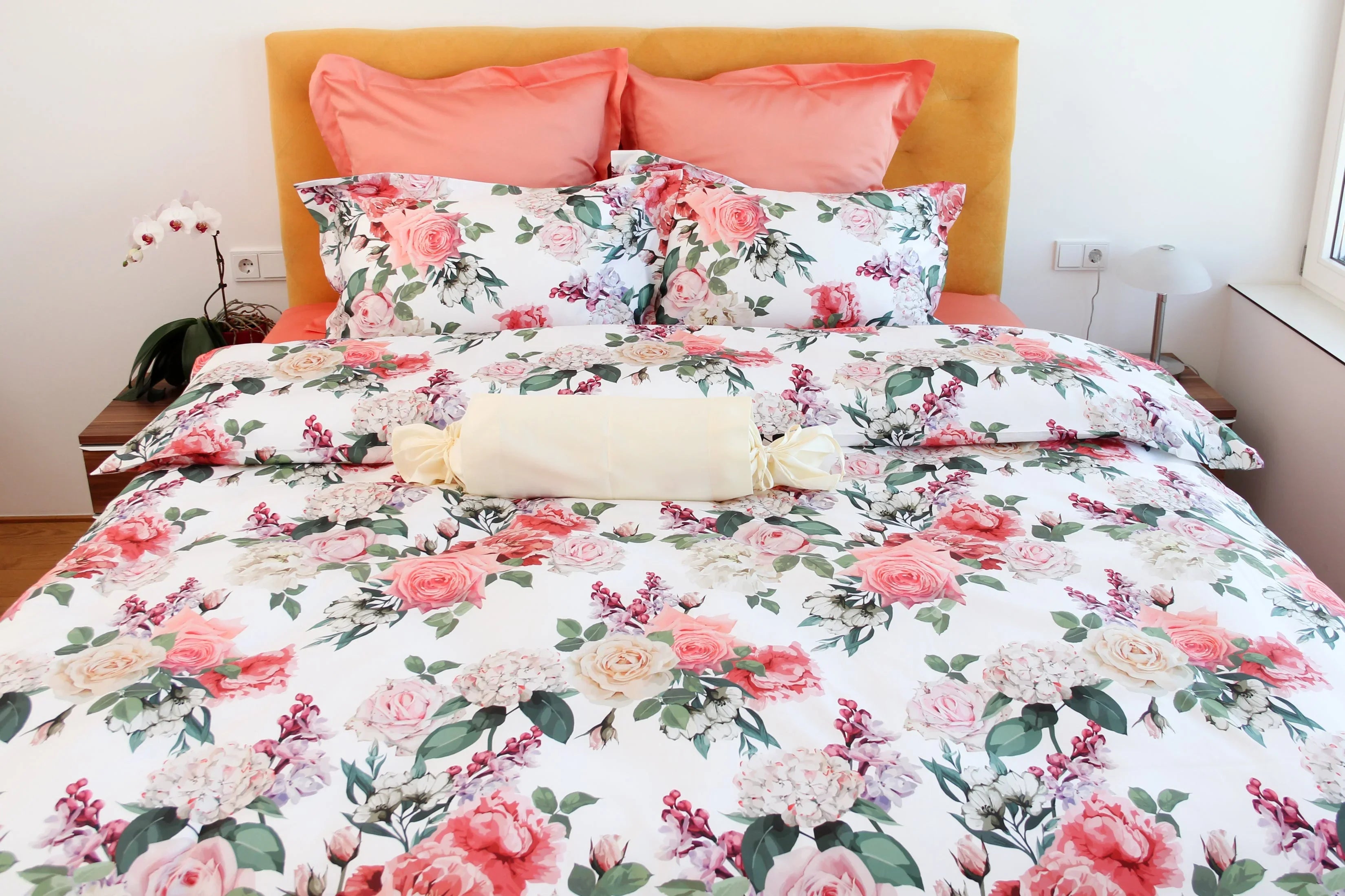 Die Kombination aus 100 % Mako-Baumwolle und Schweizer Satin mit 300 TC sorgt für einen besonders weichen Griff und ein luxuriöses Gefühl auf der Haut. Der Stoff ist leicht, aber dennoch dicht und atmungsaktiv. Die digitale Drucktechnik bringt die naturnahen Rosenmuster auf beiden Seiten der Bettwäsche zur Geltung. Die Decken- und Kissenbezüge sind zudem pflegeleicht, maschinenwaschbar bei 60°C und trocknergeeignet.
