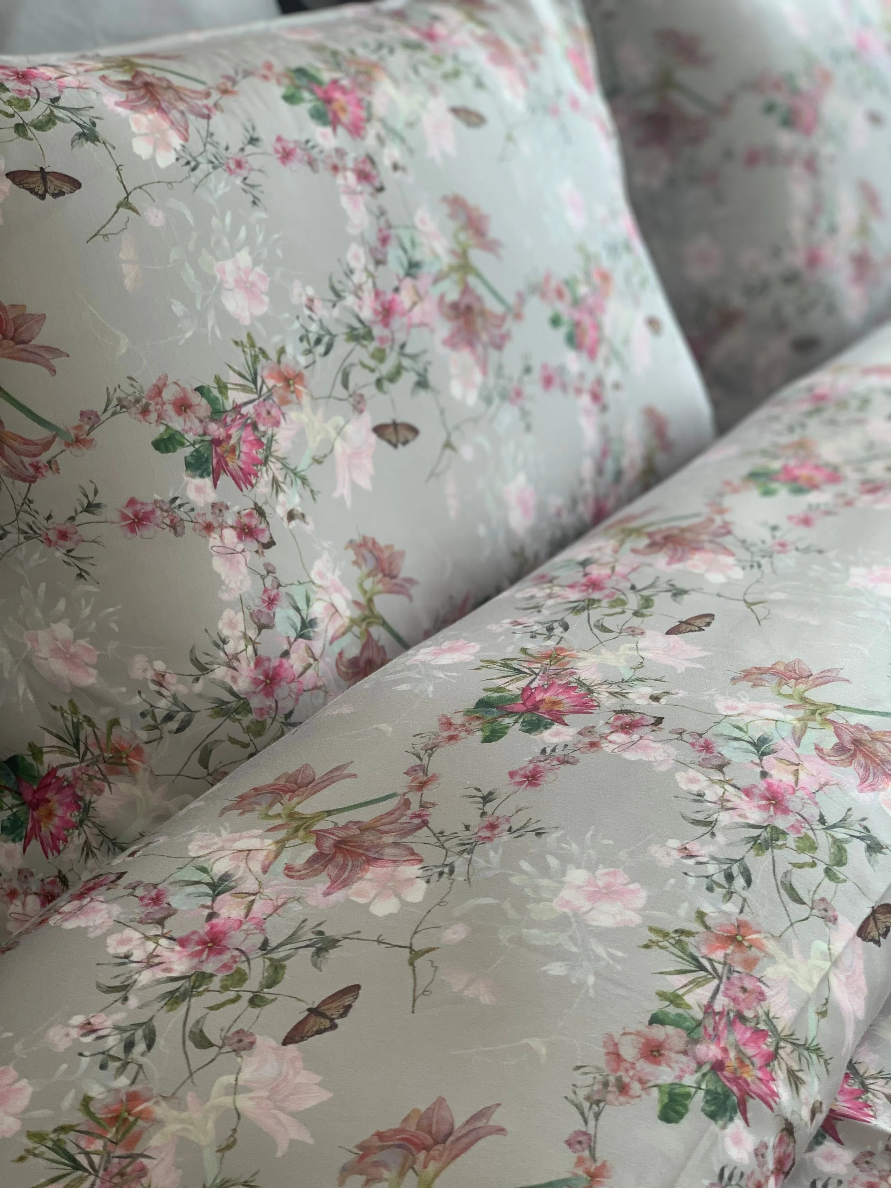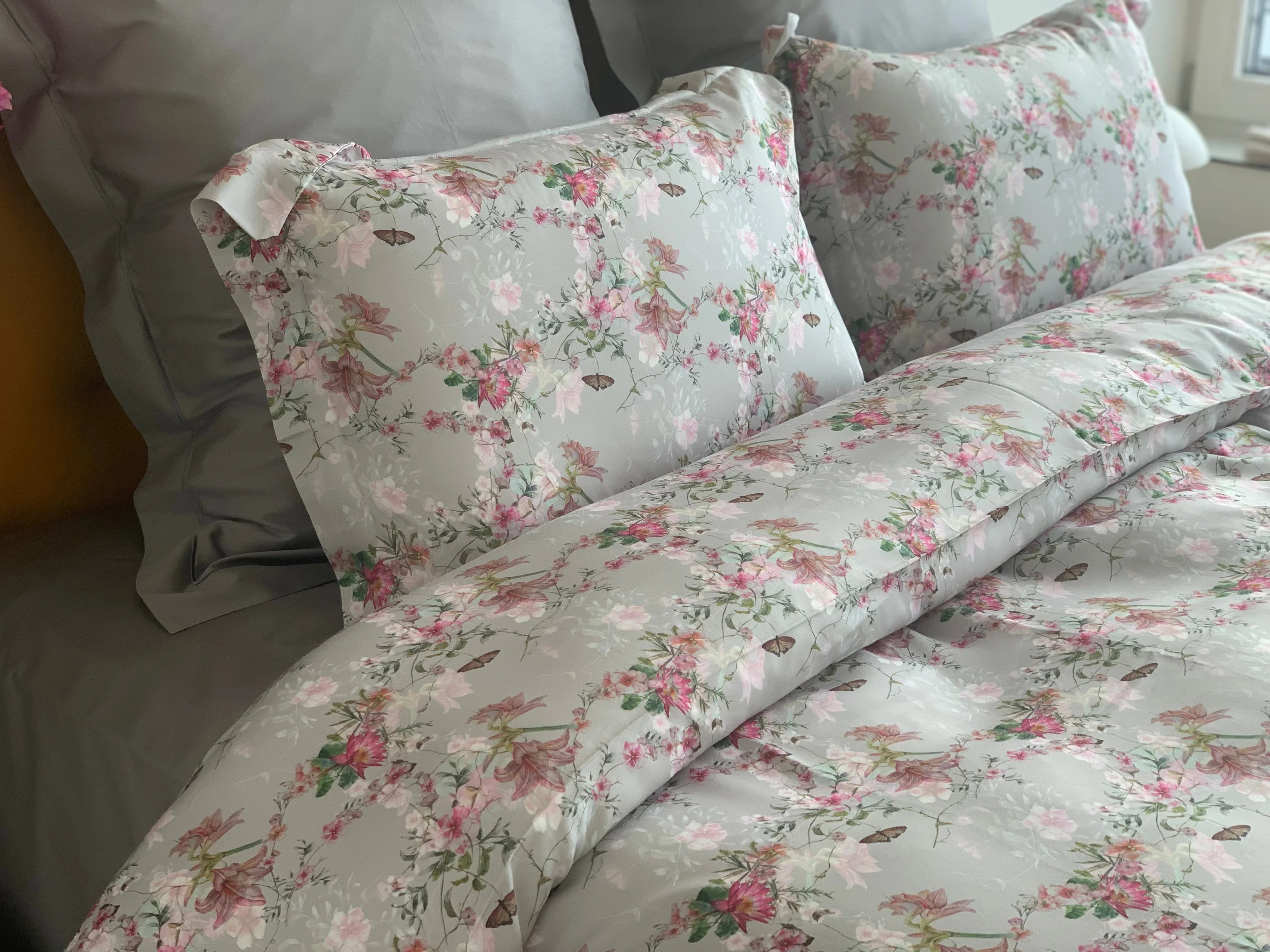 Das Bettwäsche Set Monet Silver vereint luxuriösen Schlafkomfort, nachhaltige Materialien und edlen Satin-Glanz für erholsame Nächte.