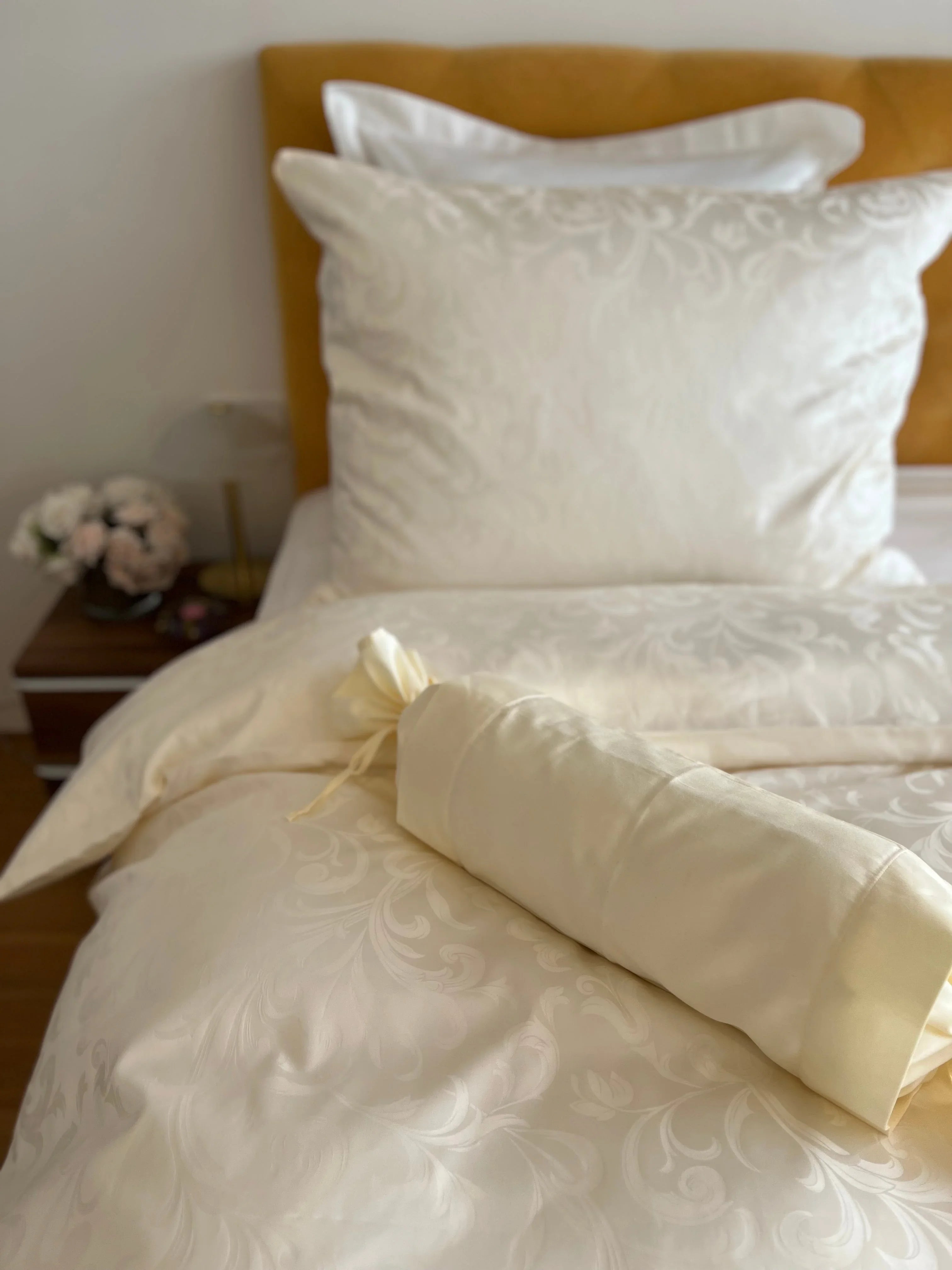 Nachhaltig in Österreich gefertigt – das Damast Bettwäsche Set Isabella Creme vereint exklusive Verarbeitung, luxuriöses Design und höchsten Komfort für traumhafte Nächte.