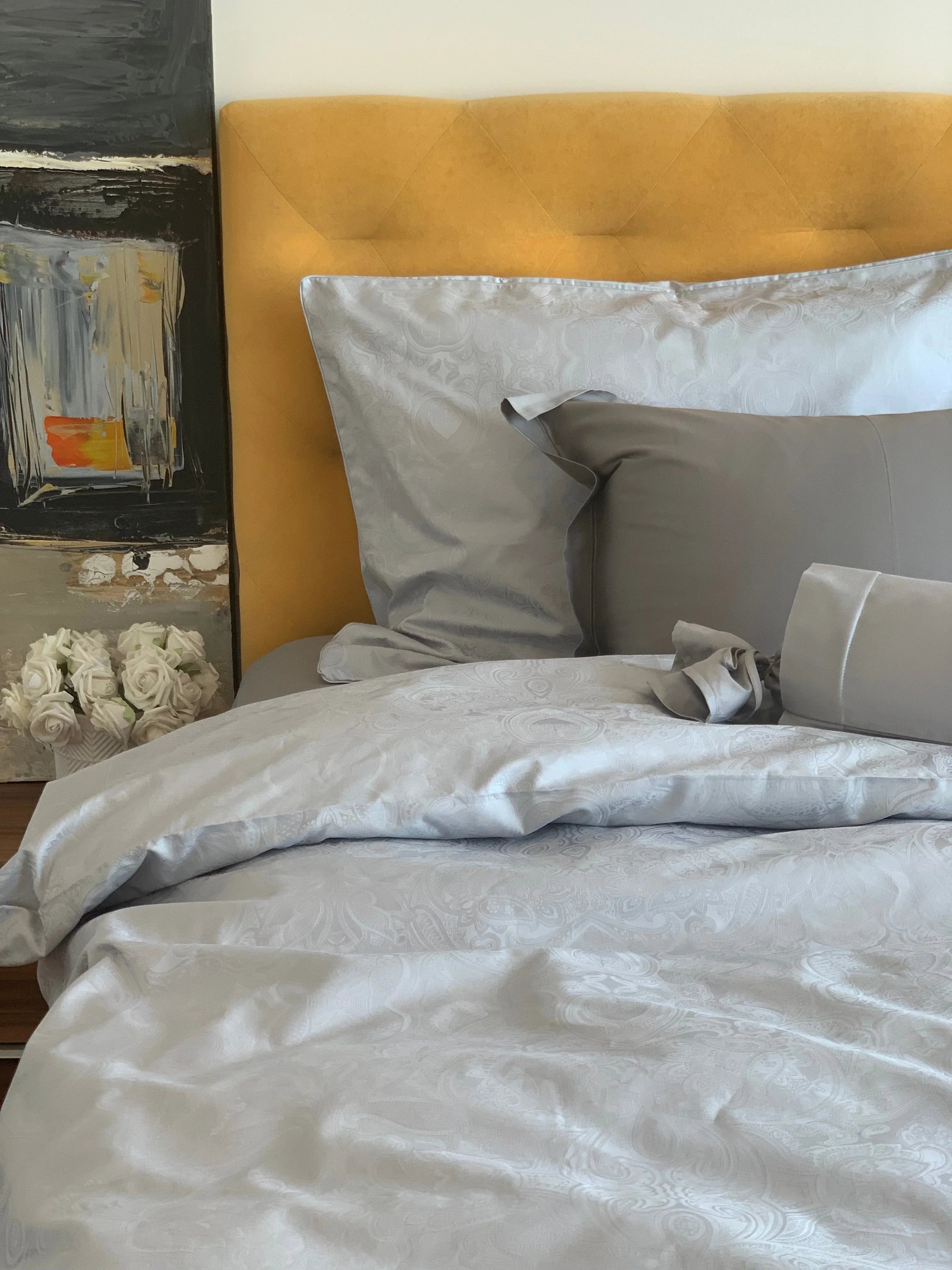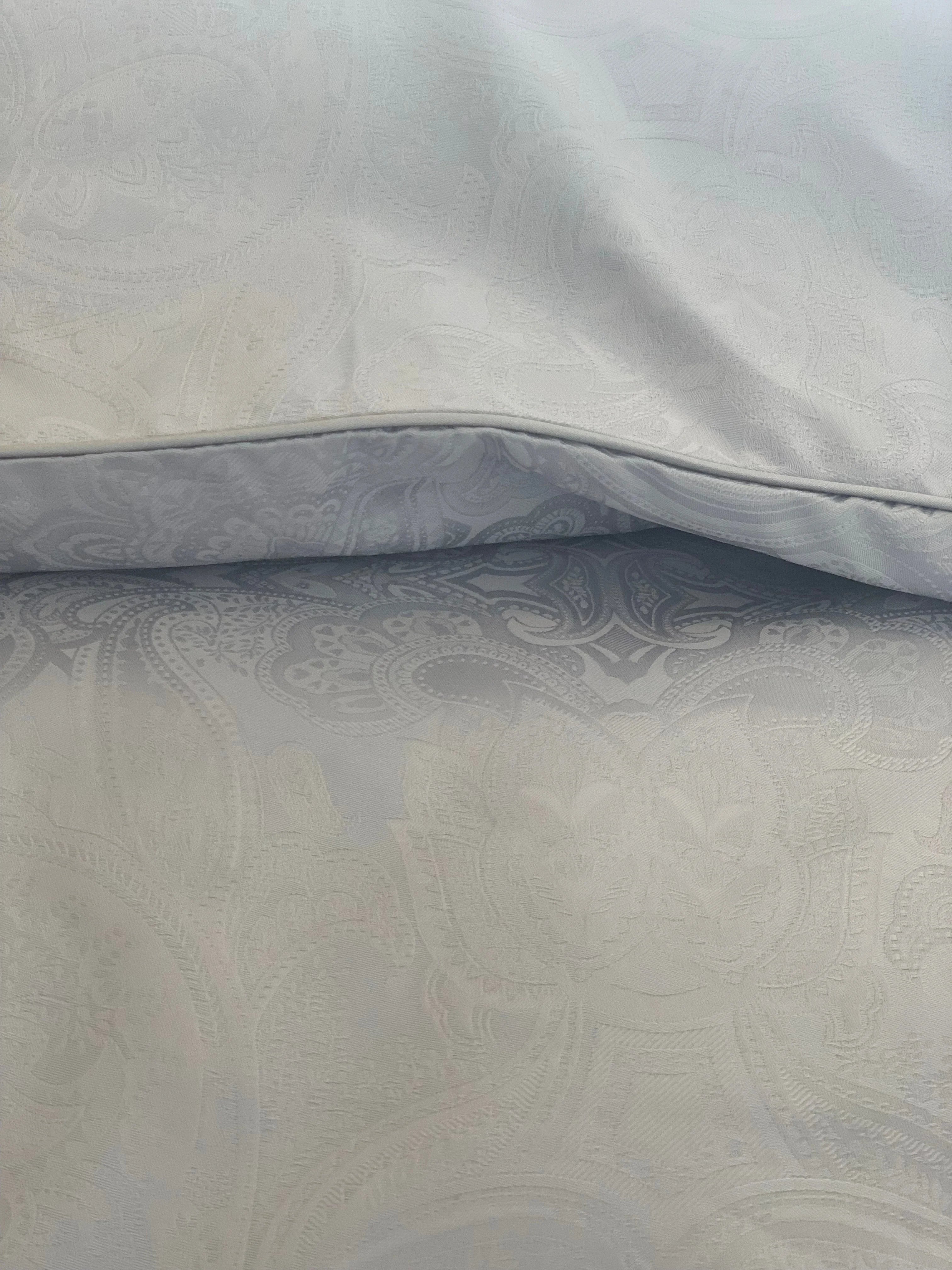 Mit dem Damast Bettwäsche Set Paisley Silver genießen Sie luxuriöse Nächte in höchster Qualität, Komfort und nachhaltiger Fertigung.