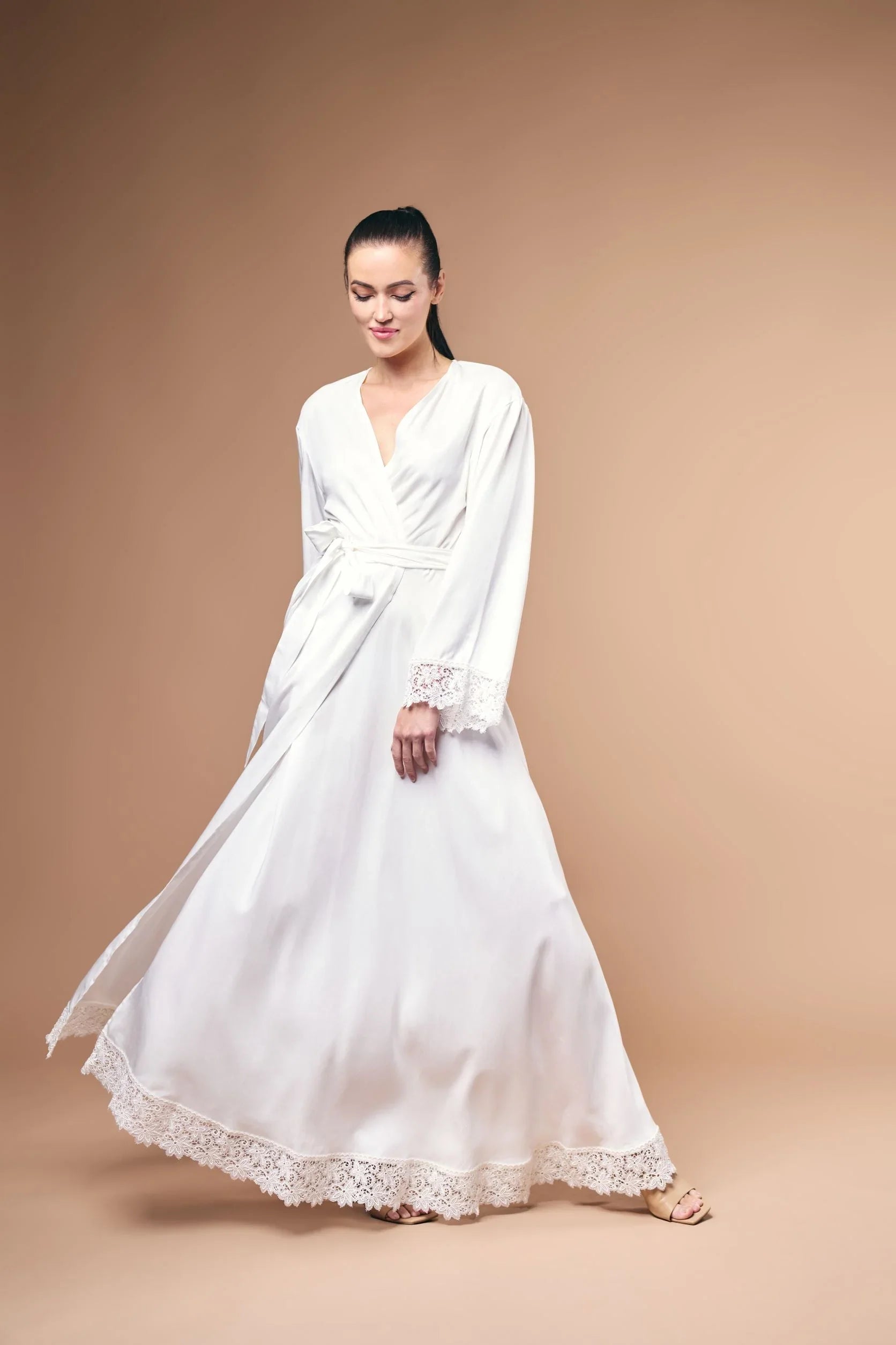 Das Obermaterial aus Micro-Tencel-Satin besteht aus nachhaltigen Lyocellfasern, die Feuchtigkeit effizient regulieren und besonders hautfreundlich sind. Die Sankt Galler Spitzen aus reiner Baumwolle verleihen dem Kimono feminine Leichtigkeit und visuelle Raffinesse. Oberflächengefühl: weich, kühlend, fließend – ideal auch für empfindliche Haut.