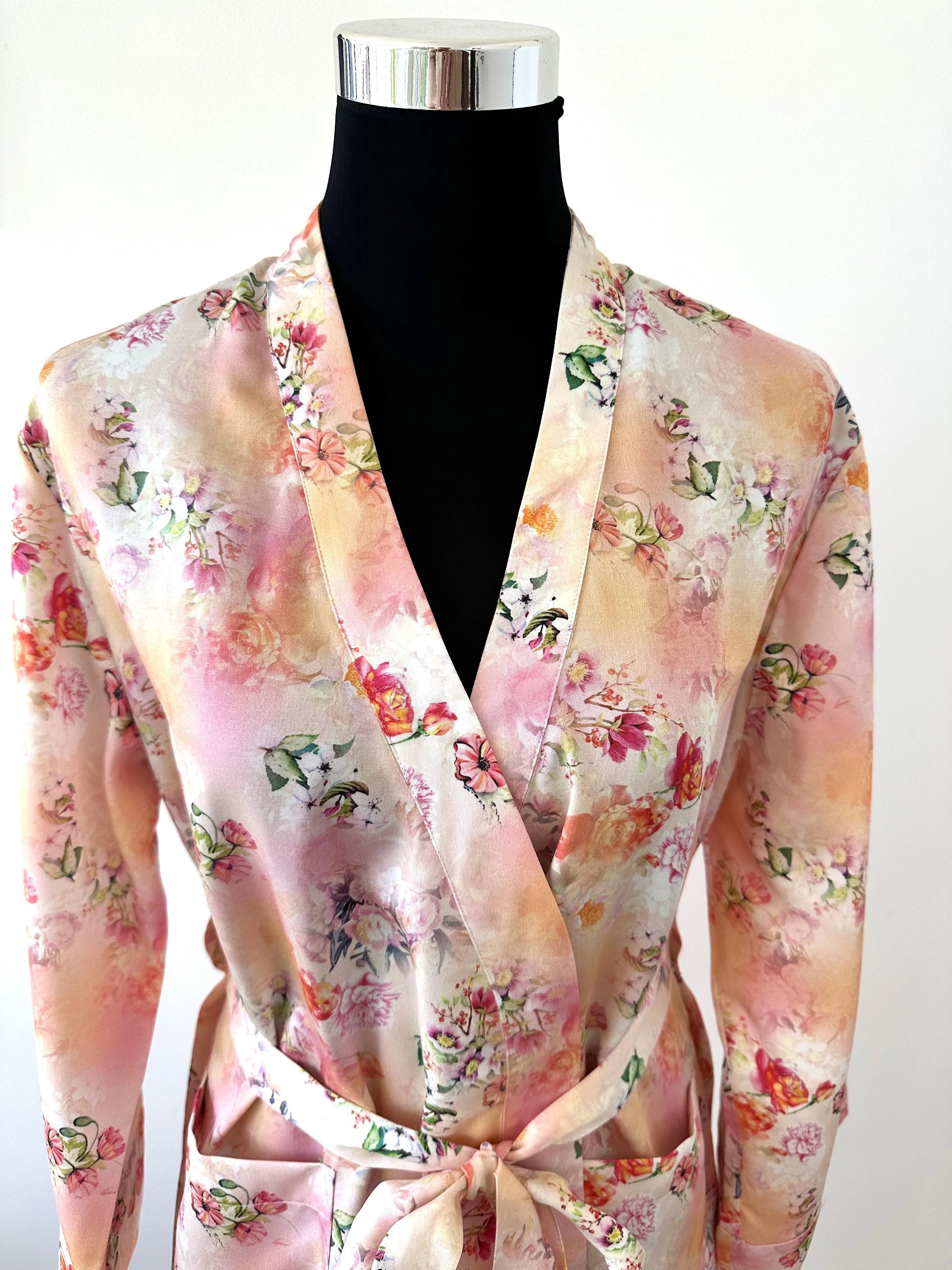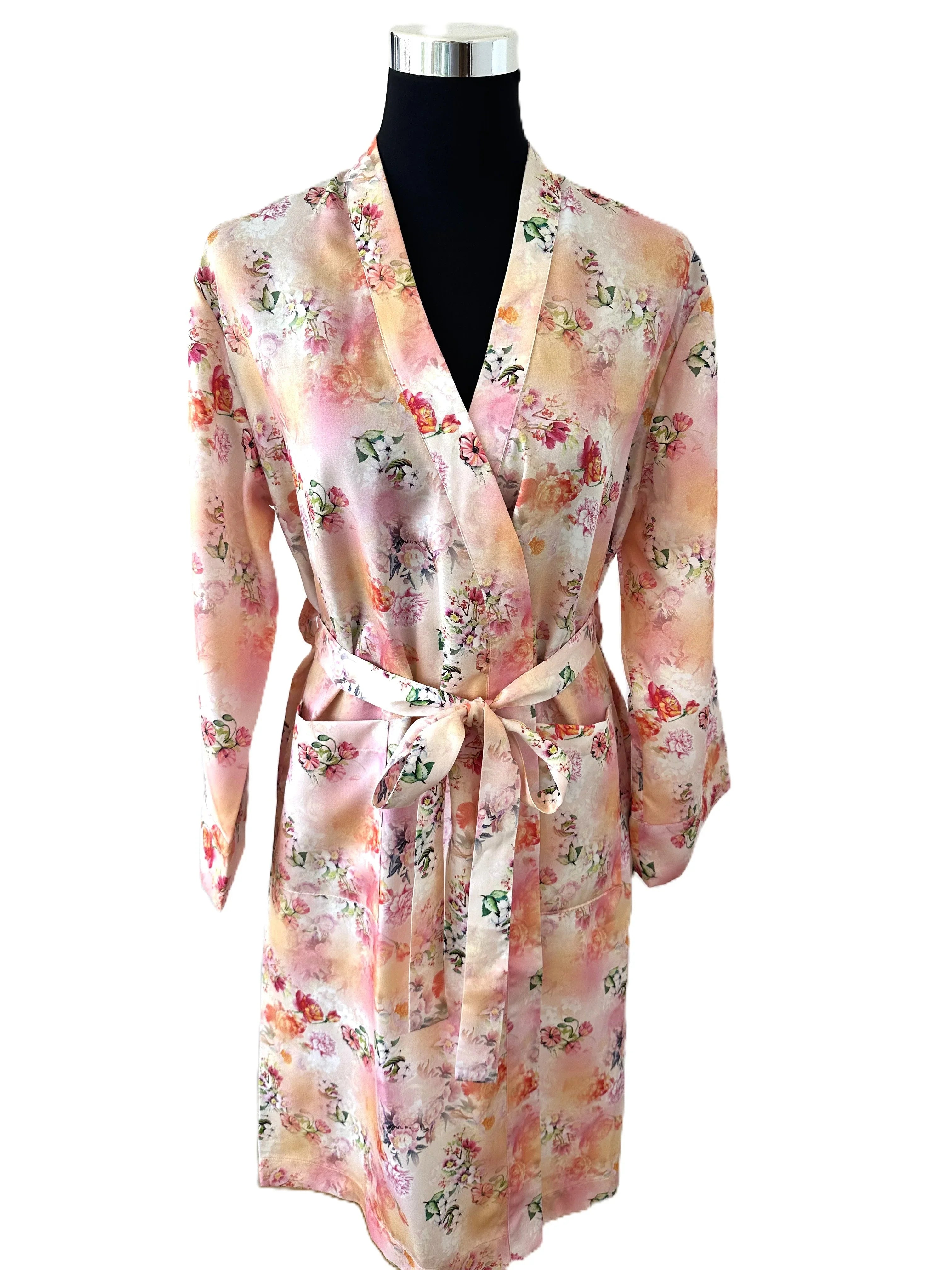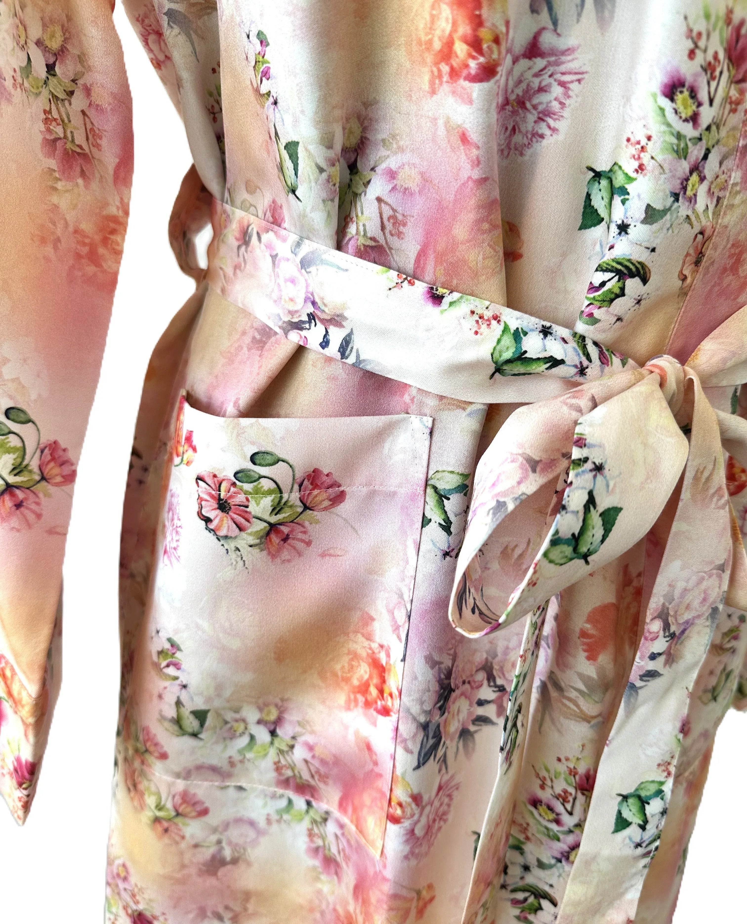 Der Kimono Monet Peach aus 100% LENZING™ Lyocell Satin vereint luxuriösen Schimmer mit nachhaltiger Verantwortung. Das atmungsaktive, feuchtigkeitsregulierende Material sorgt für ein angenehm kühles Tragegefühl und unvergleichlichen Komfort – perfekt für Haut und Umwelt.