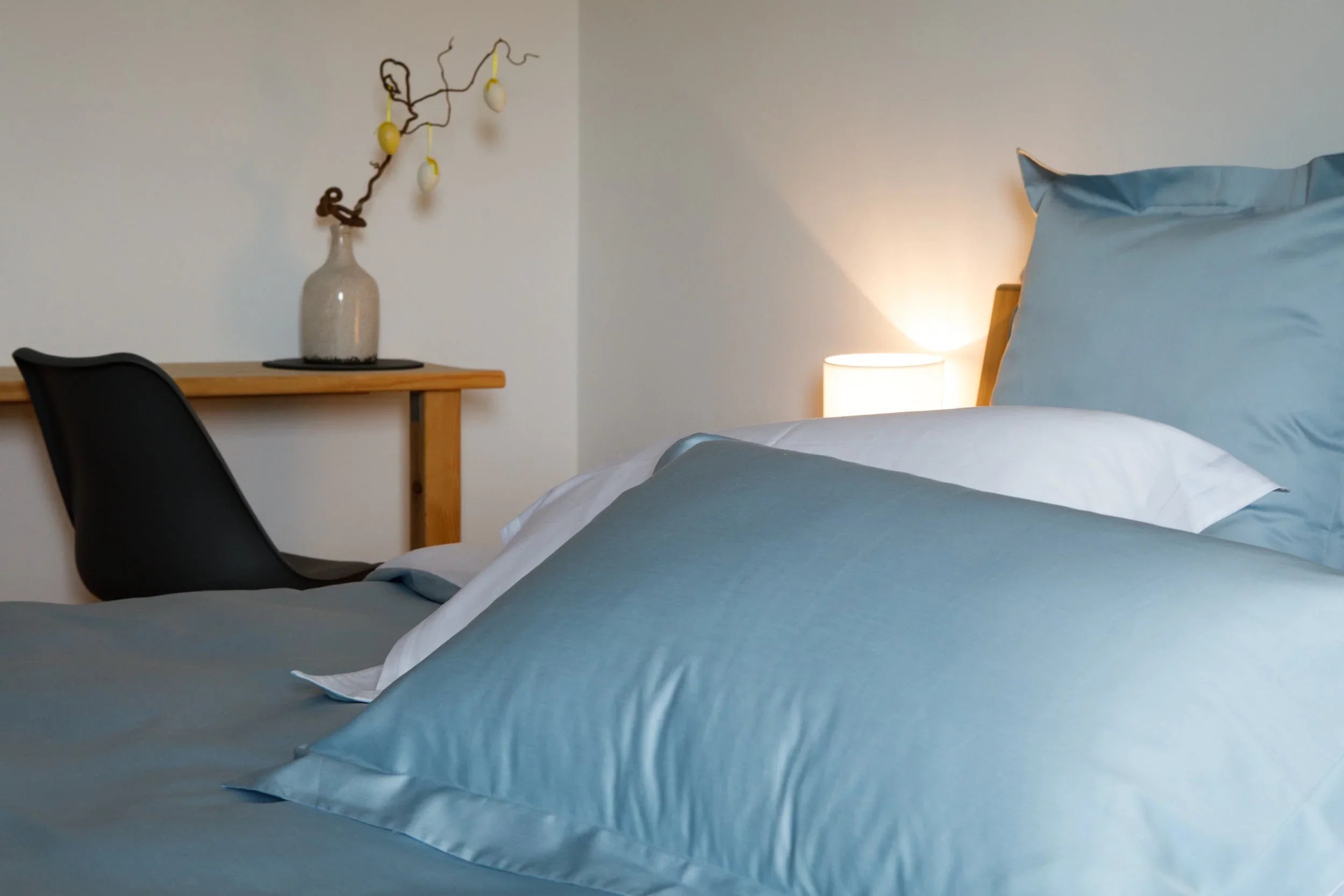 Das Kissenbezüge Set Twist blue & white vereint stilvolles Design mit höchster Qualität. Gefertigt aus 100% mercerisierter Mako-Baumwolle in Schweizer Satinbindung (300 TC), bietet es einen edlen Glanz und ein seidig-glattes Hautgefühl. Die Kombination aus klassischem Blau-Weiß und luxuriöser Textur schafft ein elegantes Ambiente im Schlafzimmer.