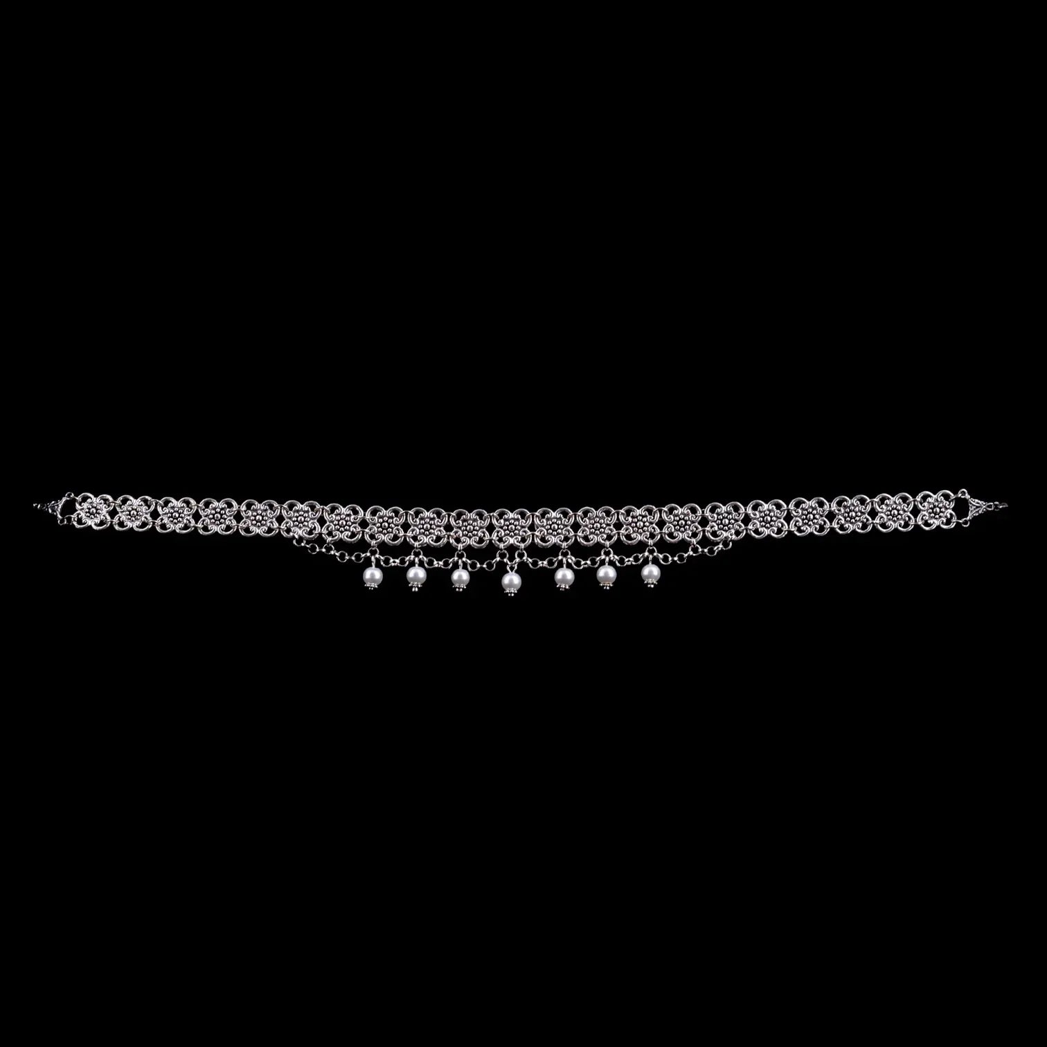Die Kette besteht aus Tibetsilber (Altsilberton) und ist mit kleinen weißen Perlen zwischen den Ornamenten verziert.