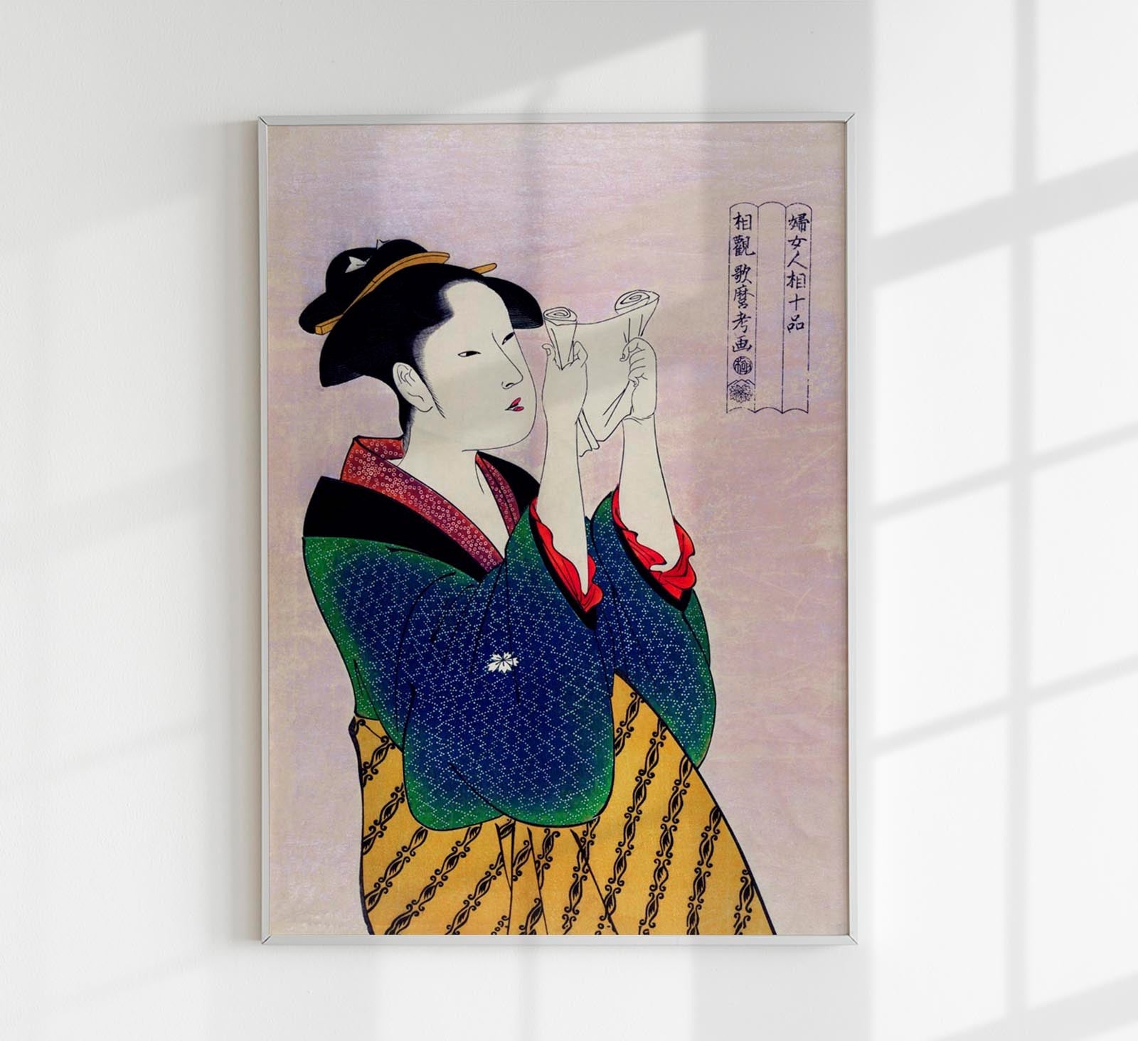 Geisha Fumi Yomu Onna by Kitagawa Utamaro verbindet die Zartheit klassischer Bijin-ga-Porträts mit professioneller Fine-Art- und Canvas-Qualität und schafft ein feines, kunsthistorisch geprägtes Statement für moderne Interieurs.