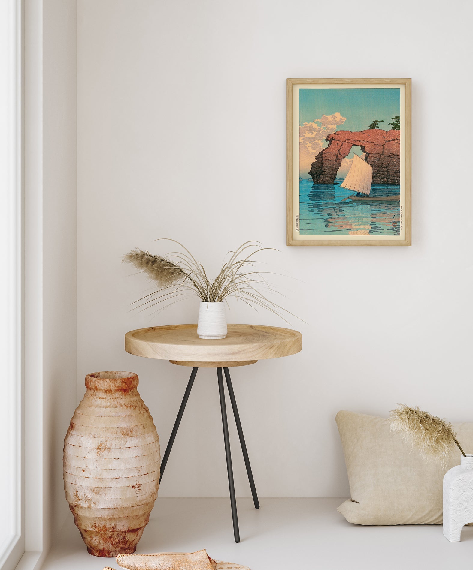 Das Zaimoku Island in Matsushima by Hasui bringt die zeitlose Schönheit traditioneller japanischer Holzschnitte in moderne Räume – ideal für Liebhaber fernöstlicher Ästhetik.