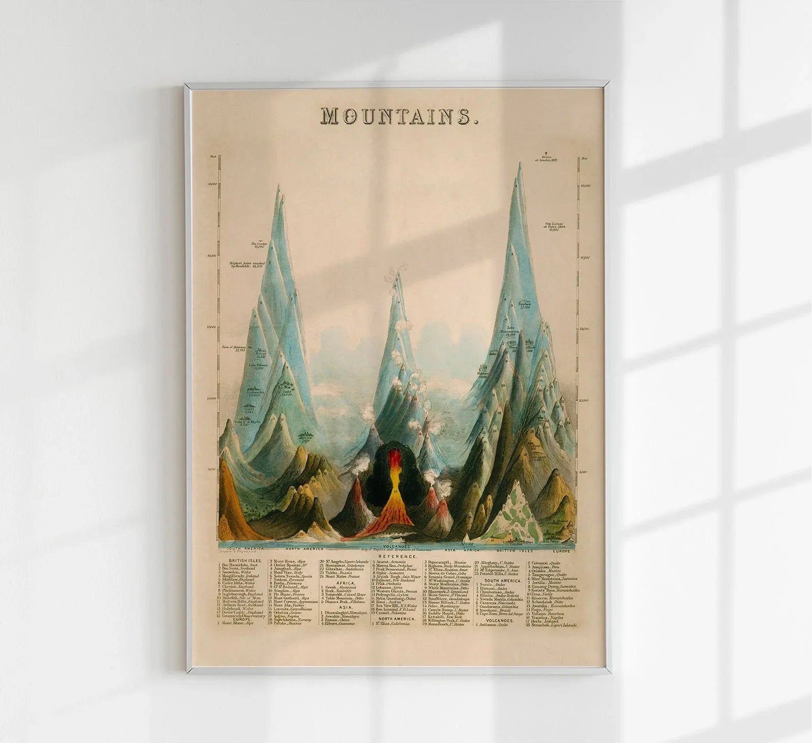 Die Vintage Educational Chart of Mountains ist ein eindrucksvolles Lehrposter im Retro-Stil, das die größten Gebirge der Welt visuell vergleichbar macht.