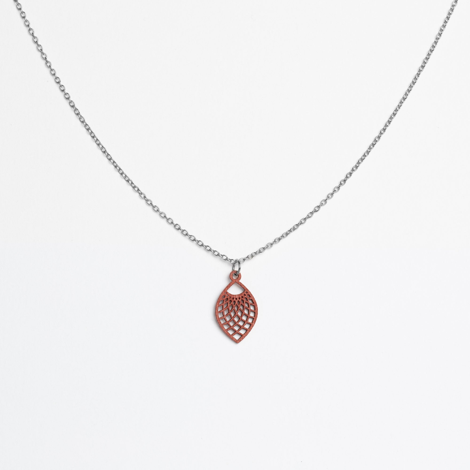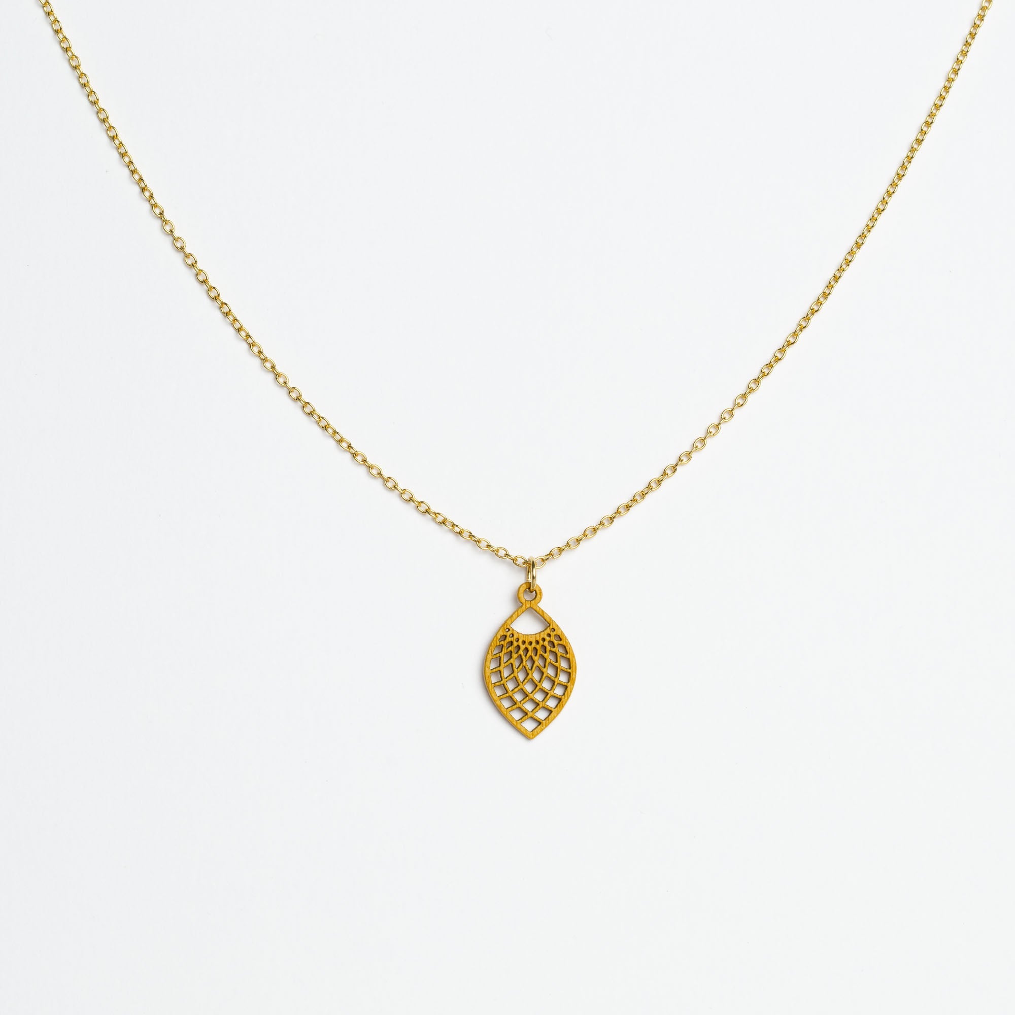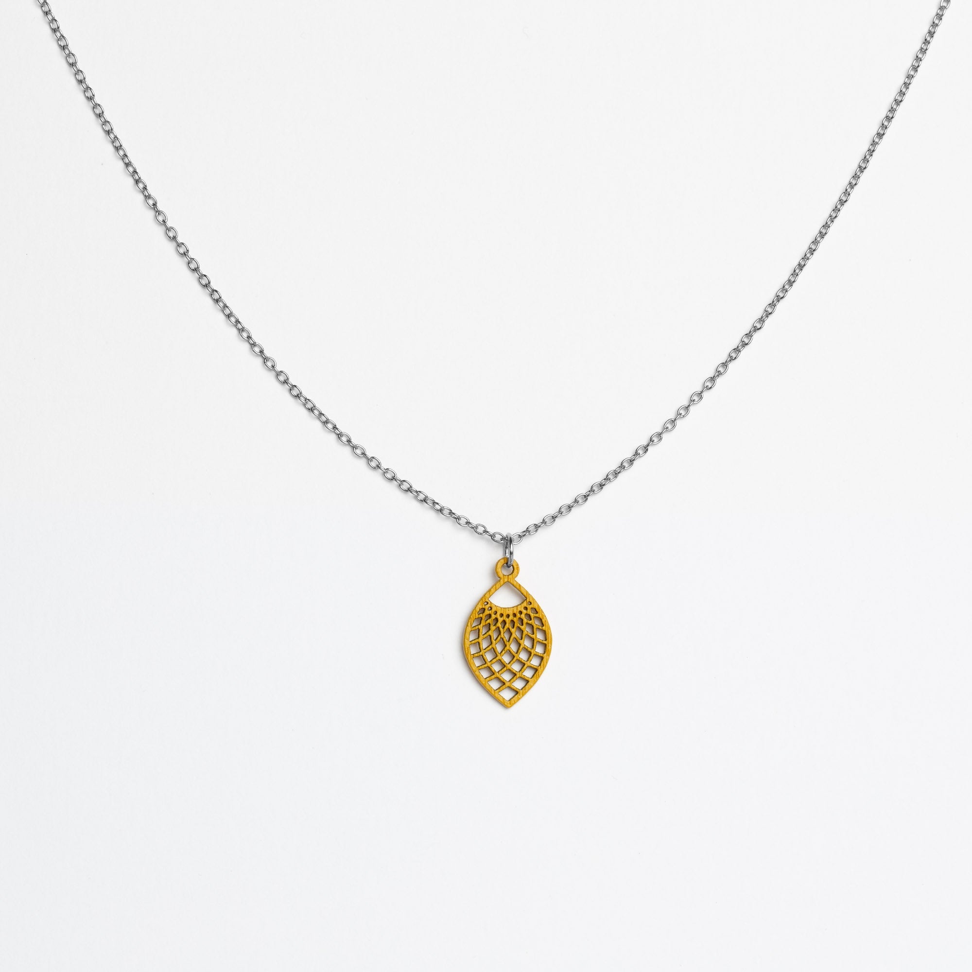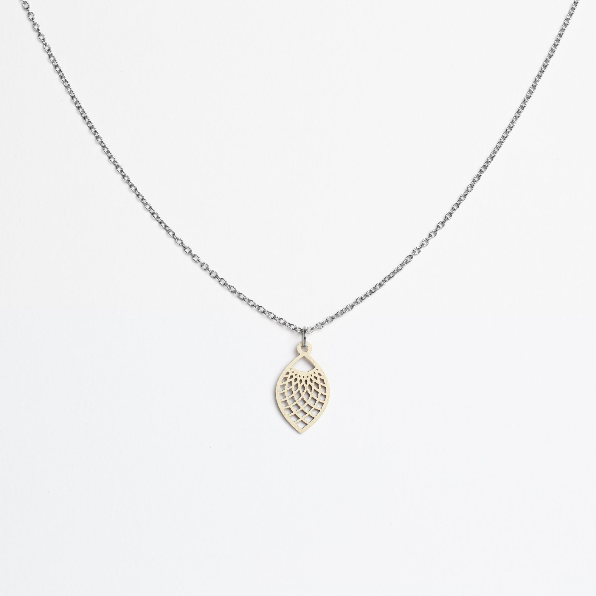 Maße Holzanhänger: 13 mm Breite × 22 mm Höhe × 1 mm Dicke. Kettenlänge: 45 cm – die beliebte Allround-Länge, die in der Regel am Schlüsselbein liegt und vielseitig kombinierbar ist.