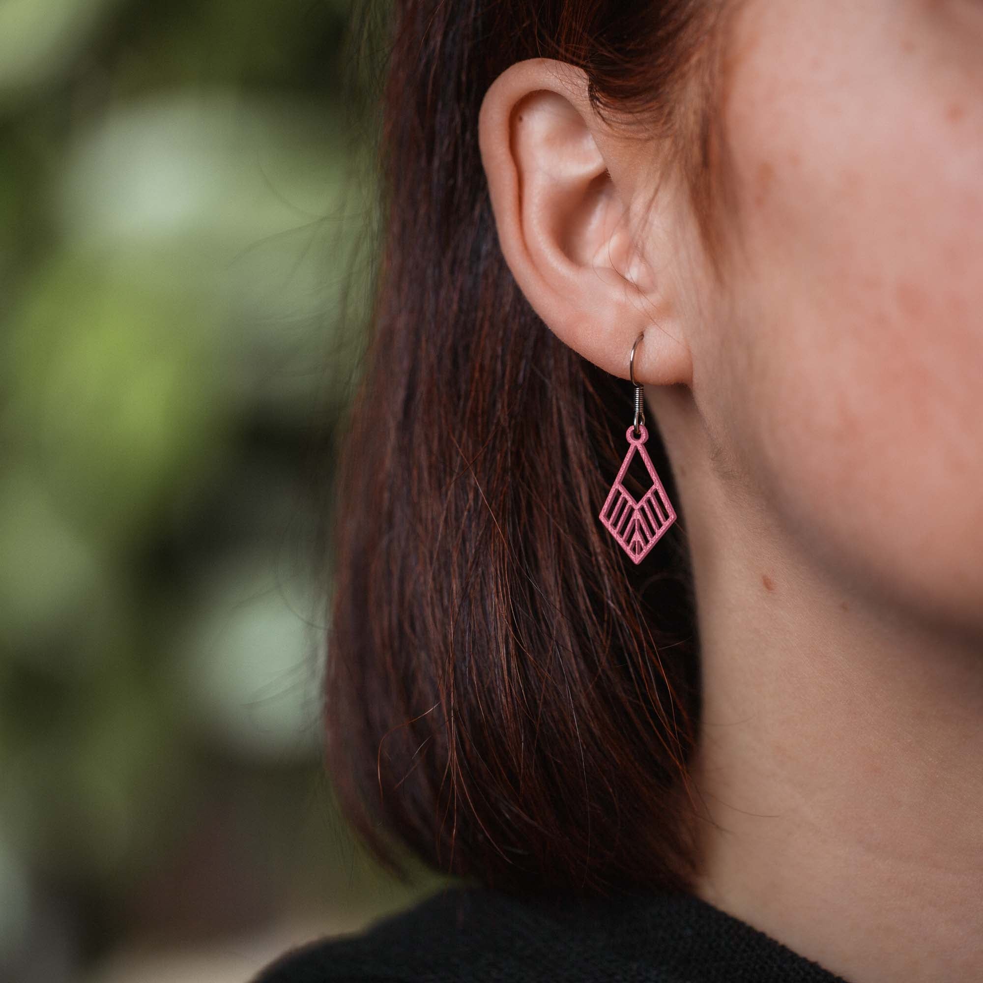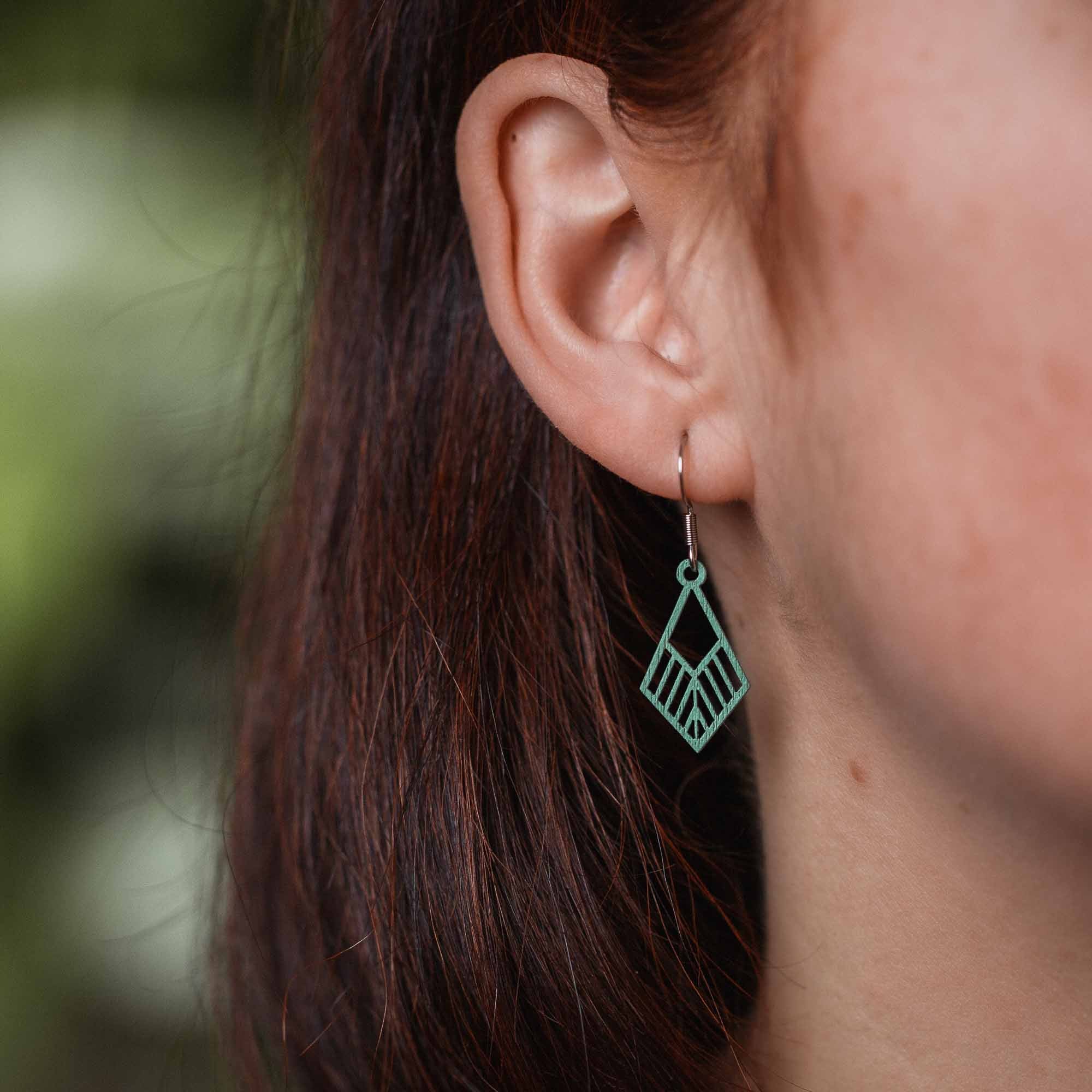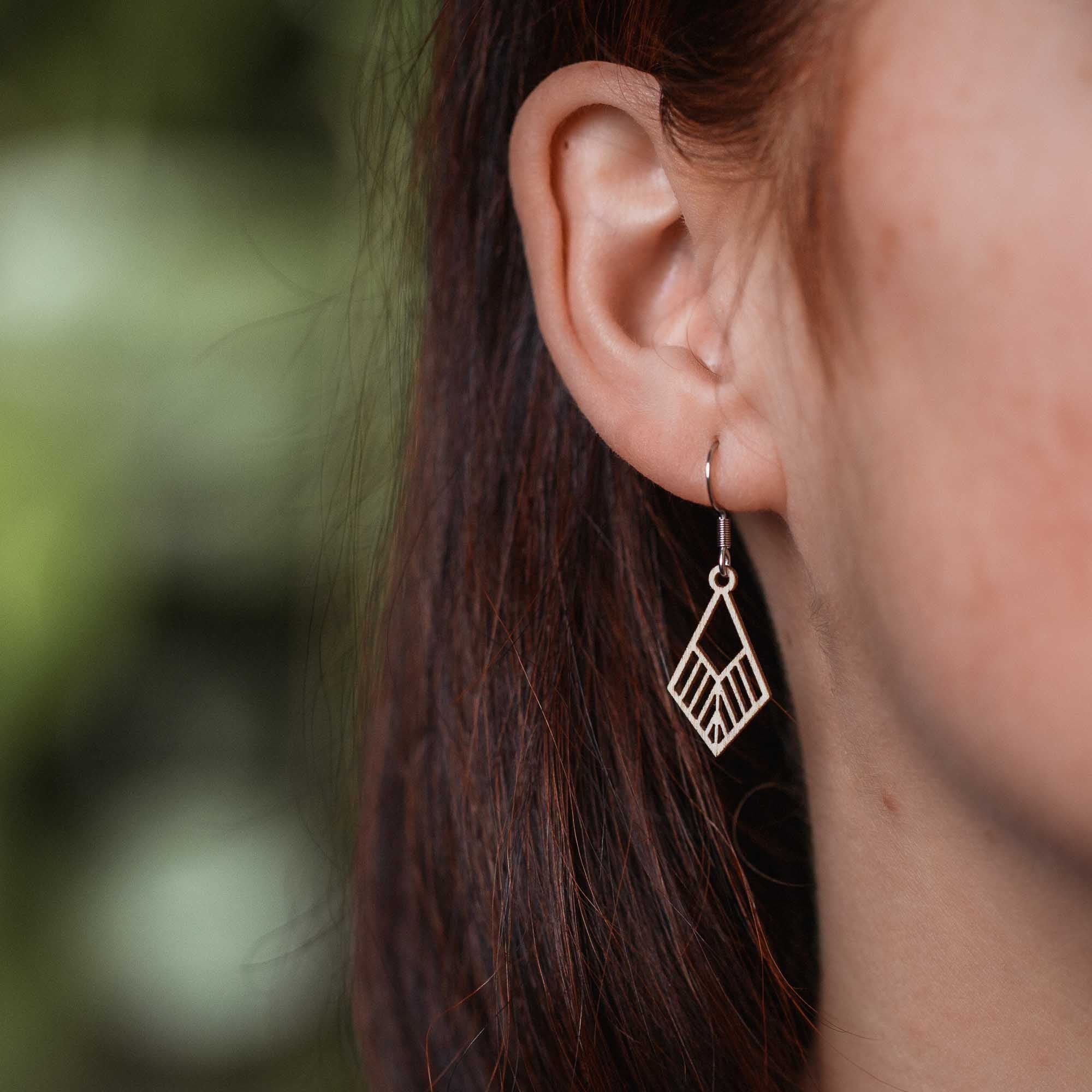 Für empfindliche Ohren: antiallergene Edelstahlstecker in Silber, Gold oder Rosé-Gold, kombiniert mit präzise gefrästen Holzanhängern in sechs Farben für deinen individuellen Stil.