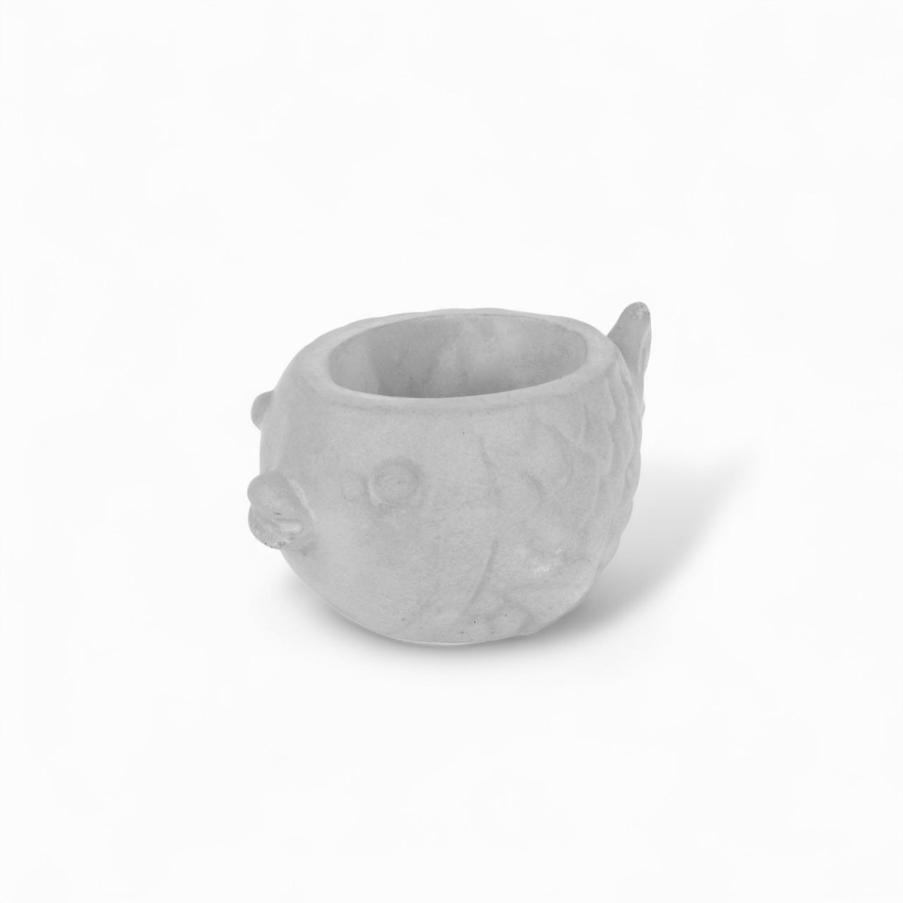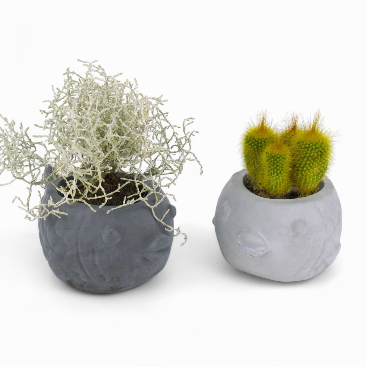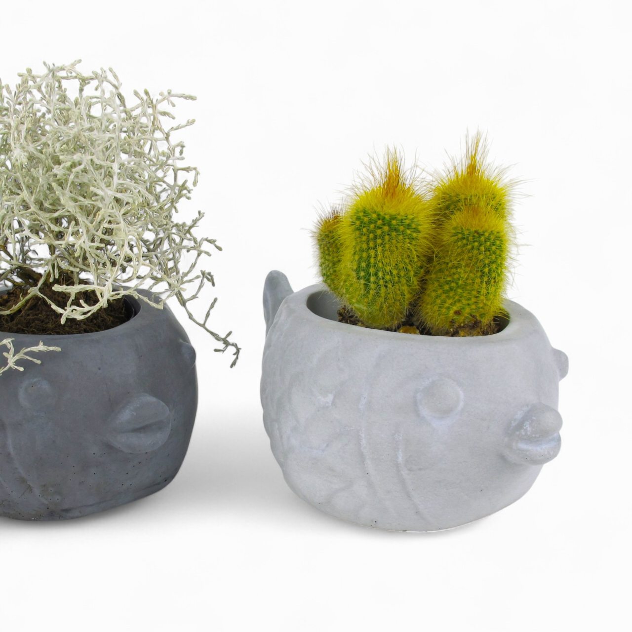 Der Uvis Kugelfisch kann als Pflanzgefäß für kleine Sukkulenten, Kakteen oder Trockenpflanzen genutzt werden – oder als eigenständige Betonfigur, die jedem Raum Persönlichkeit verleiht.