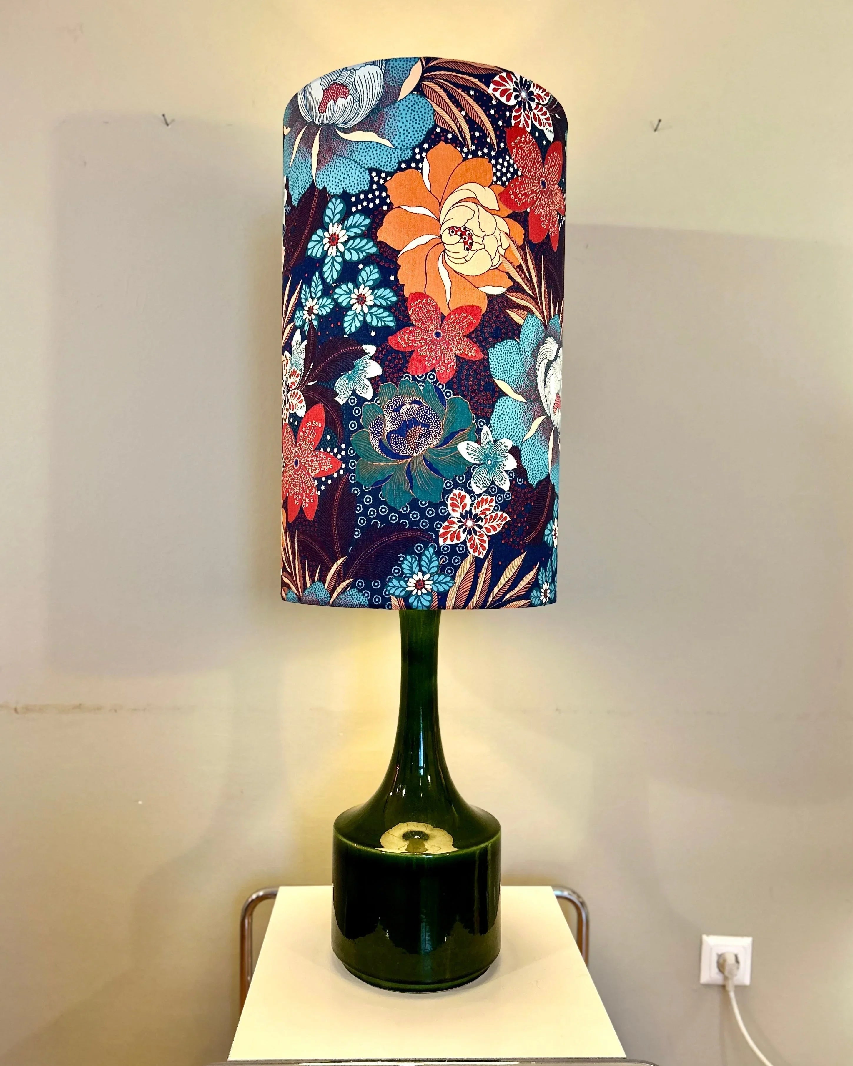 Mit neu überholter Elektrik und einem passenden grünen Stoffkabel verbindet sie Ästhetik mit moderner Funktionalität. Der farblich abgestimmte Trommelschirm aus Halb-Panama-Stoff entfaltet im eingeschalteten Zustand ein lebendiges Blumenmuster – stimmungsvoll und einzigartig zugleich.