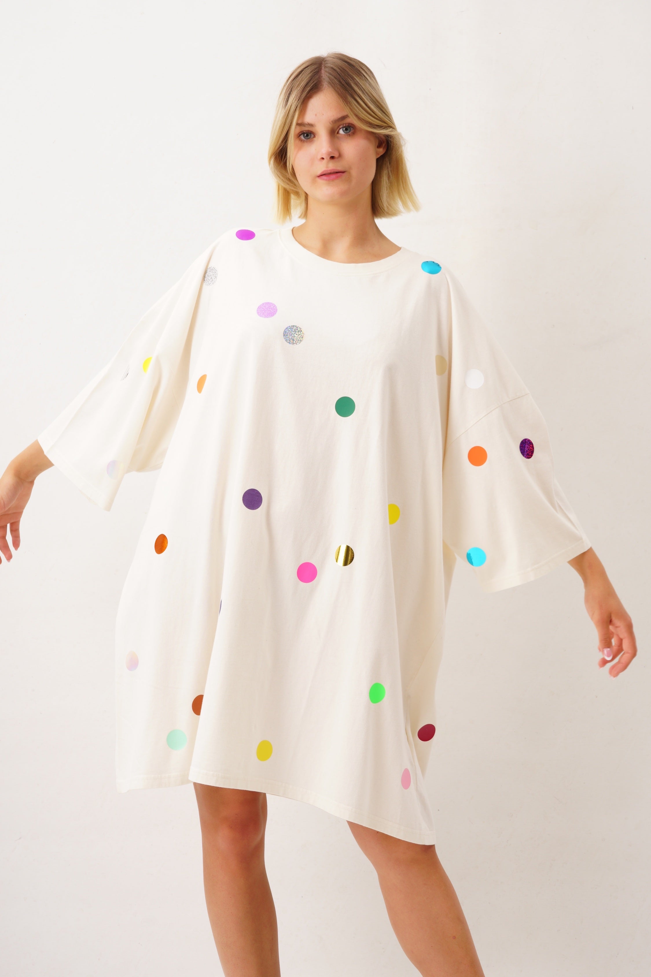 Schonend bei 30 °C auf links waschen, nicht über die Punkte bügeln und liegend trocknen. Als Kleid mit Boots oder über Leggings getragen, entfaltet das Bigshirt seine ganze Wirkung. Auch im Club oder bei Festivals zieht der reflektierende Glanz alle Blicke auf sich.