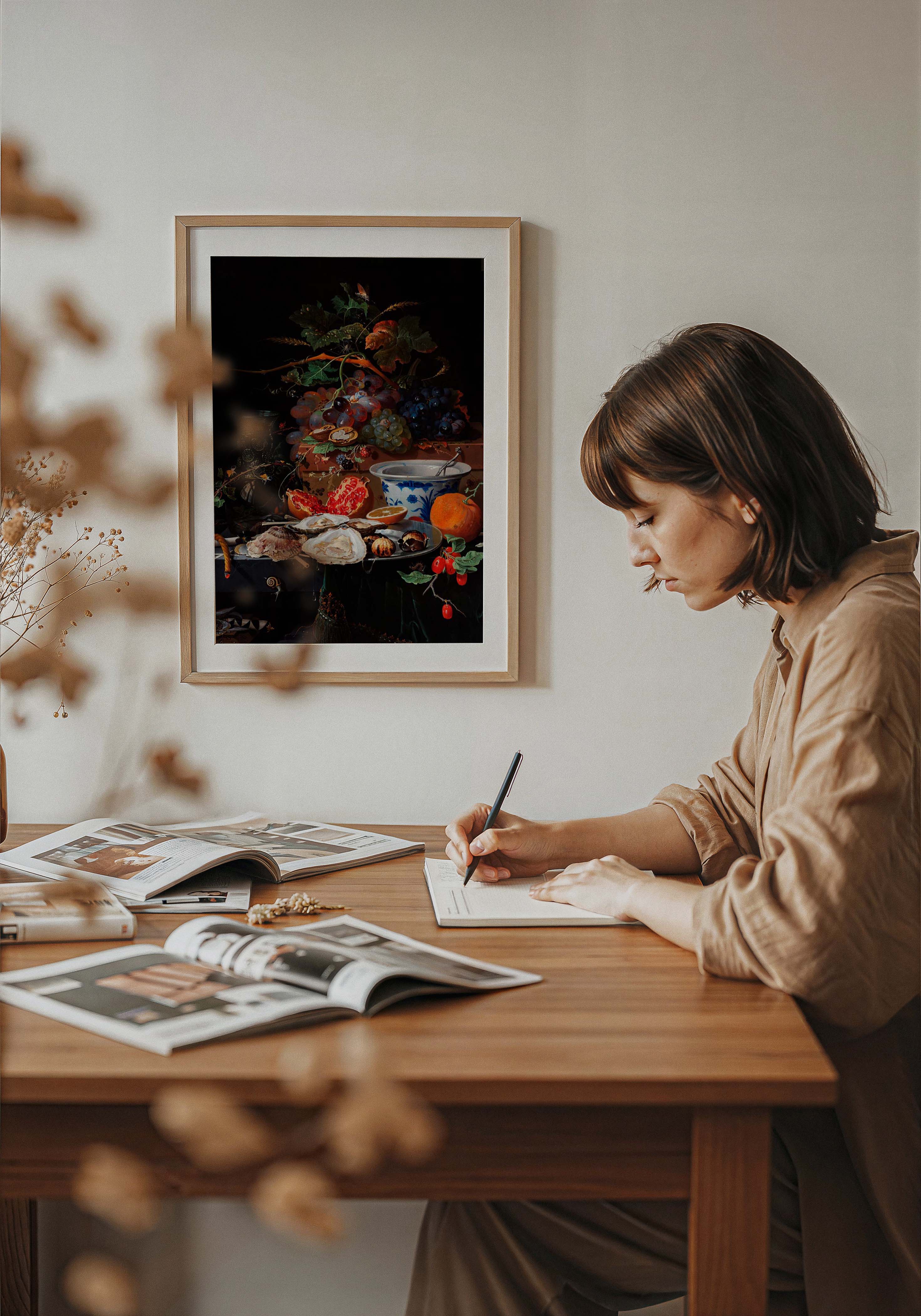Die Kombination aus samtig-mattem Fine Art Papier mit hoher Grammatur und archivtauglichen Pigmenttinten sorgt für eine differenzierte Wiedergabe der dunklen Bildpartien, der leuchtenden Farbakzente und der feinen Texturen von Schale, Glas und Früchten. Optional betont eine fein strukturierte Canvas-Oberfläche den gemäldeartigen Charakter des Stilllebens und lässt das Motiv noch objekthafter im Raum erscheinen. Oberflächen-/Bediengefühl: blendfrei, angenehm glatt-griffig – ideal für gerahmte Hängungen in Dining-Spaces, Salons oder Küchen mit bewusster Lichtinszenierung.
