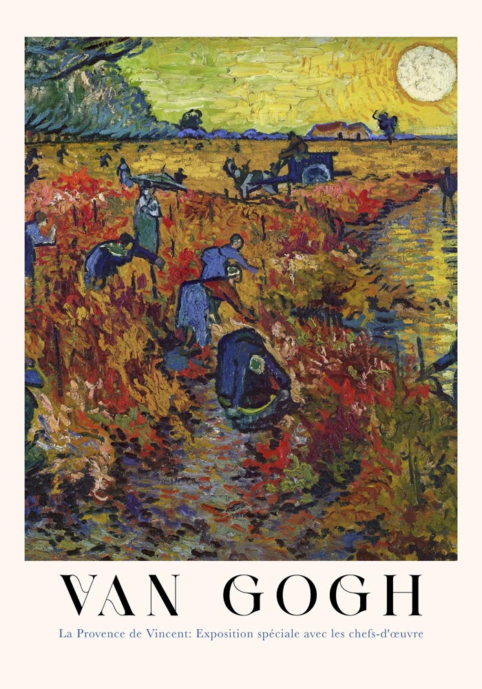 Das The Red Vineyard Exhibition Art Poster by Van Gogh zeigt eine Reproduktion des Gemäldes „The Red Vineyard“, in dem ein herbstlicher Weinberg in intensiven Rot- und Goldtönen und arbeitende Figuren vor einem leuchtenden Himmel inszeniert werden.