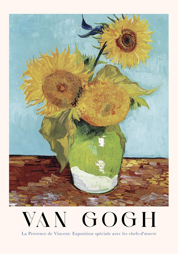 Das Vase with Three Sunflowers Art Poster by Van Gogh zeigt ein reduziertes, kraftvolles Stillleben mit drei Sonnenblumen – ein Werk voller Bewegung, Struktur und emotionaler Farbgebung.