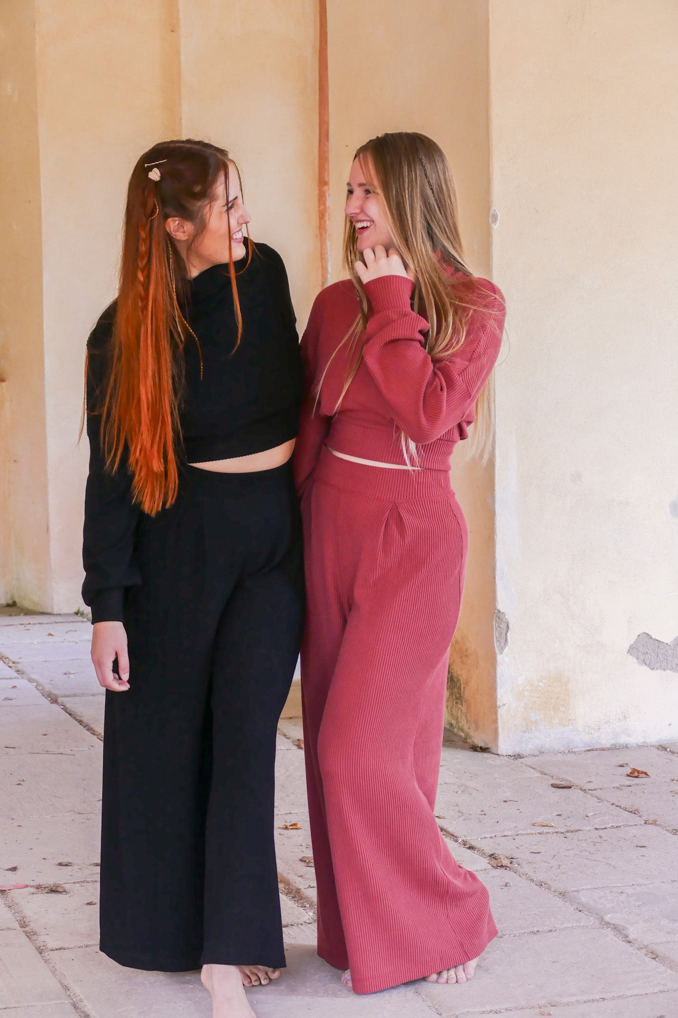 Der hochwertige Stoff sorgt für ein angenehmes Hautgefühl. Der weite Beinschnitt und der hohe Bund bieten Wärme und Bewegungsfreiheit, während Abnäher und Kellerfalten der Hose eine feminine Note verleihen. Oberflächen-/Bediengefühl: weich, anschmiegsam & komfortabel – ideal für Alltag, Freizeit oder entspannte Stunden zuhause.