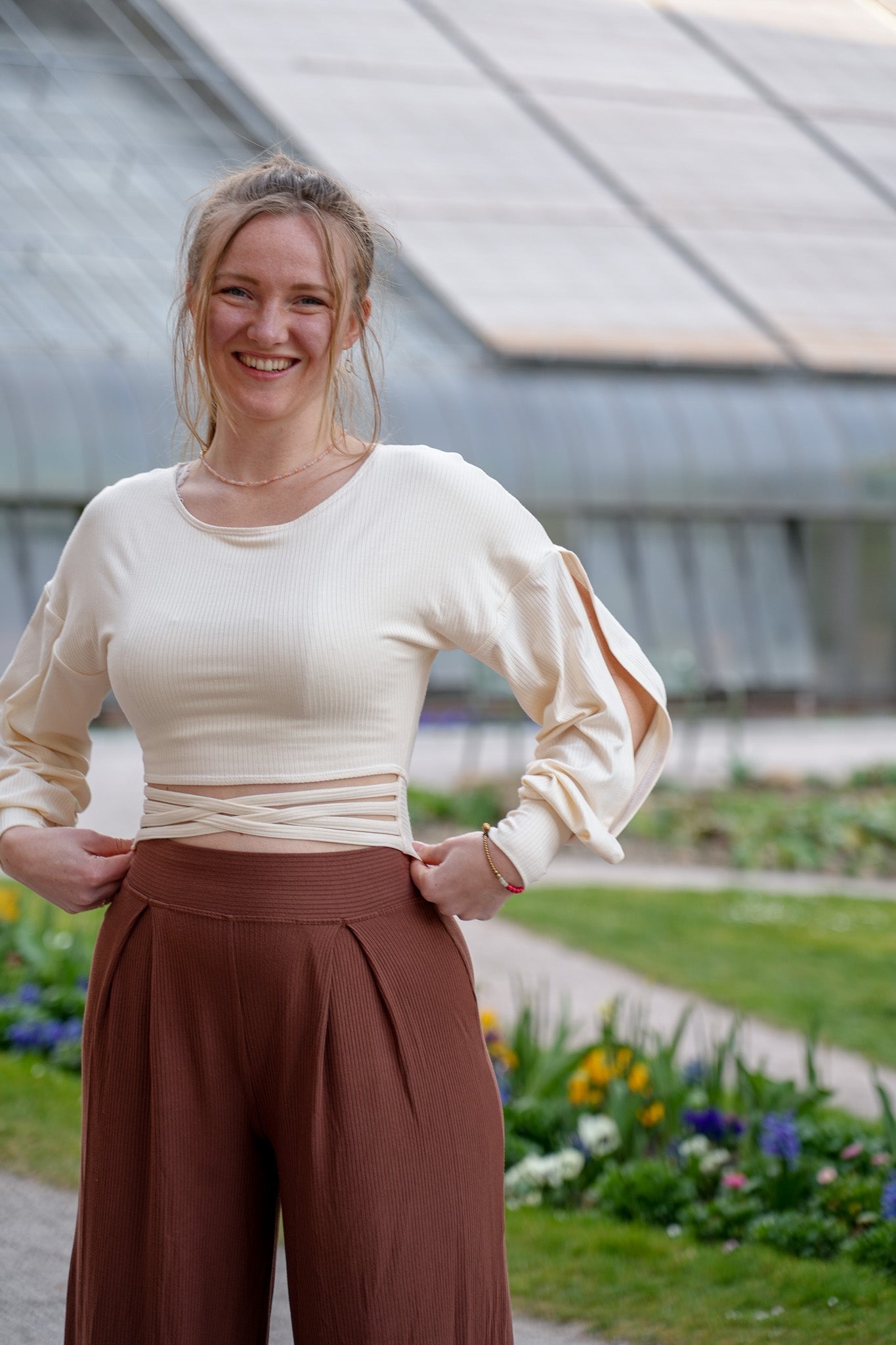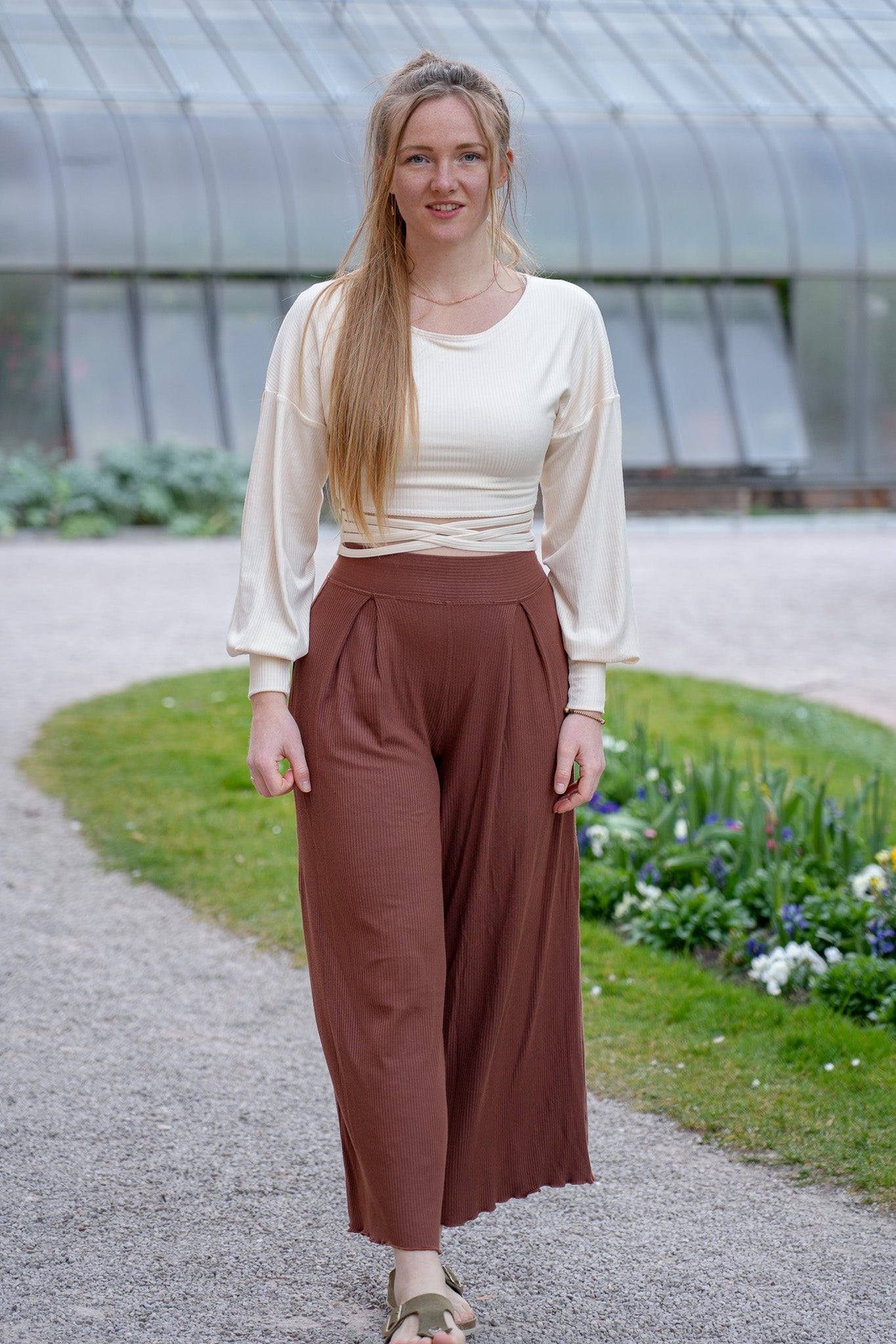 Die Farrah Comfy Pants Pecan Brown vereinen nachhaltigen Tencel™, femininen Rüschensaum und fließende Eleganz für vielseitige, stilvolle Looks.