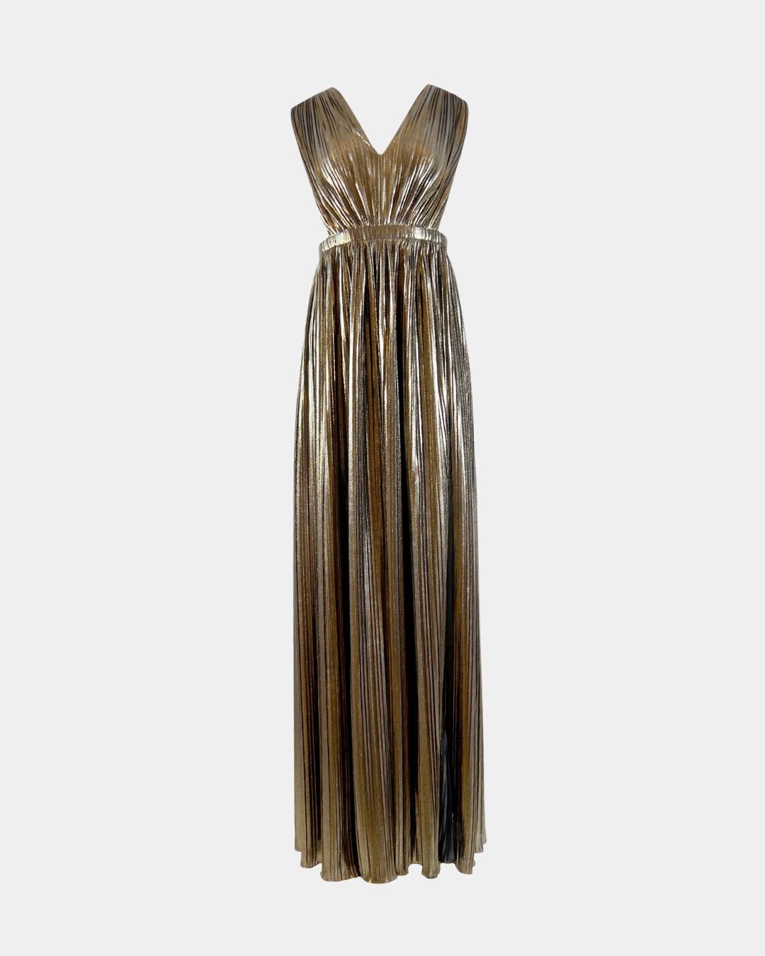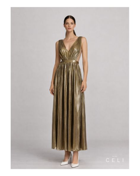 Der taillierte Schnitt geht fließend in eine lange, plissierte Rockpartie über. Ein tiefer V-Ausschnitt vorne und hinten betont die feminine Linie, während das ärmellose Design dem Kleid Leichtigkeit und architektonische Klarheit verleiht.