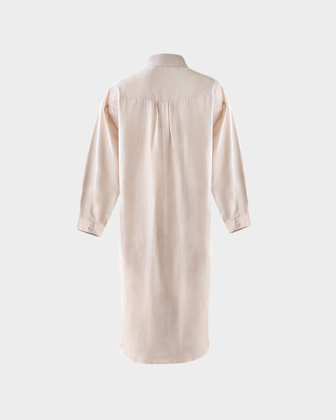 Der gerade, fließende Schnitt wird durch einen klassischen Hemdkragen und eine durchgehende Knopfleiste mit Perlmuttknöpfen ergänzt. Seitliche Schlitze, eine Rückenfalte sowie lange Ärmel mit einfacher Manschette betonen die architektonische Präzision des Designs.