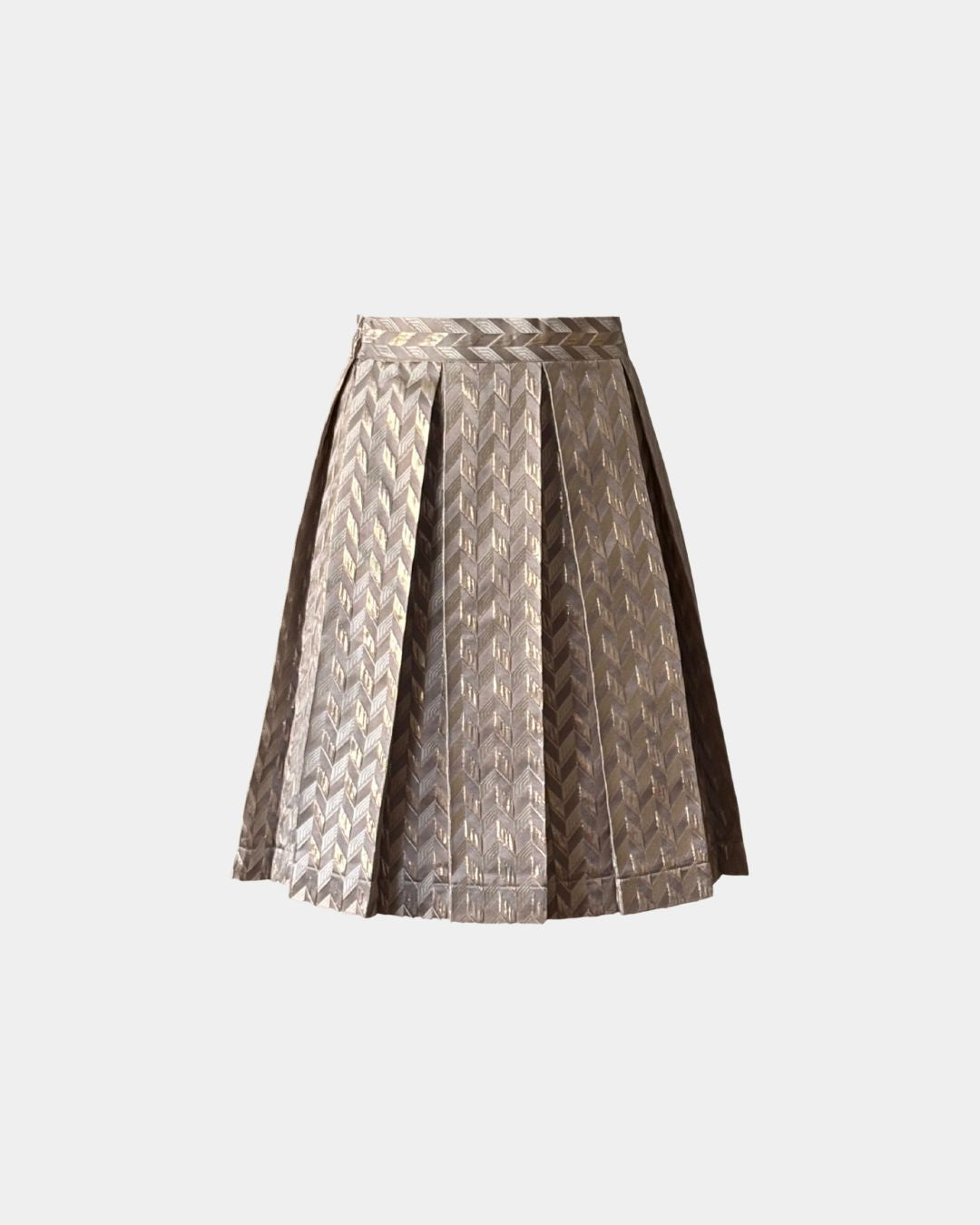 The chevron pattern in gold tones adds structure and modernity to the skirt. The subtle metallic shimmer makes it eye-catching without being overpowering.