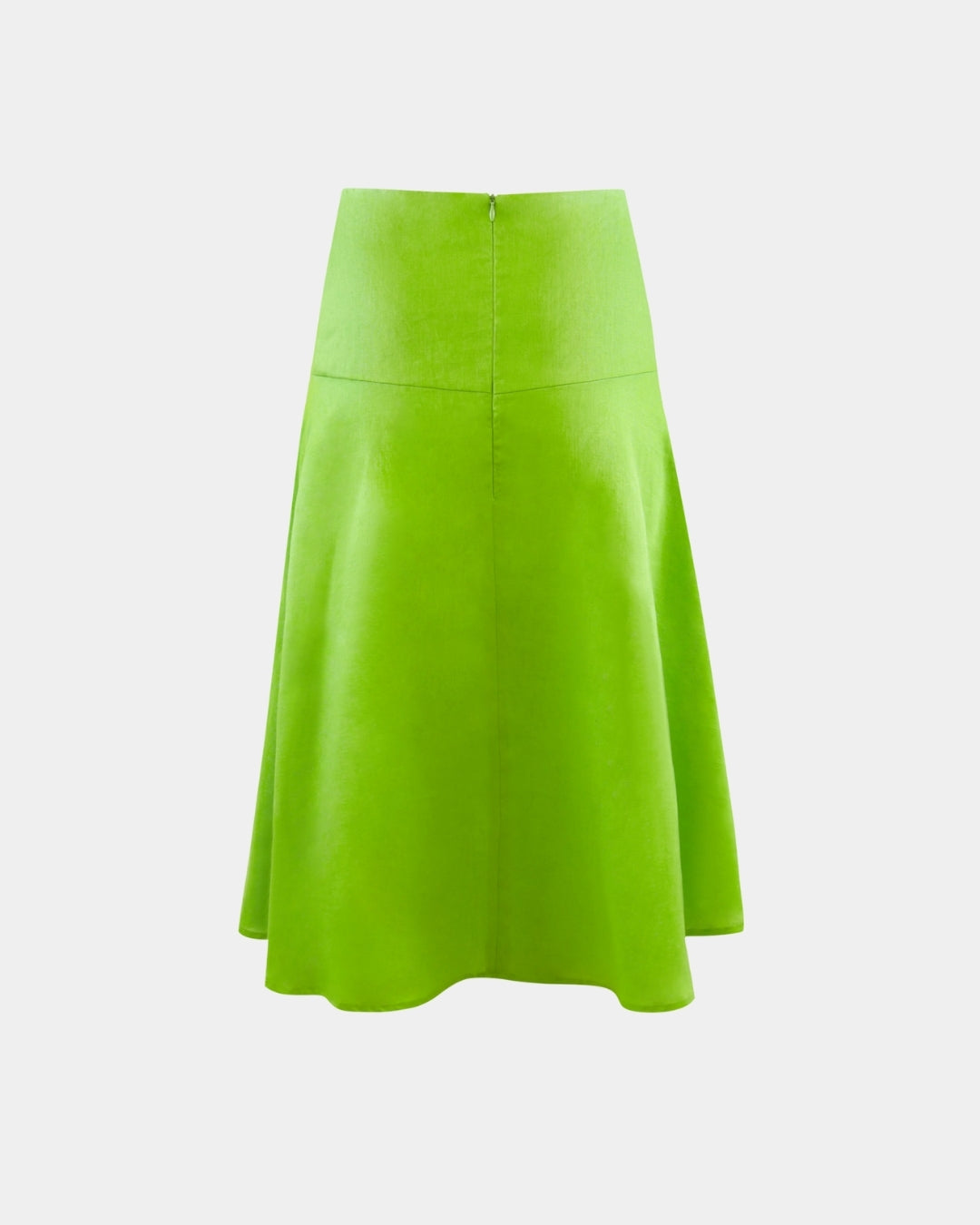 Der Rock ist hoch geschnitten und verfügt über einen glatten, breiten Bund, der die Taille betont. Die dezente A-Linie sorgt für eine fließende, elegante Silhouette. Auf der Rückseite setzen vertikale Nahtdetails feine, maßgeschneiderte Akzente.