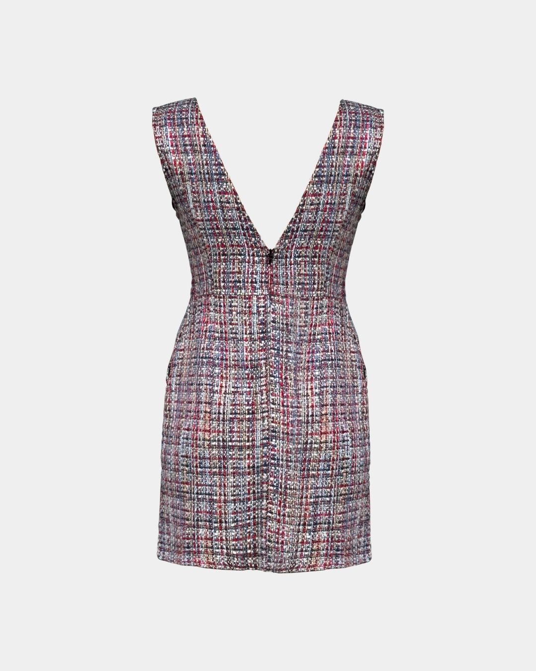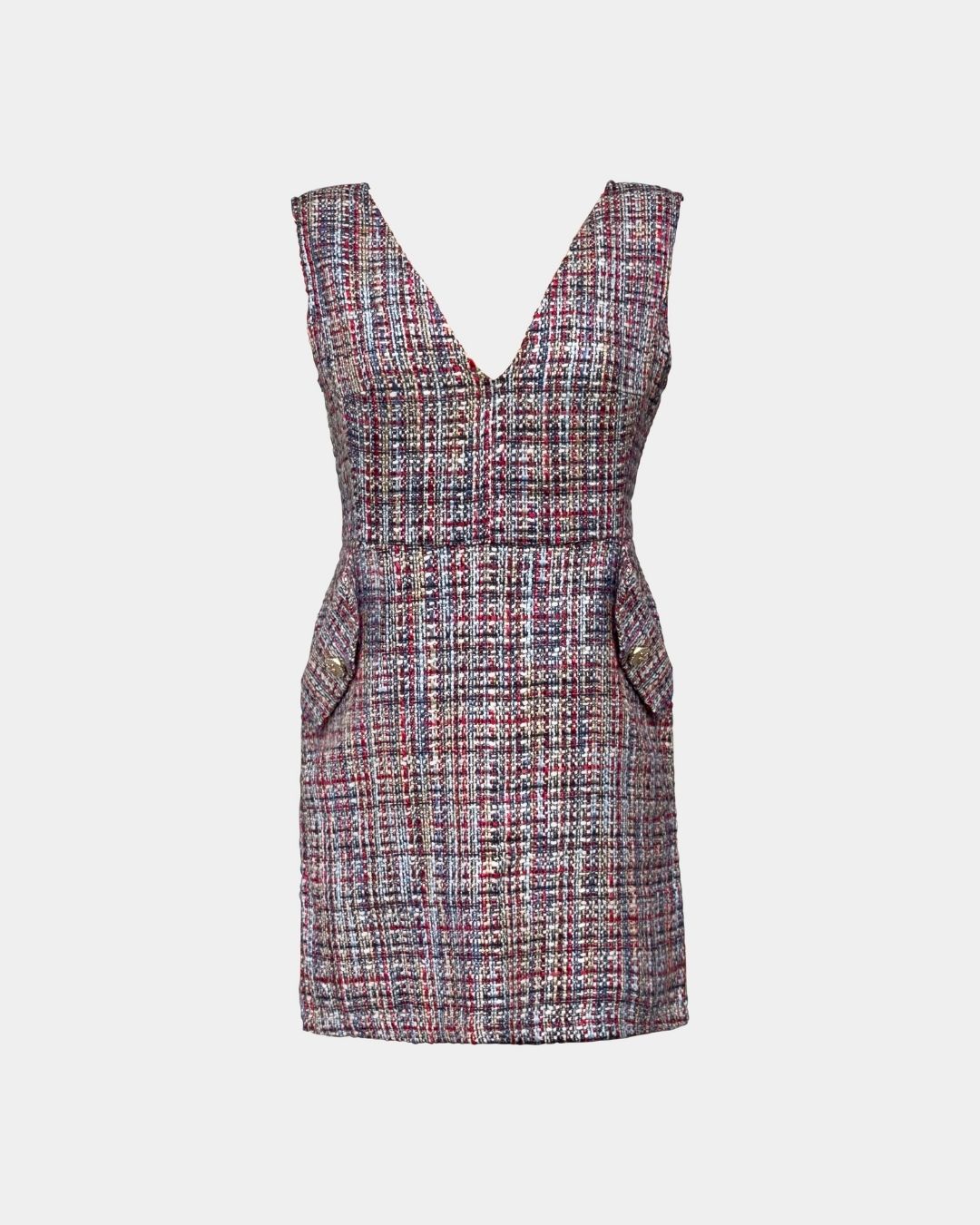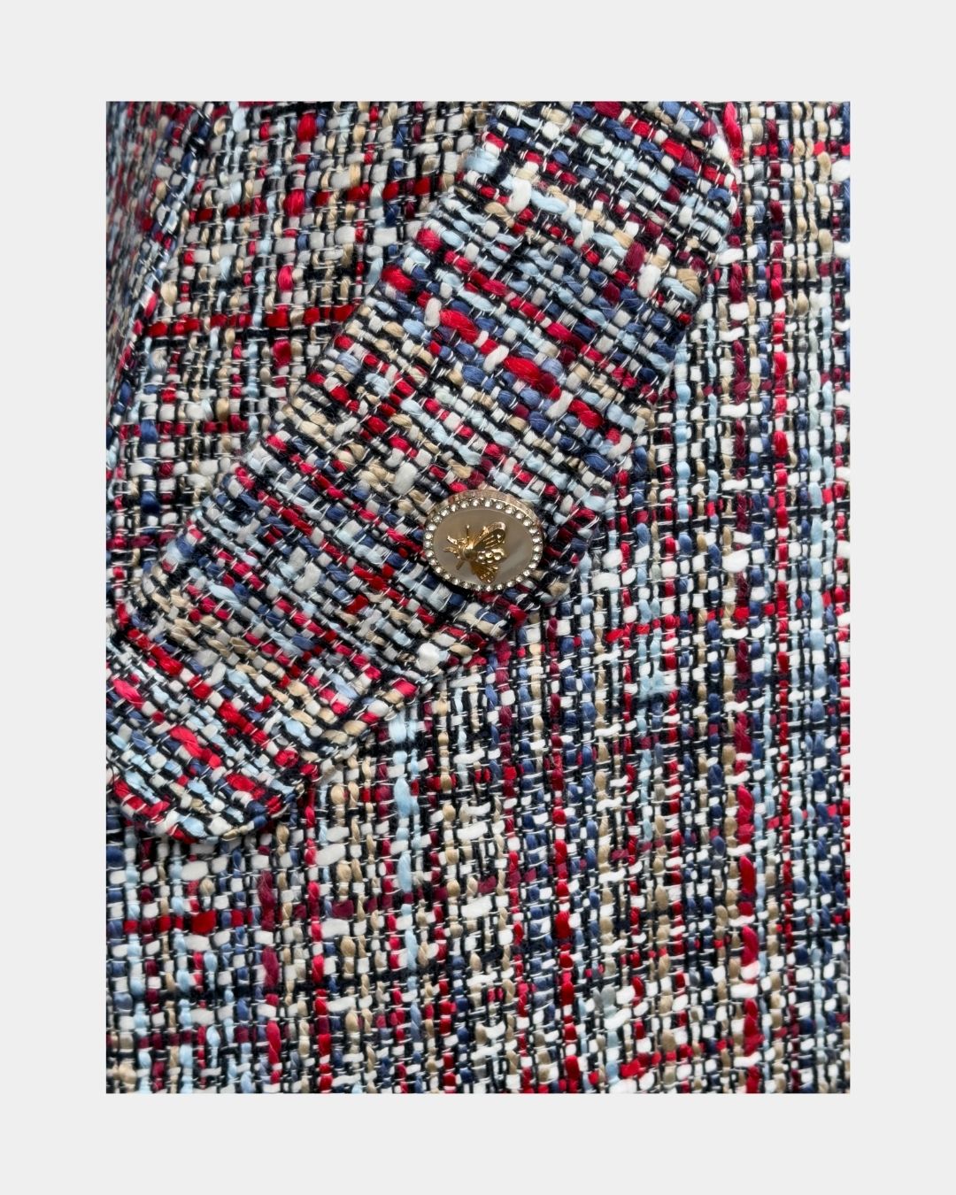 Der mehrfarbige Bouclé-Tweed wirkt plastisch und lebendig, ohne laut zu sein. Ein tiefer V-Ausschnitt und ein leicht taillierter, gerader Schnitt bringen Ruhe und Präzision in den Look, während Pattentaschen mit Metallknöpfen couture-inspirierte Akzente setzen. Das satinierte Futter aus recyceltem Polyester sorgt für angenehme Bewegungsfreiheit.