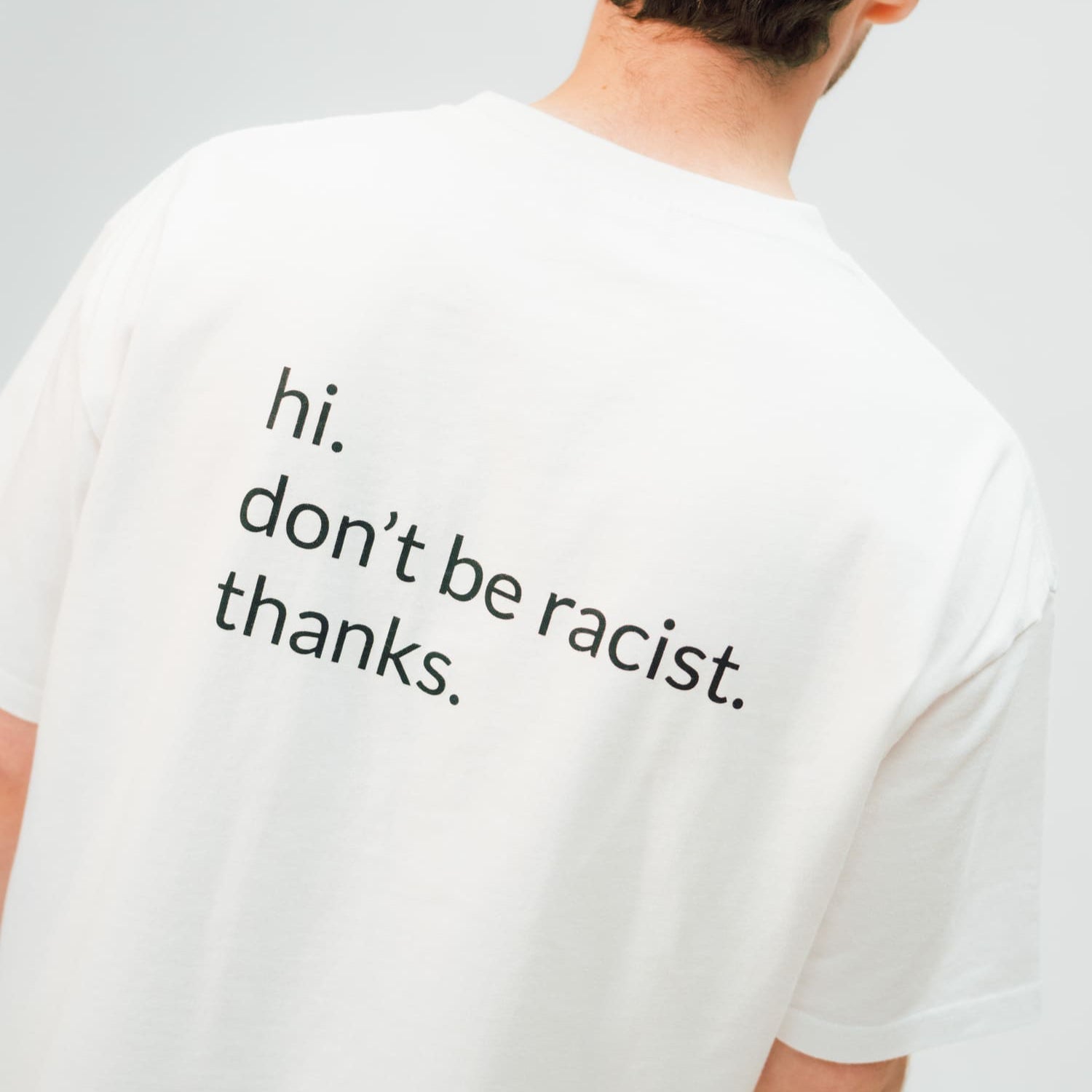 The white oversized T-shirt with the "Don't Be Racist" print is simple yet says it all. It brings attitude to your everyday life and can be styled in a variety of ways—whether casually with jeans or as a contrast under a sleek blazer. Show that fashion can do more than just look good.