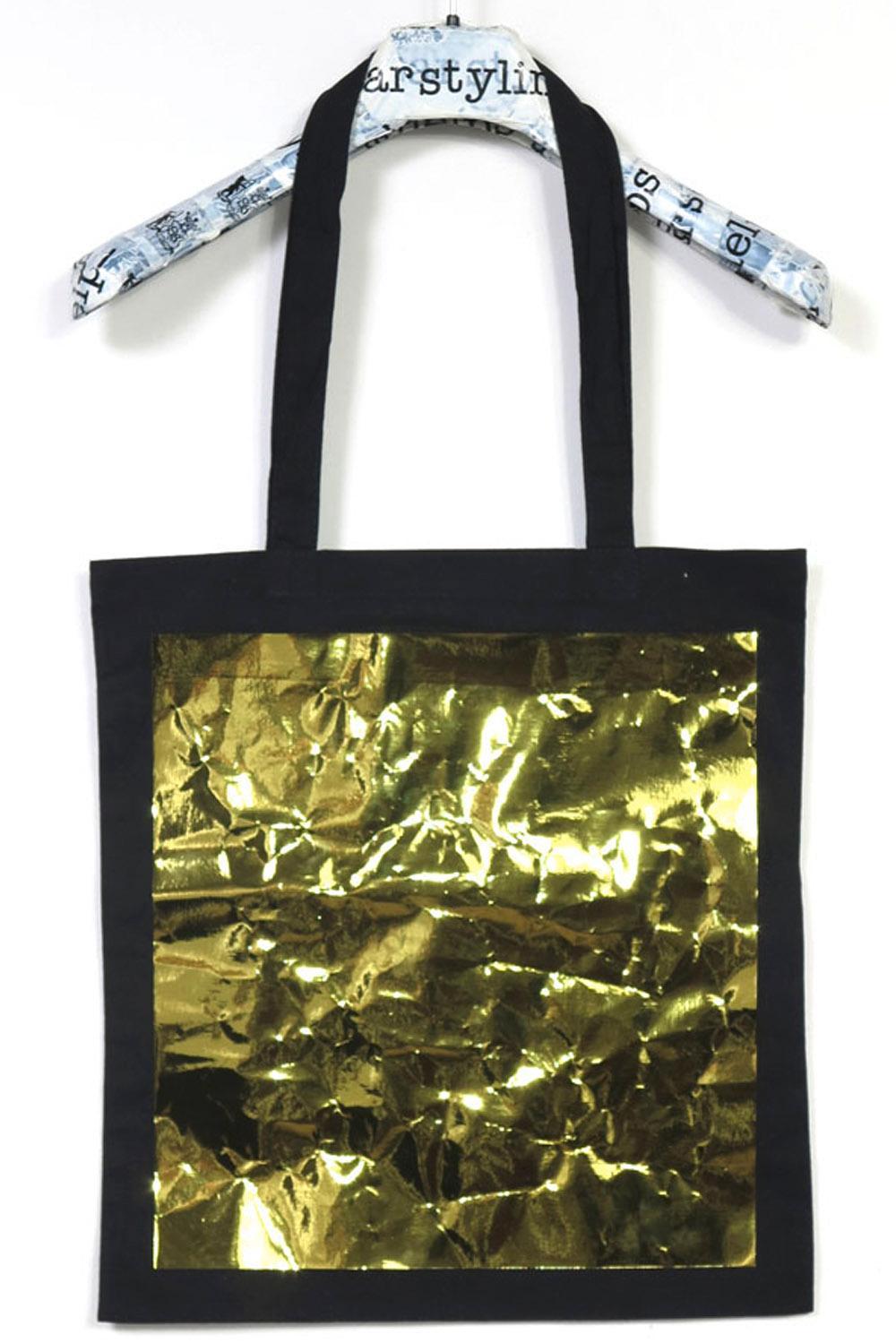 Die Kombination aus robuster Baumwoll-Tote und großer Metallic-Folie mit vorgeknittertem Effekt sorgt für eine strapazierfähige Tasche mit spannend schimmernder Oberfläche. Oberflächen-/Tragegefühl: griffiger Baumwollstoff mit strukturierter, metallischer Folienfläche – das Quadrat ist bewusst so gestaltet, dass es mit jeder Nutzung mehr Charakter entwickelt.