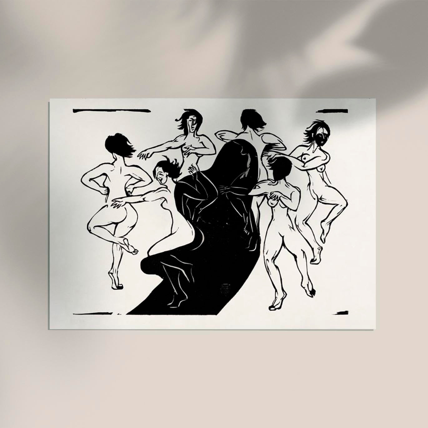 Das Nudes Dancing Around a Shadow Poster zeigt Ernst Kirchners expressionistischen Holzschnitt von 1936, der in Schwarz-Weiß auf Japanpapier gedruckt wurde. Die kraftvolle Darstellung nackter Figuren fängt Bewegung und Spannung ein, während starke Kontraste das Spiel von Licht und Schatten betonen.