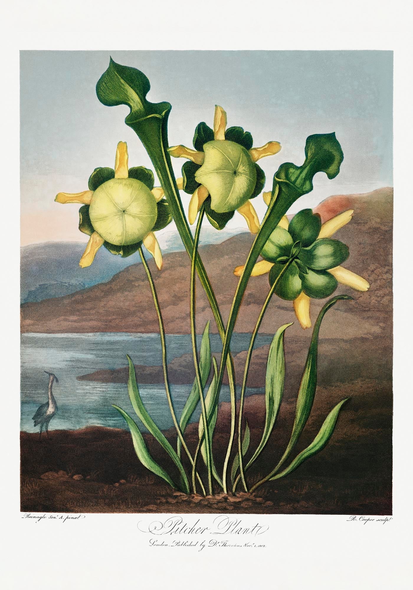 Diese Reproduktion setzt die charakteristische Kannenpflanze in Szene und bewahrt den charaktervollen Vintage-Charme des Originals, während feine Linien, Tonwerte und die stimmungsvolle Landschaft in moderner Fine-Art-Qualität hervortreten.