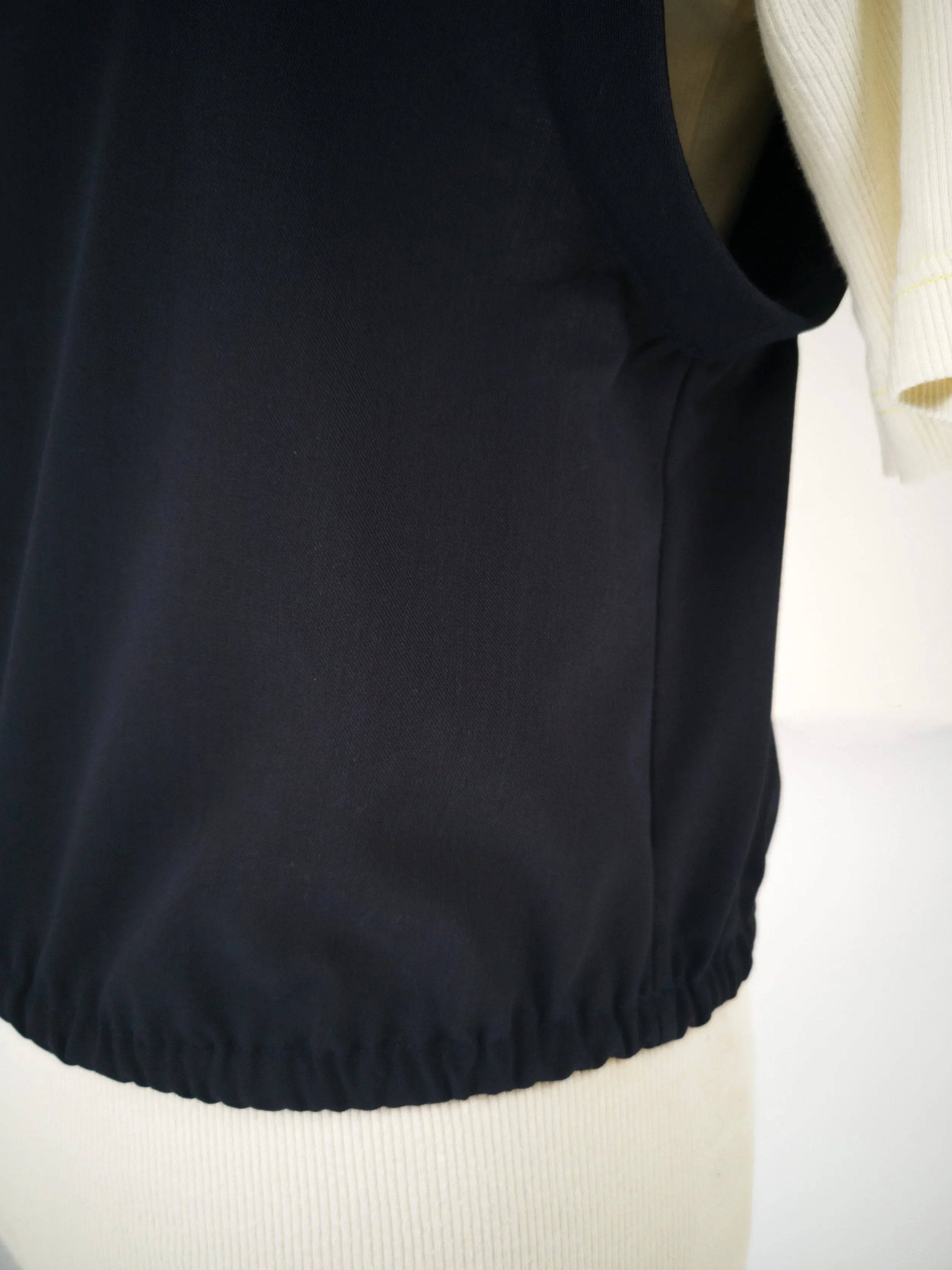 A deep armhole creates room for layering, while the narrow elastic cuff precisely completes the look.